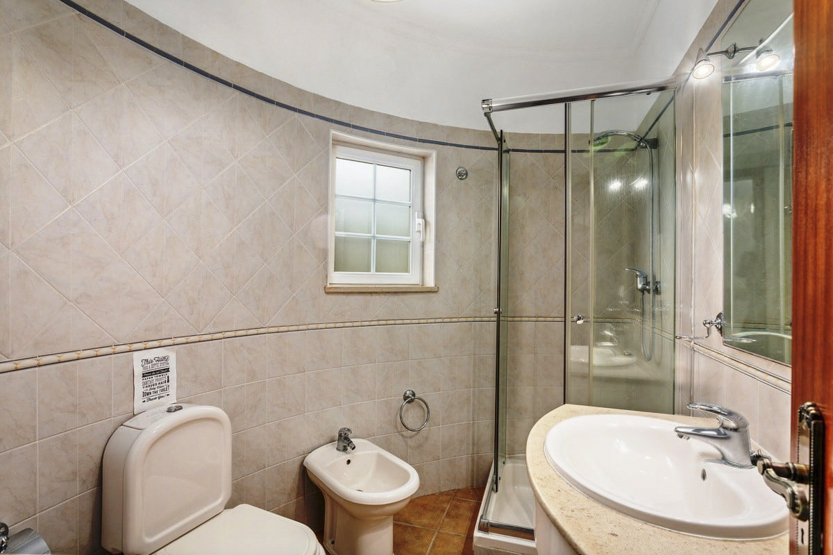 Across the upper and lower levels of the property, you’ll find five cosy bedrooms, each decorated in a simple traditional style that can sleep up to ten people in total. Each bedroom is simply decorated, sleeps up to two people, with a mix of king and twin beds, and has a private en-suite bathroom. Four bedrooms are located on the main upper level of the villa, and the fifth is downstairs, close to the games room, featuring direct garden access from the room.