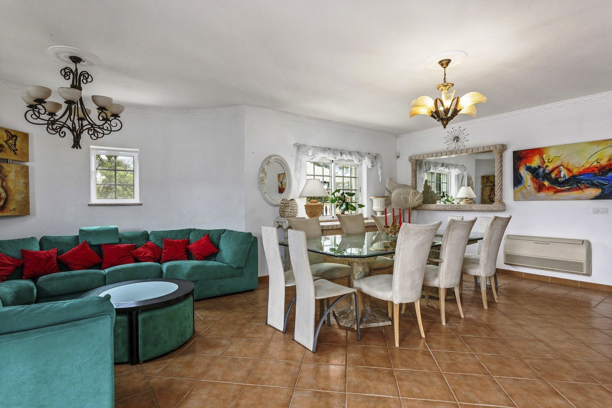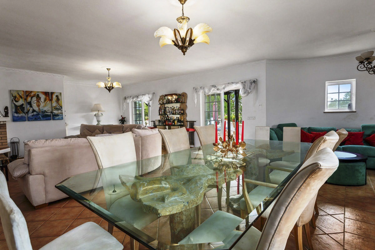 Inside, your main living space is an open plan living room and dining room combination with an additional seating nook and a home bar. A large wrap-around sofa focuses on the home’s TV, which has a DVD player so you can watch your favourite films and series at your leisure. Adjacent to the living area is a fully-equipped kitchen which you can use to prepare delicious meals during your time at Casa Lombos. A second dining area is located outside, overlooking the swimming pool, perfect for group meals in the fresh air.