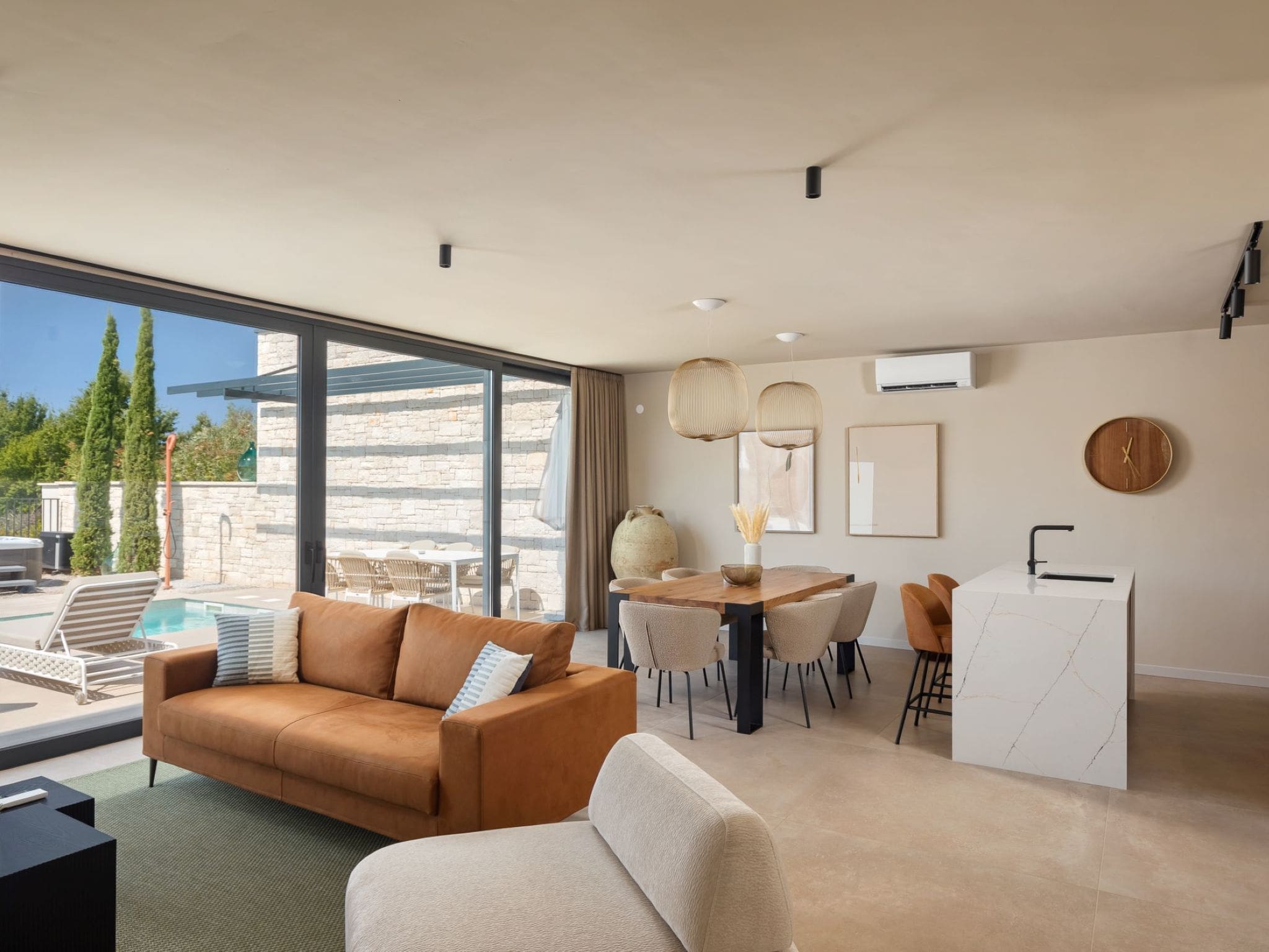 This exceptional luxury villa rental in Poreč, Croatia offers the perfect blend of modern comfort and Istrian charm in the peaceful hamlet of Mihatovići. Built in 2024, this contemporary three-bedroom property combines sleek design with premium amenities including a heated swimming pool, private sauna, and hot tub.