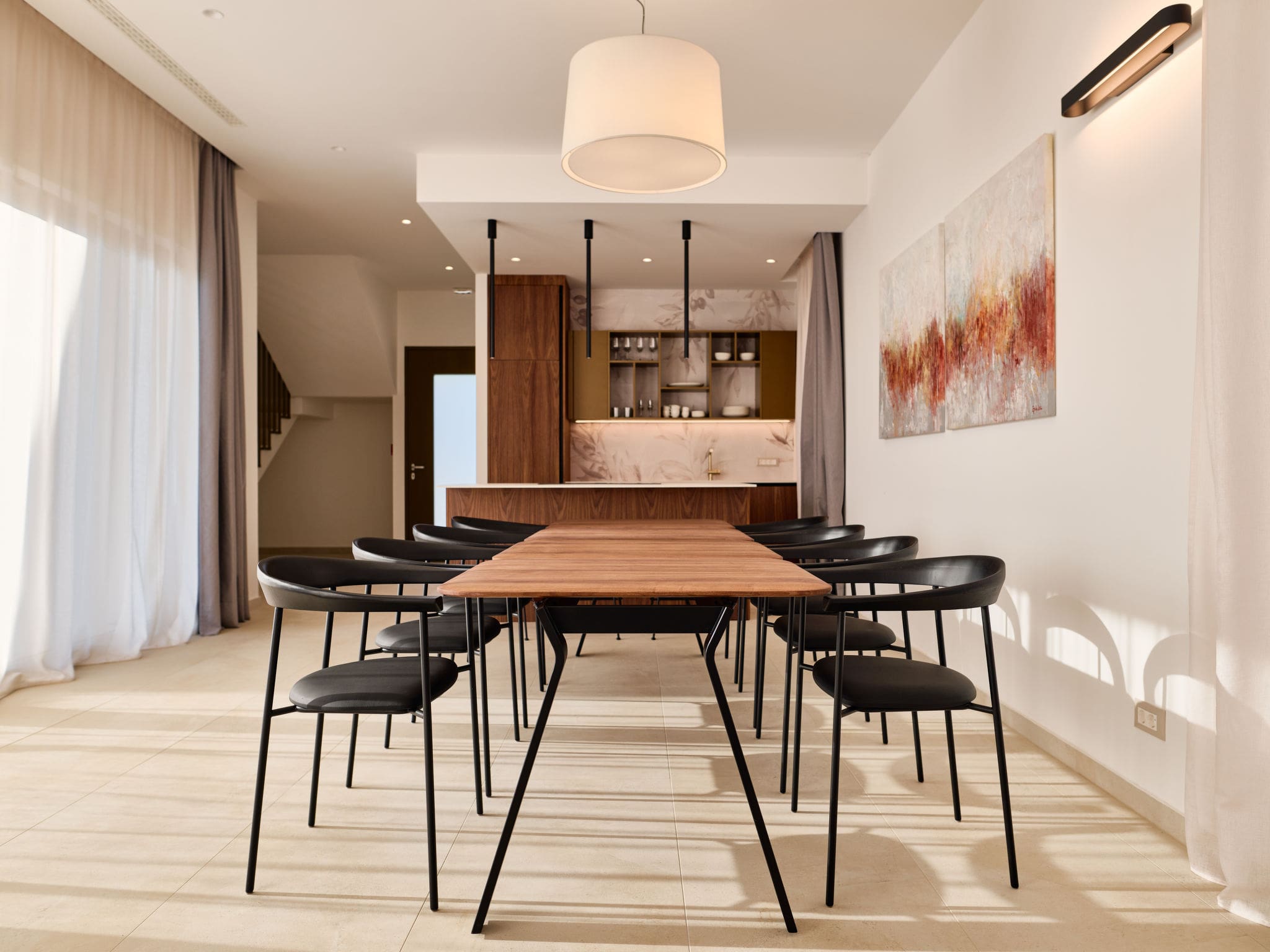 Spanning 155 square metres across two thoughtfully designed levels, this modern villa accommodates up to 8 guests in sophisticated comfort. The ground floor features an open-plan living and dining area with panoramic windows that flood the space with natural light and provide direct access to the private pool terrace. The sleek open kitchen, complete with cooking island, dishwasher, and premium appliances including an electric coffee machine, makes meal preparation effortless for families and groups.