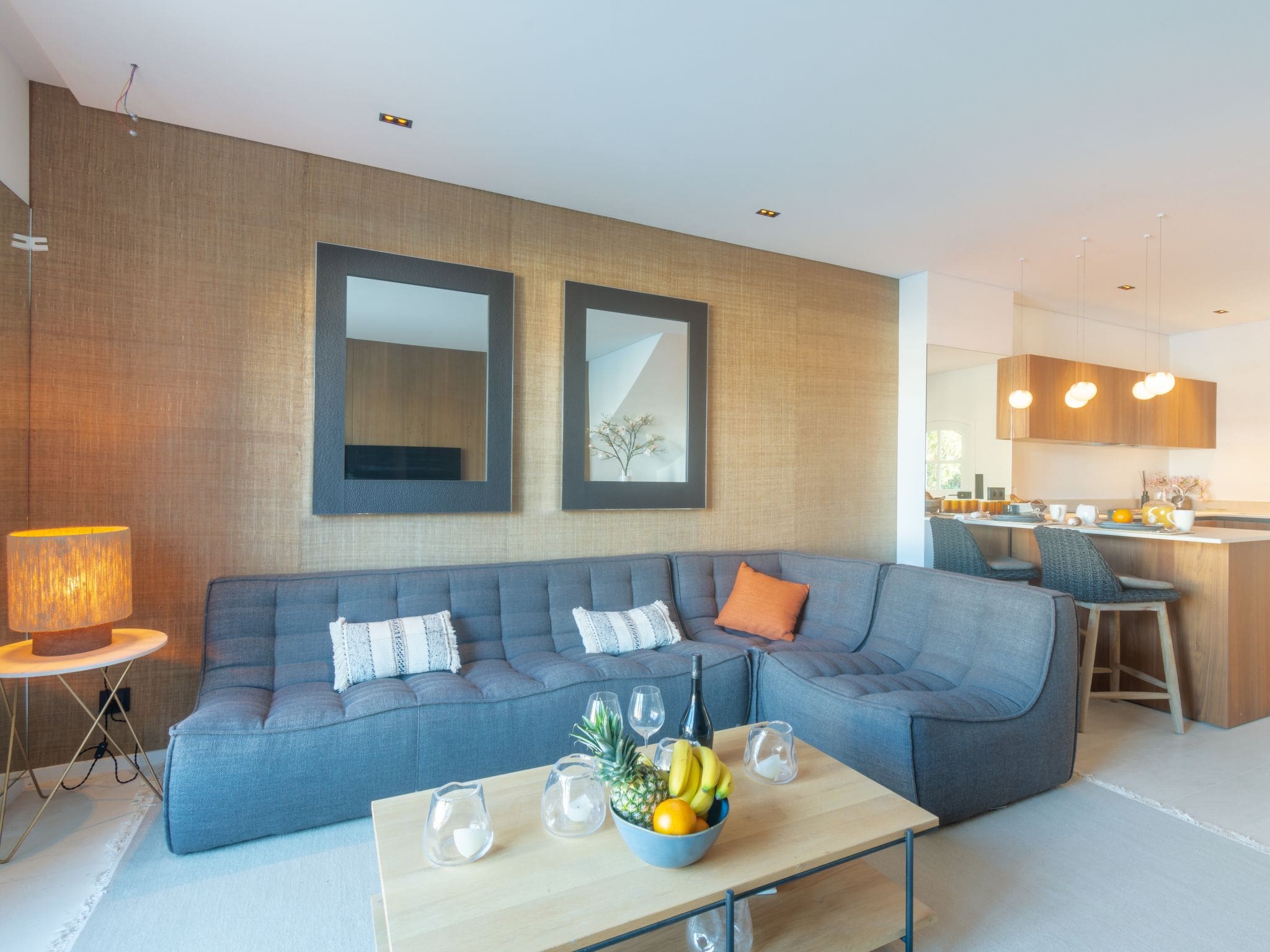 The 85-square-metre interior showcases very modern and luxurious furnishings throughout its four rooms, creating an atmosphere of refined comfort. The ground level welcomes guests with an open-plan living and dining area, featuring a decorative open-hearth fireplace and dining table positioned to capture natural light streaming through double-glazed windows. The contemporary open kitchen, equipped with induction hot plates, dishwasher, oven and electric coffee machine, provides everything needed for culinary endeavours while maintaining the property’s sleek aesthetic.