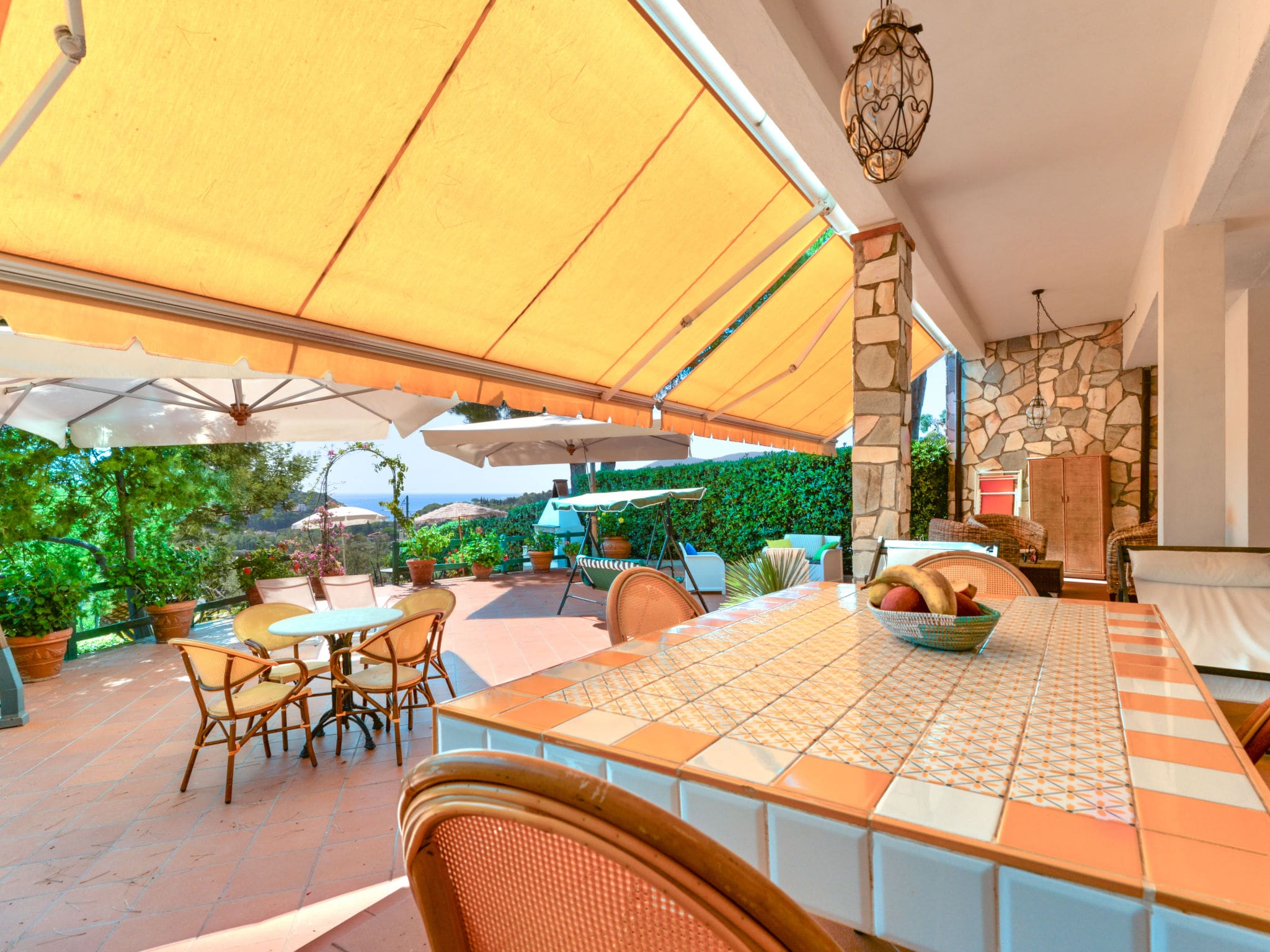 The villa’s outdoor spaces truly set it apart, featuring an extensive terraced garden that cascades down the hillside, completely fenced for privacy and security. Multiple terrace levels provide diverse settings for outdoor living, from sun-soaked breakfast spots to shaded afternoon retreats. The large balcony and various terraces, some partially roofed, offer flexible options for al fresco dining, sunset aperitifs, or simply absorbing the magnificent panoramic views.
