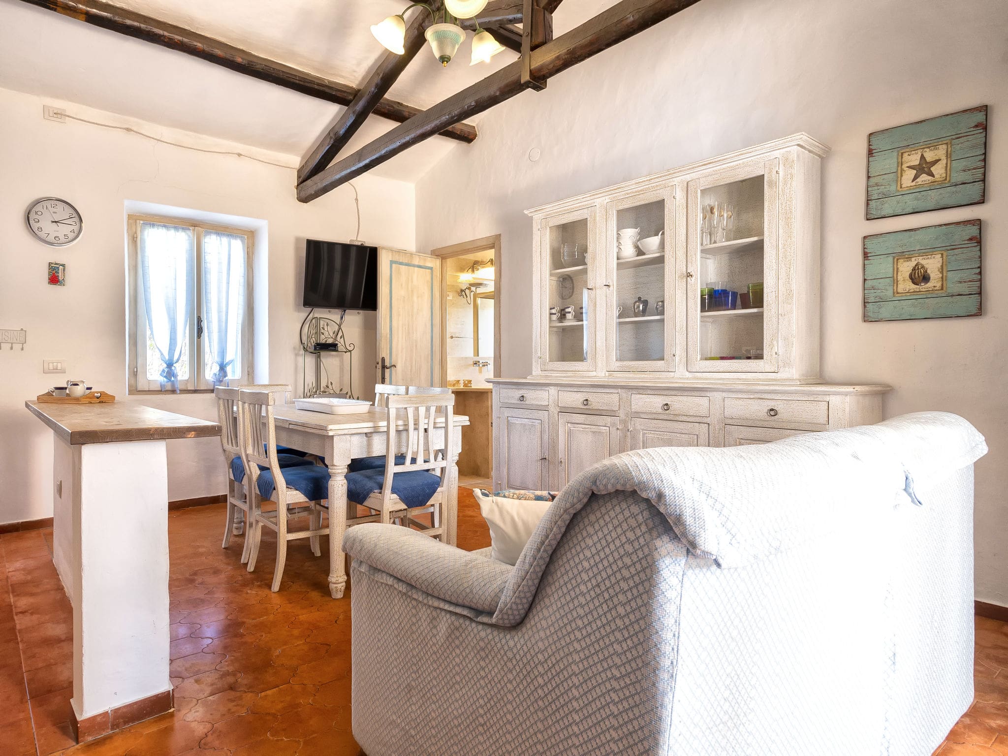 Terrace furniture, deck chairs, and a comfortable sitting area transform the outdoor spaces into an extension of the living areas, where guests can enjoy al fresco dining while taking in partial sea views. The sunny position ensures natural light fills both indoor and outdoor spaces throughout the day, creating a bright and welcoming atmosphere that captures the essence of Mediterranean living.
