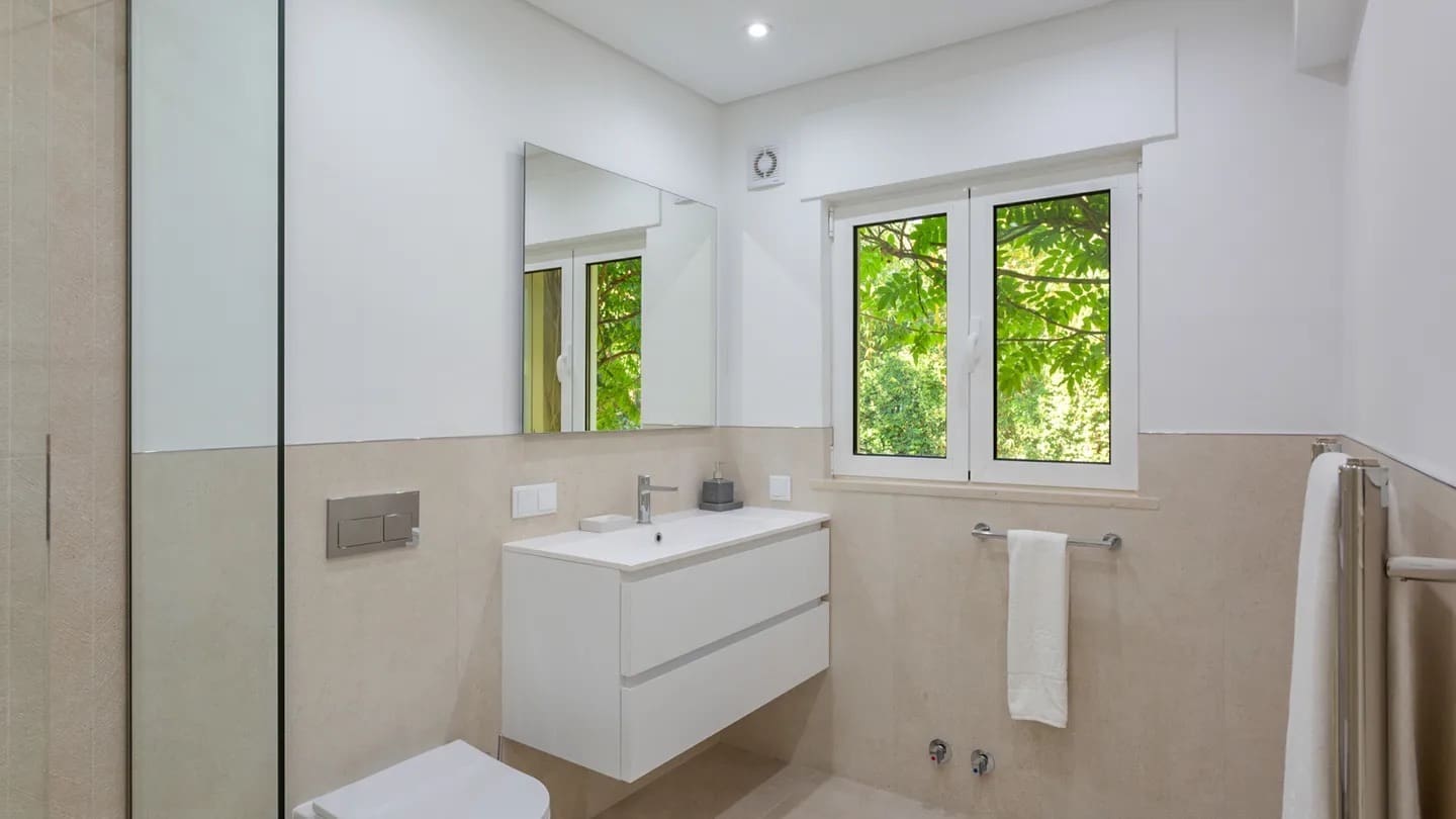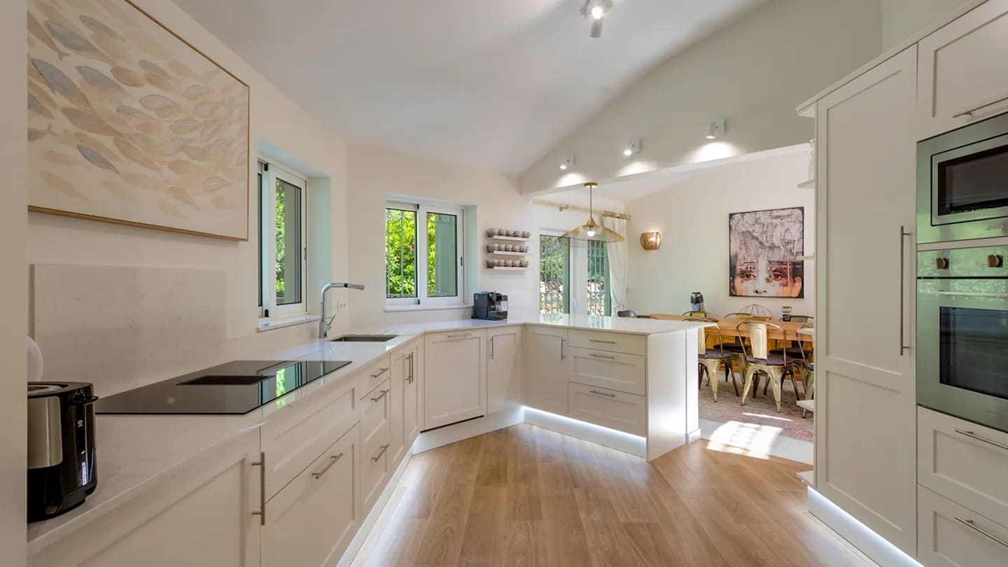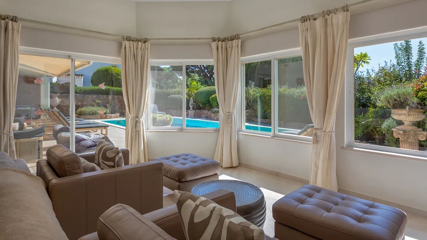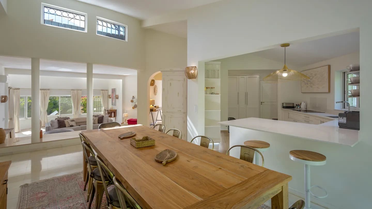 Inside, the villa unfolds with a sense of calm sophistication. The main living area is bathed in natural light, opening directly onto the pool terrace, creating an effortless connection between indoor comfort and outdoor leisure.