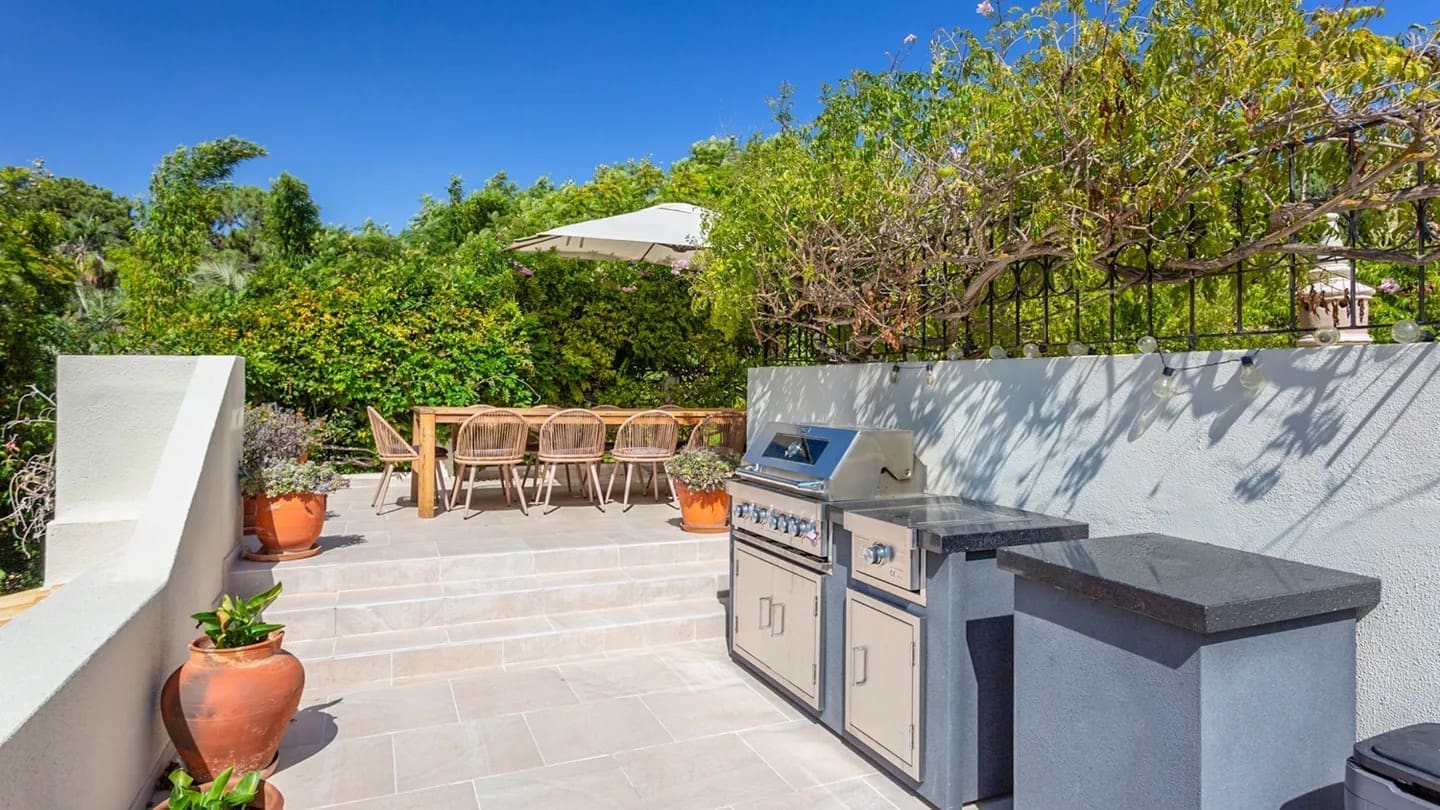 A dedicated outdoor dining terrace near the kitchen makes al fresco meals effortless, while a separate lounge area creates quiet corners for reading, conversation, or simply doing nothing at all.