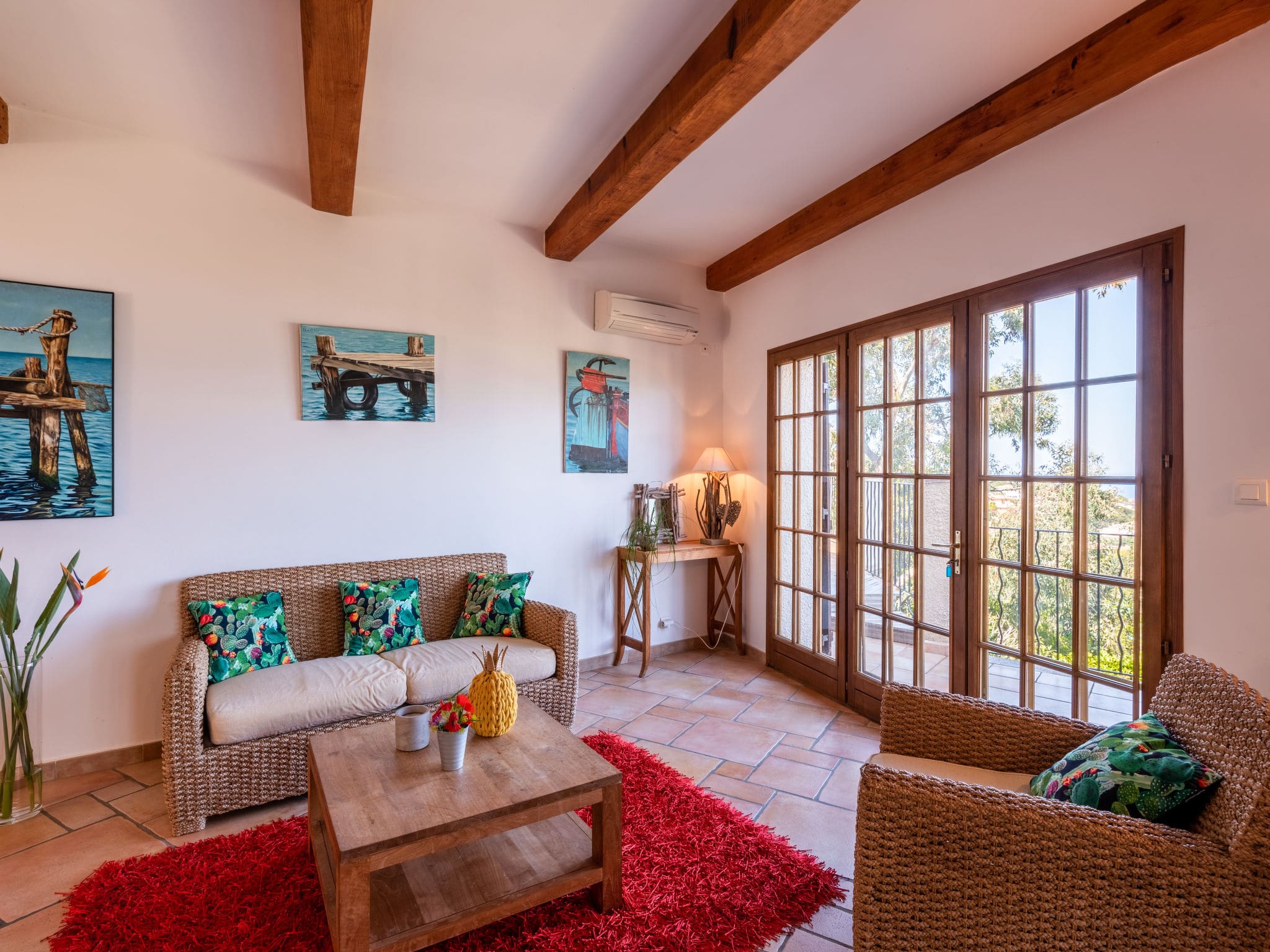 Spread across two thoughtfully designed levels, this beautifully appointed home features five generous bedrooms and four well-appointed bathrooms, comfortably accommodating up to ten guests. The bright, tasteful interiors showcase a harmonious blend of contemporary comfort and Mediterranean style, with air-conditioning throughout ensuring year-round comfort. The ground floor welcomes you with two bedrooms opening directly to the private garden, alongside a refreshing shower room. The upper level reveals the property’s true splendour, featuring an elegant living room with satellite television and DVD player, plus a charming studio space. Three additional bedrooms on this level each offer their own character, with two featuring ensuite shower rooms and the master bedroom boasting a luxurious bathroom with bathtub. The fully equipped kitchen includes modern amenities including dishwasher, ceramic hob, microwave, and electric coffee machine, while opening seamlessly to the covered terrace for effortless indoor-outdoor dining.