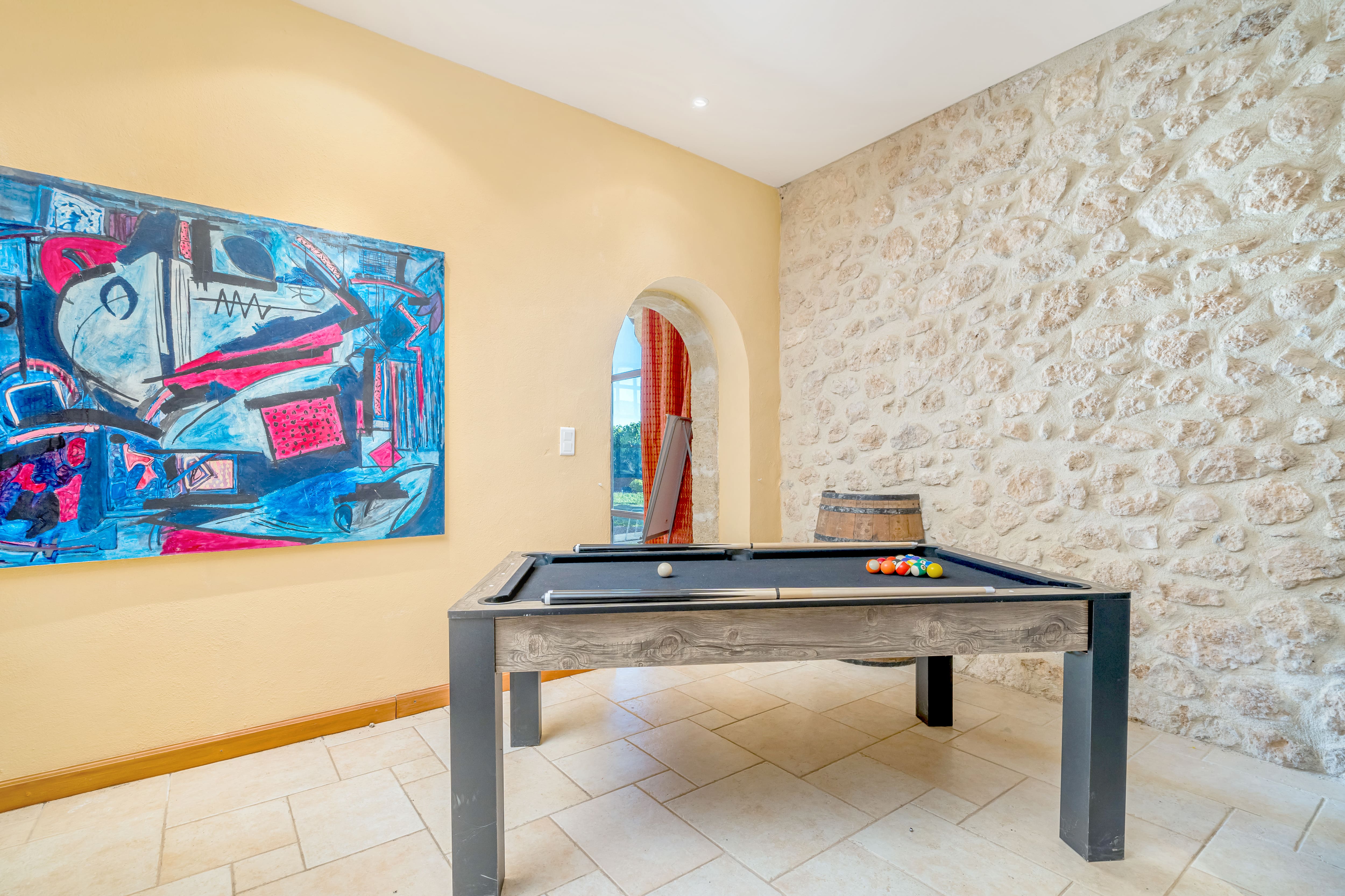 Step into a world of refined elegance as you enter this grand yet inviting villa. High ceilings and arched windows create a sense of spaciousness, while the decor exudes warmth and comfort. Spread across three distinct buildings, the villa houses seven luxurious bedrooms. The main house features four bedrooms with air conditioning, while the guest house offers two additional bedrooms. A self-contained suite provides a private retreat with its own kitchen. Ideal for large gatherings, this villa ensures every guest experiences a restful stay.