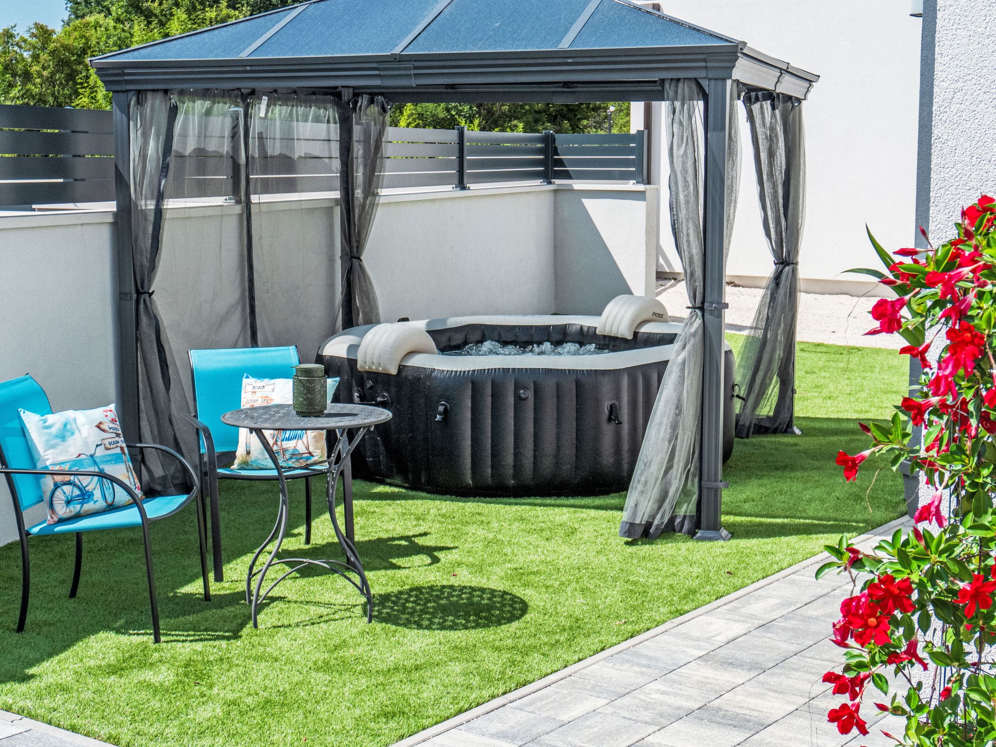 The villa’s outdoor spaces truly shine with a heated swimming pool taking center stage. The angular 8×4 meter pool with internal staircase provides refreshing respite during warm Istrian days, while the heating system extends the swimming season from May through November. An outdoor shower offers convenient pool-side facilities, complemented by a relaxing hot tub for evening unwinding.