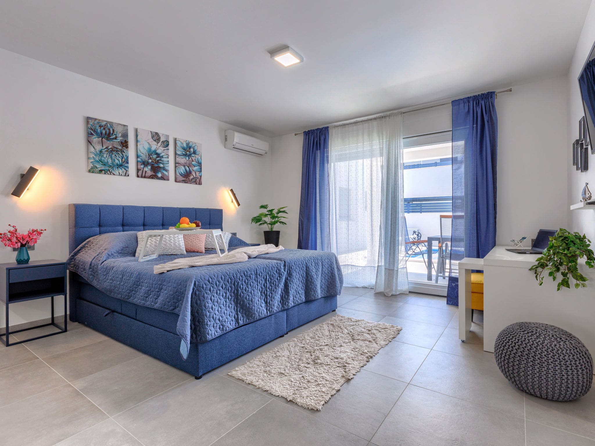 Spanning 200m² across two thoughtfully designed levels, this modern villa accommodates up to eight guests in four well-appointed bedrooms. The ground floor features a spacious living and dining area with satellite television and air conditioning, flowing seamlessly to the pool area through large glazed doors. Two bedrooms on this level include a master suite with ensuite shower and a second bedroom, both furnished with comfortable French beds and individual air conditioning. The contemporary open kitchen comes fully equipped with modern appliances including an oven, dishwasher, ceramic hob, and electric coffee machine.