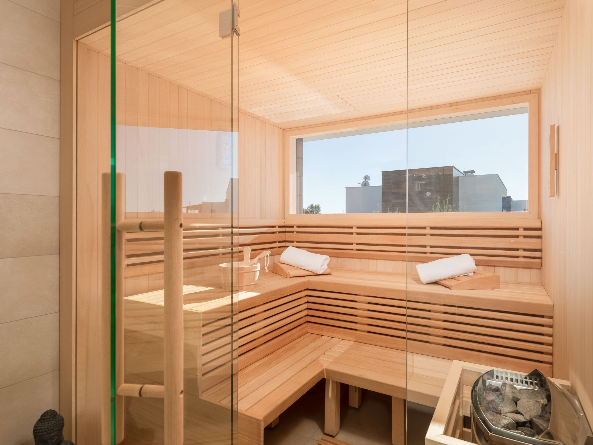 The villa includes WiFi, air conditioning throughout, private pool, sauna, hot tub, fully equipped kitchen, entertainment facilities, parking for three cars, and all linens and towels for a complete luxury experience.
