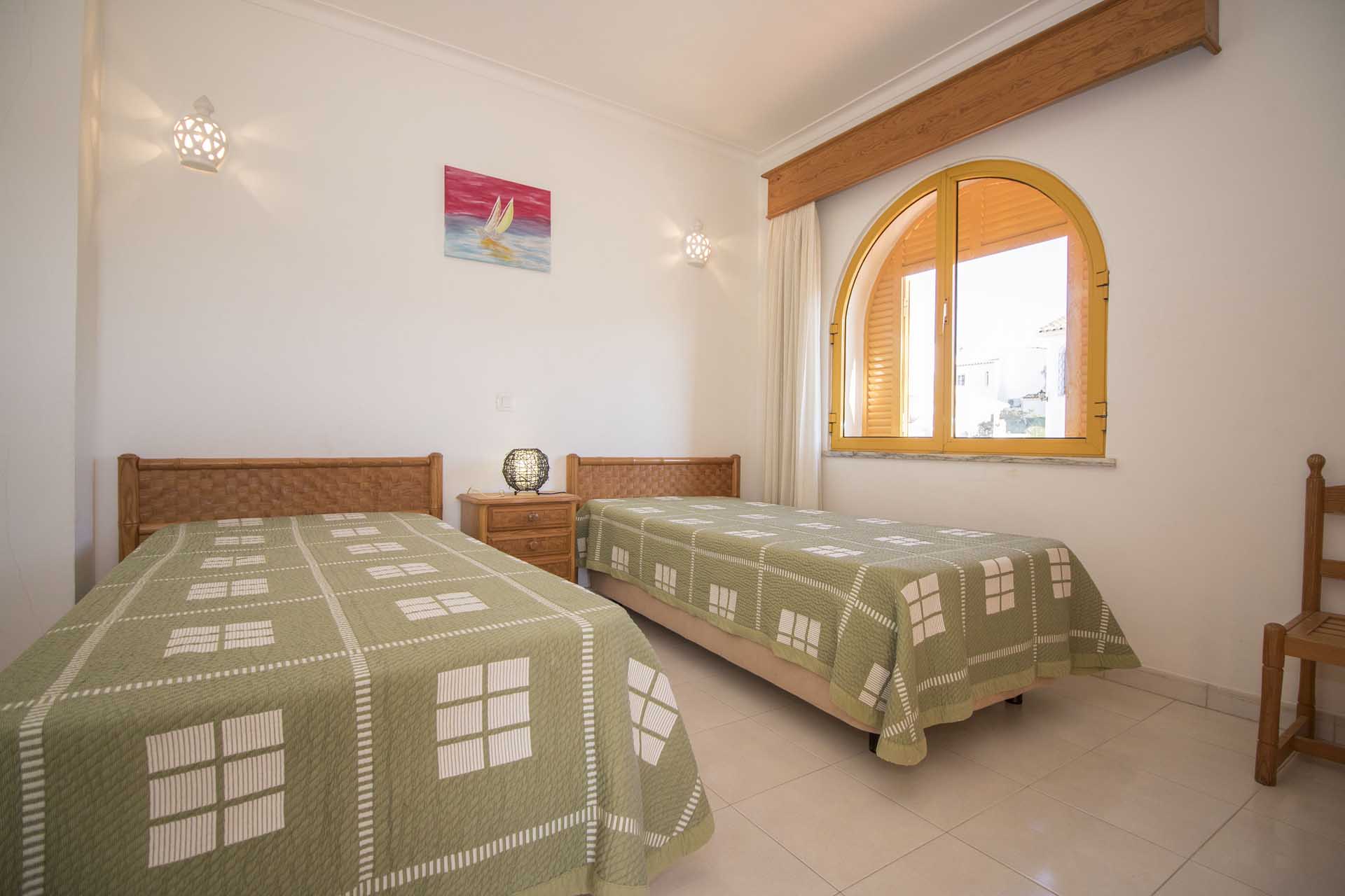 The villa is in keeping with a more traditional style of housing, for the region. Entering the villa, you are welcomed by an amply sized lounge with its original fireplace, fully fitted kitchen and dining area, leading on to the garden. On this floor a bedroom, with a double bed and communal bathroom can also be found.The first floor of this villa is made up of a master en-suite bedroom, with a double bed. Attached is a private veranda, where you will be able to appreciate the Vilamoura countryside and nearby pristine Oceanico Pinhal golf course. This floor also comprises of two bedrooms with two single beds, as well as a shared bathroom.