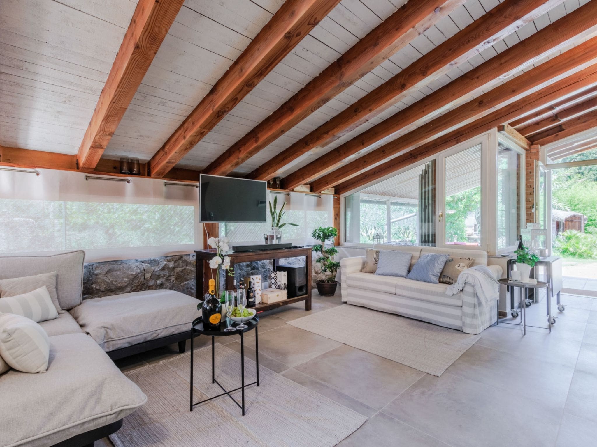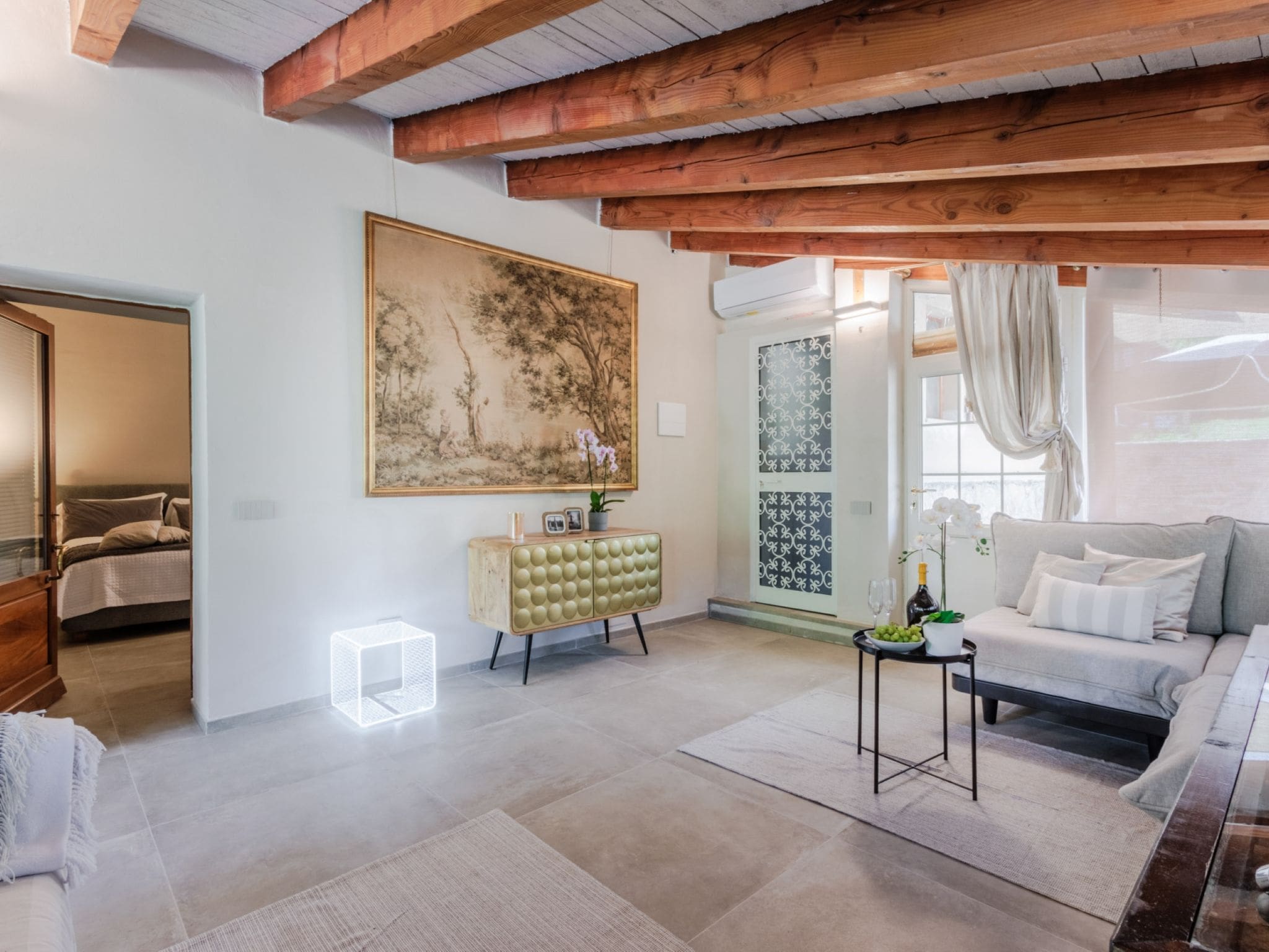Fully renovated in 2023, this ground-floor villa combines modern sophistication with practical family living across 100 square meters of thoughtfully designed space. The open-plan living area features comfortable seating including a double sofa bed, while large windows frame views of the surrounding garden and countryside. The master bedroom provides luxurious accommodation with a king-size bed, while the second bedroom offers flexible sleeping arrangements with both a single bed and pull-out bed, perfect for children or additional guests.