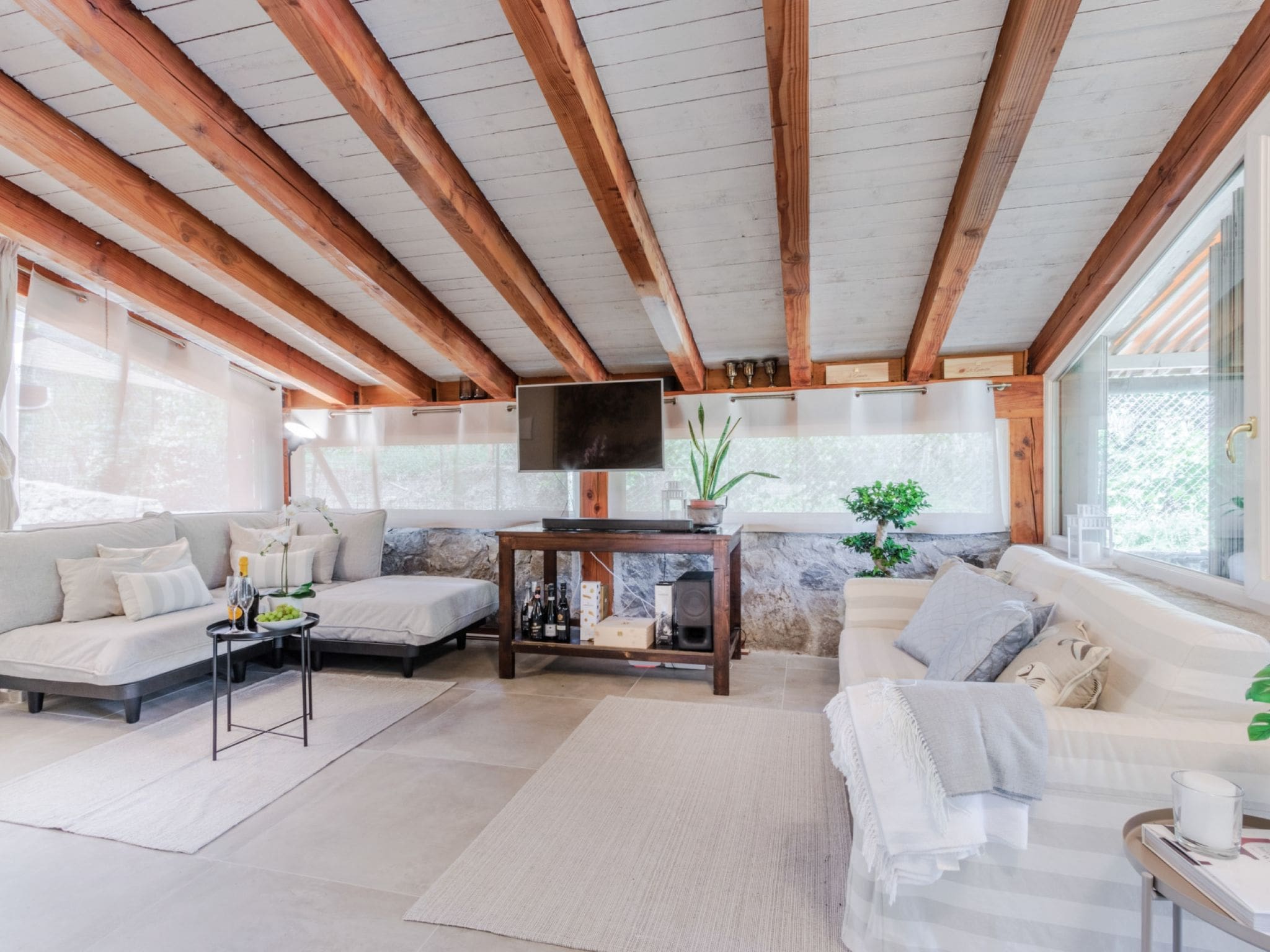 The 160-square-metre villa presents elegant single-level living designed for relaxation and connection. The spacious living room, flooded with natural light through panoramic windows, features a comfortable double sofa bed and opens seamlessly to multiple terraces and the garden beyond. The master bedroom boasts a luxurious king-size bed and private ensuite bathroom, while a unique detached bedroom accessible via the loggia offers couples additional privacy. The third bedroom, with its flexible twin beds that convert to a double, provides versatility for families or groups. Throughout the villa, modern amenities including air conditioning, WiFi, and a fully equipped kitchen with premium appliances ensure every comfort is considered.