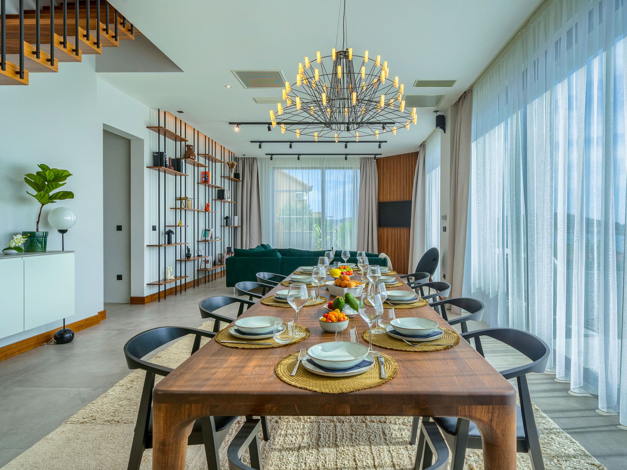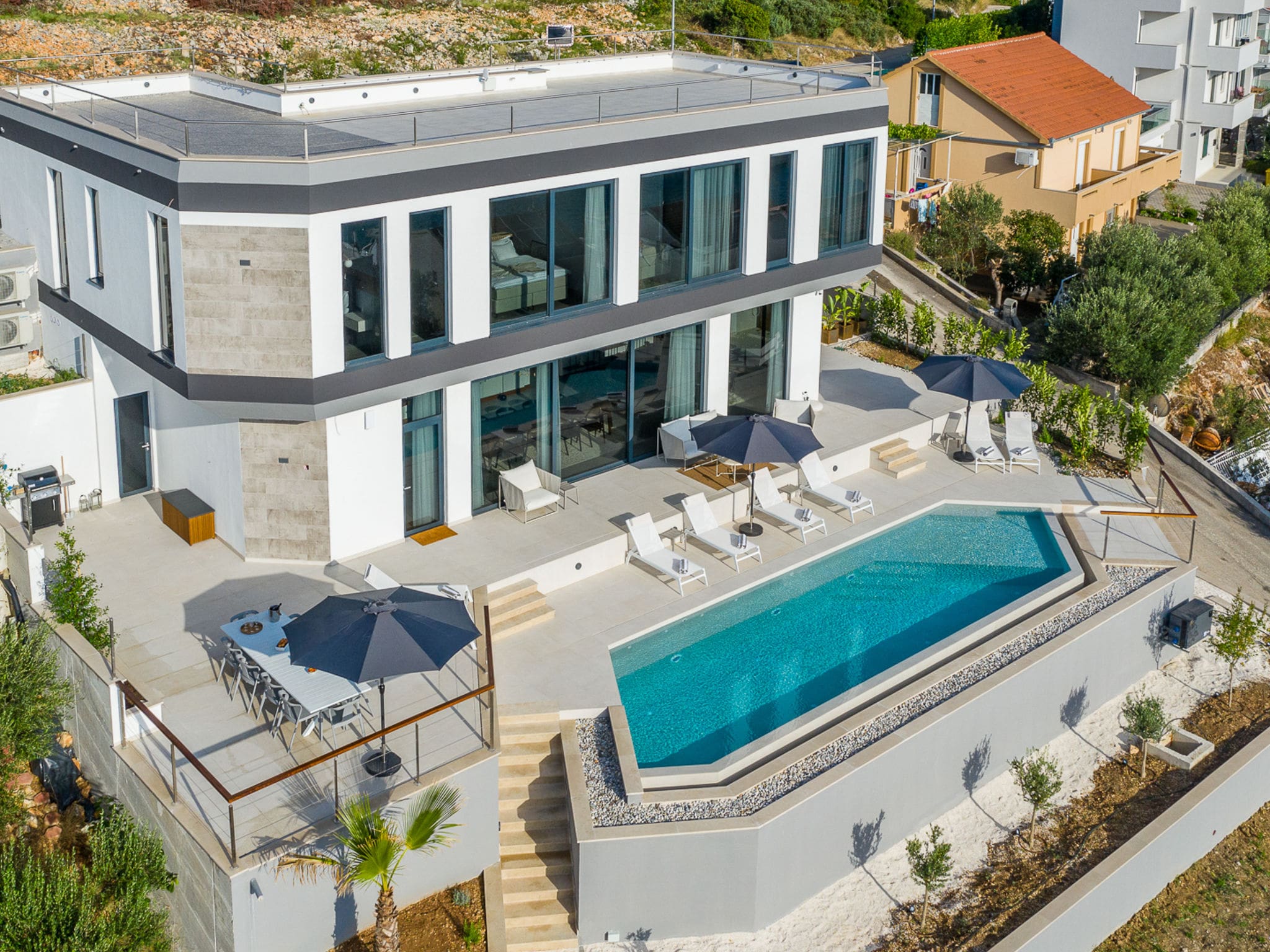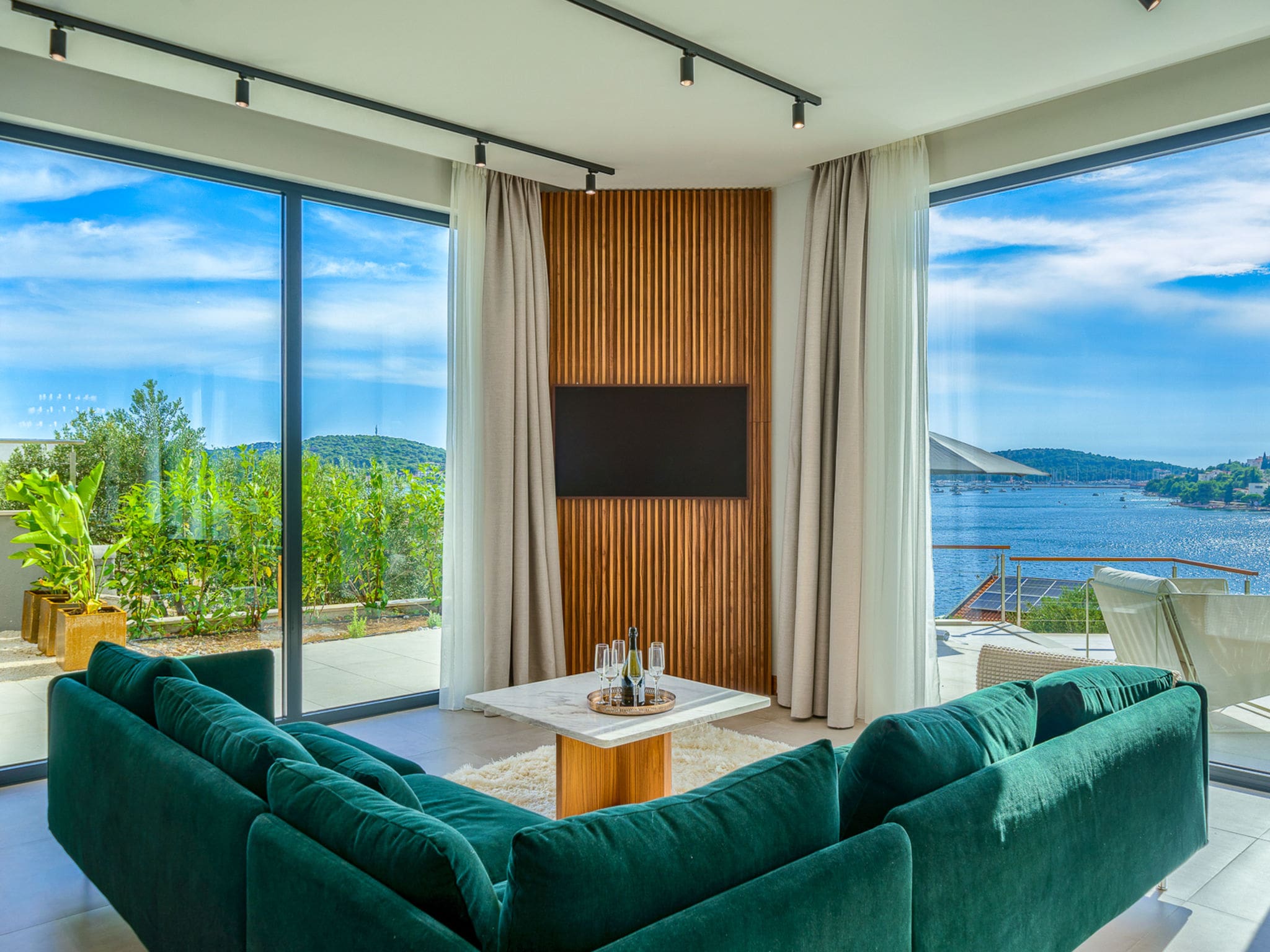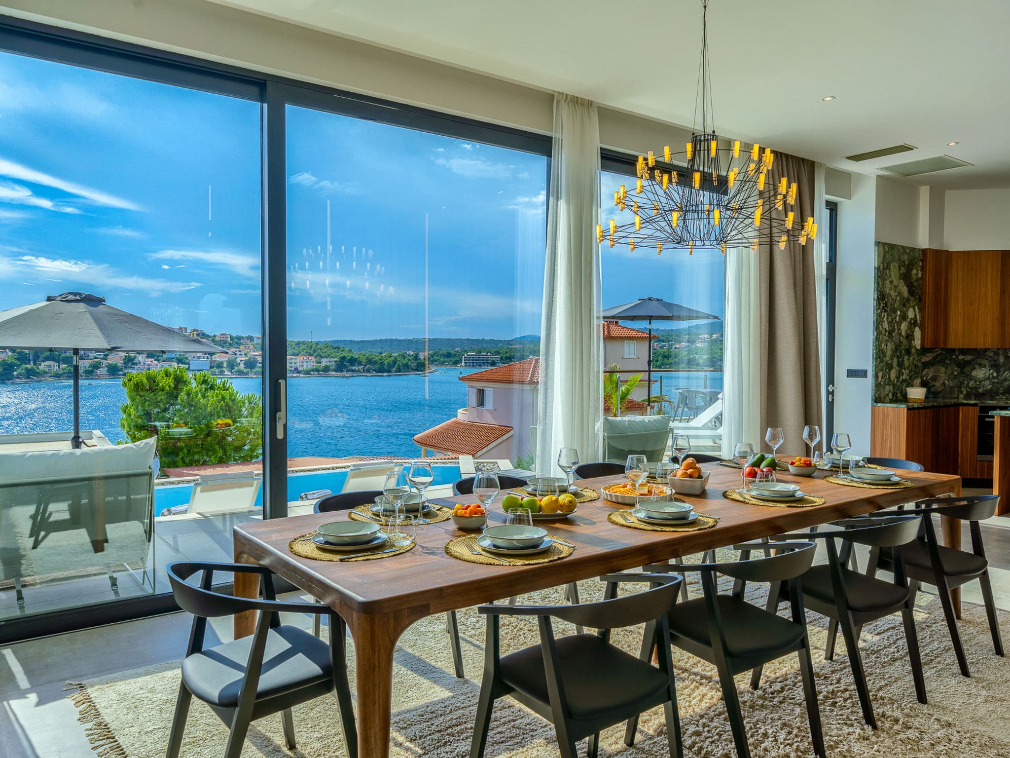 Spanning 340 square metres across two thoughtfully designed levels, this exceptional property showcases modern luxury living at its finest. The open-plan living and dining area flows seamlessly onto expansive terraces, where floor-to-ceiling windows frame spectacular sea views that stretch to the horizon. The sophisticated interior design celebrates Croatian coastal living with stylish furnishings, natural materials, and an abundance of natural light throughout every room.