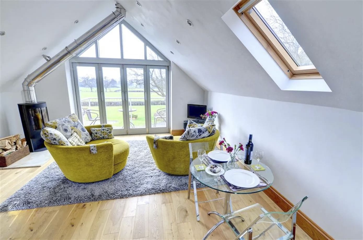 Upstairs, this country escape really starts to let you unwind, with a fabulous pitched, floor-to-ceiling window at the end of the room, capturing the beautiful countryside. Two large swivel chairs take pride of place by the wood burning fire, so you can enjoy this delightful room with ease, turning from the views to the warm glow of the fire and further round to the social atmosphere of the kitchen. A serene balcony extends the room outside and brings you even closer to the bordering scenery. The kitchen itself is modern and well-equipped, offering everything you might need to cook and dine at home.