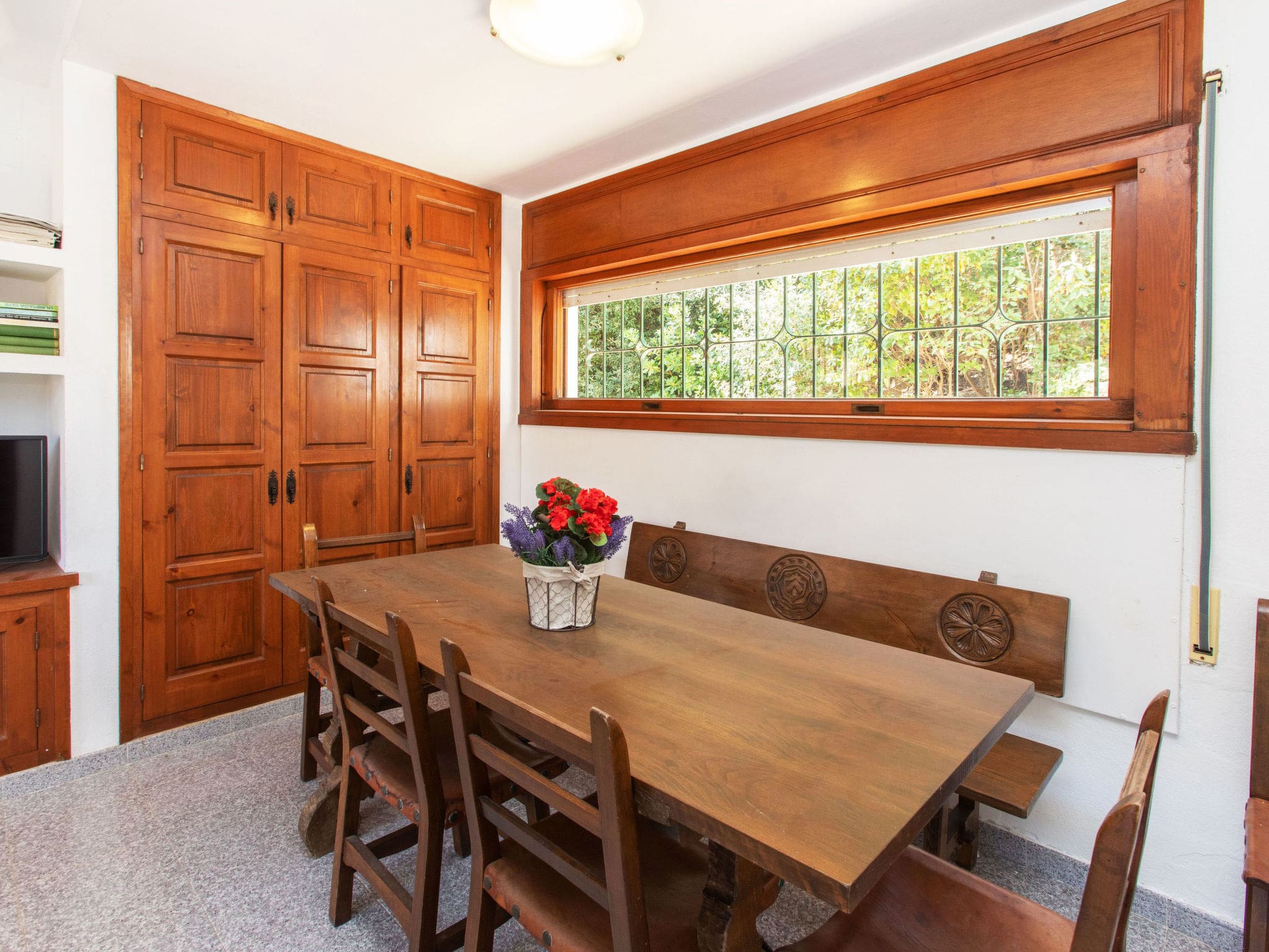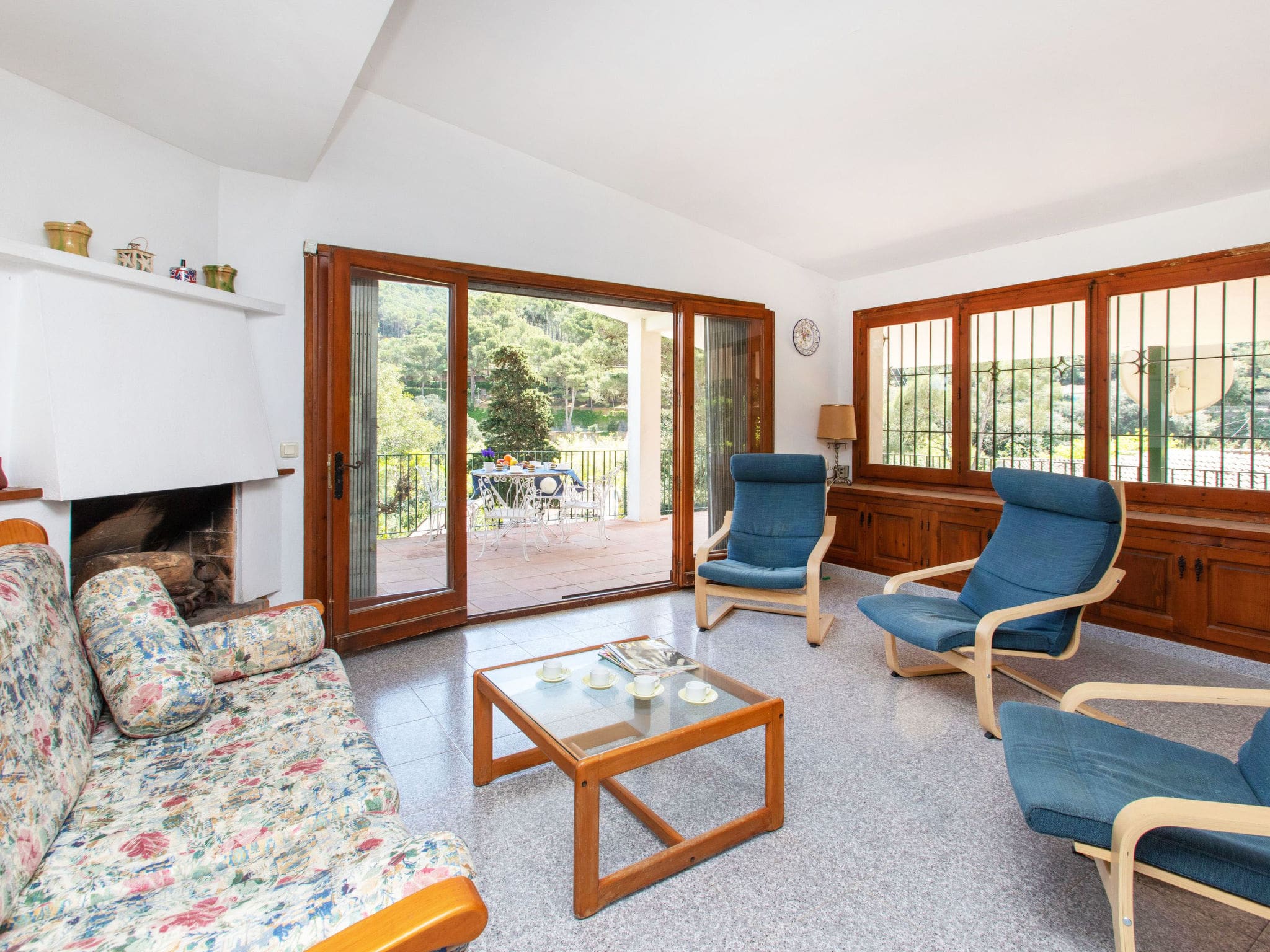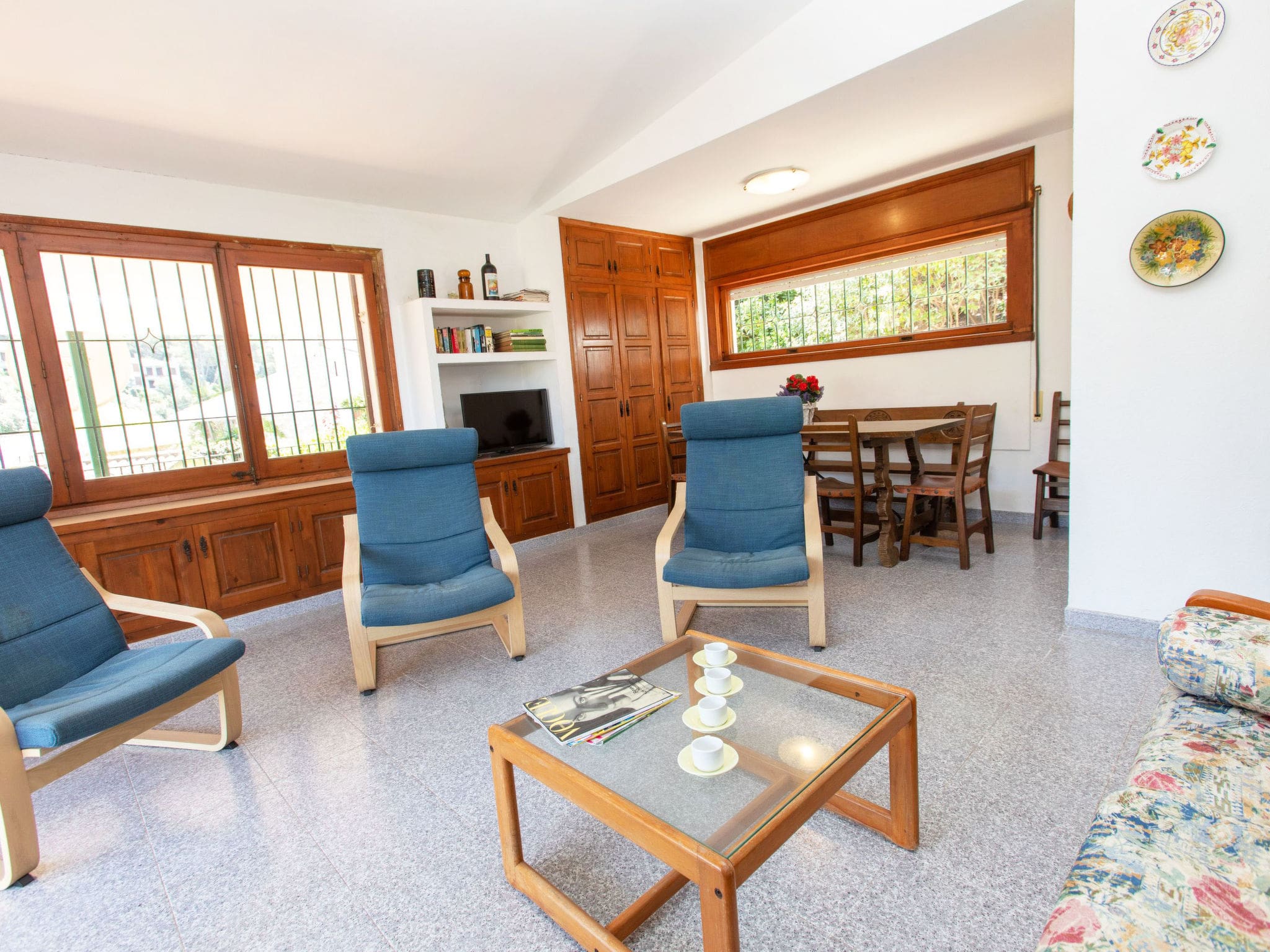 The 80-square-metre villa welcomes guests with its authentic rustic charm and thoughtful layout across a single level. The heart of the home features an inviting living and dining area with a decorative open fireplace and digital television, creating the perfect space for evening relaxation after days spent exploring the Costa Brava coastline. Large windows and terrace access ensure the Mediterranean sunshine flows throughout the interior spaces.