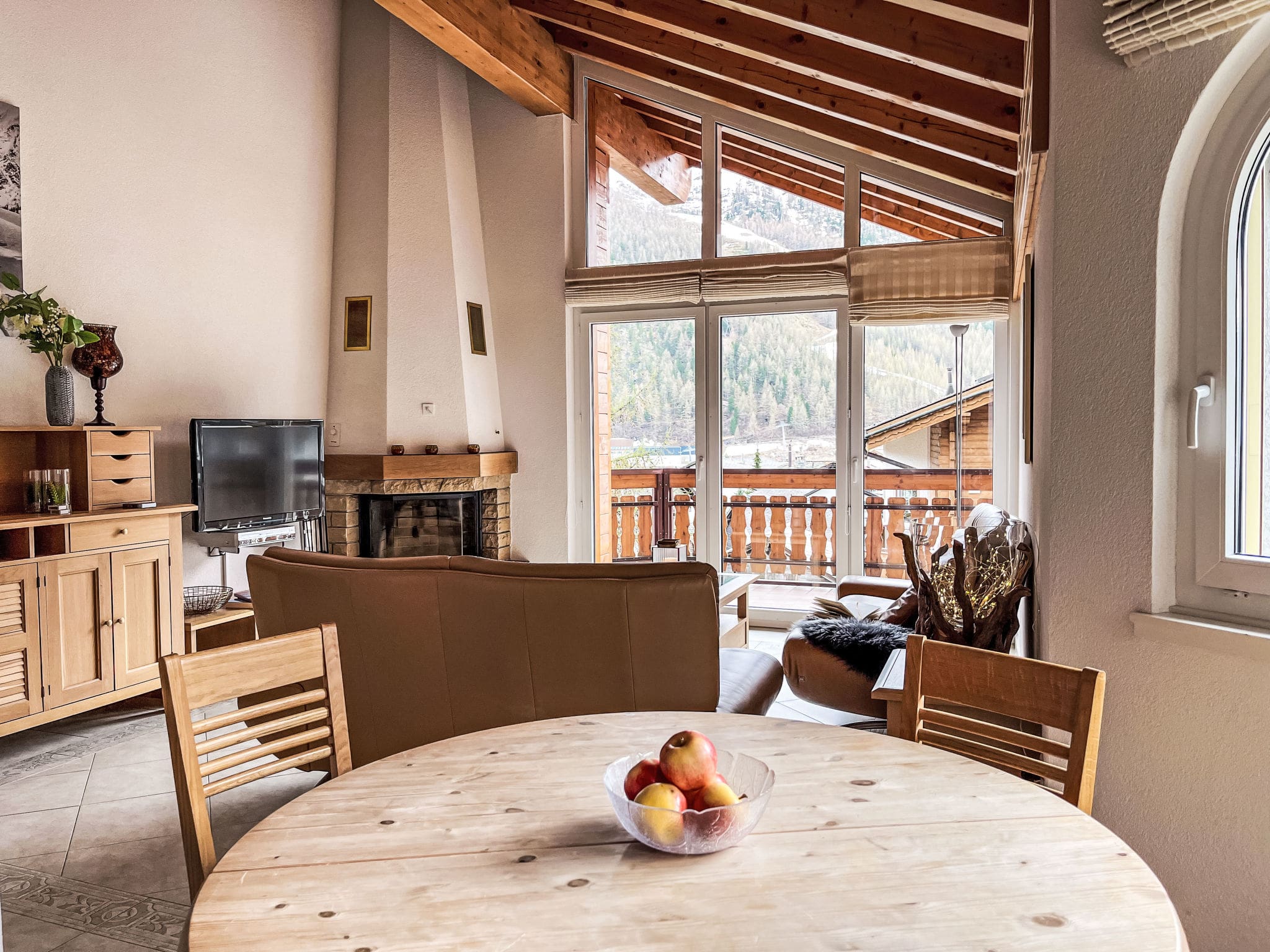 The beautifully appointed 3-room apartment occupies the third floor of this distinguished building, accessed by a private elevator for ultimate convenience. The open-plan living and dining area features elegant furnishings and floor-to-ceiling windows that frame spectacular views of the surrounding 4,000-metre peaks. Cable television and complimentary WiFi ensure modern connectivity while the space maintains its alpine charm.