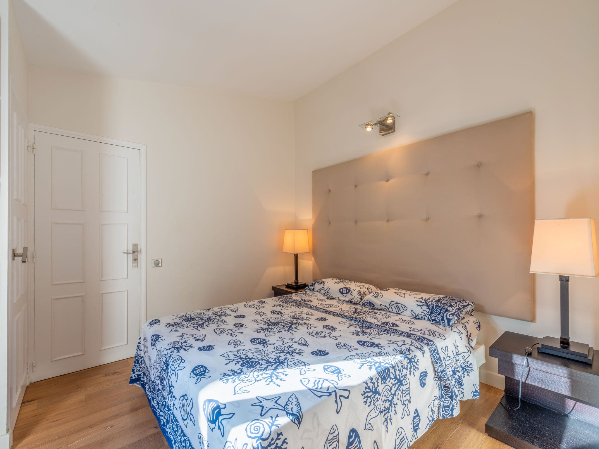 The spacious 80-square-metre villa welcomes guests with an elegant open-plan design that maximises natural light and creates an atmosphere of refined relaxation. The large living and dining area features contemporary furnishings, a flat-screen television, and air conditioning for year-round comfort. Both bedrooms are generously proportioned and feature comfortable French beds measuring 160cm by 200cm, ensuring restful nights after days spent exploring the Riviera. Each bedroom benefits from its own shower facilities, with the master bedroom including a full en-suite bathroom.