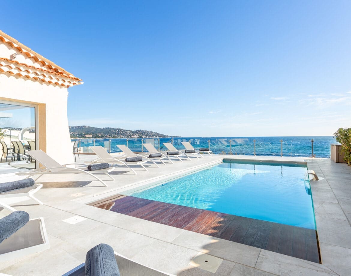Hear the waves lap against the rocks below as you enjoy coffee and croissants overlooking the azure-coloured Mediterranean each morning. Followed by a dip in the heated swimming pool or outdoor jacuzzi, both with incredible views of the sea. Close to Sainte-Maxime and Saint-Tropez, this contemporary seafront villa enjoys a spectacular setting for a high-end holiday on the French Riviera.