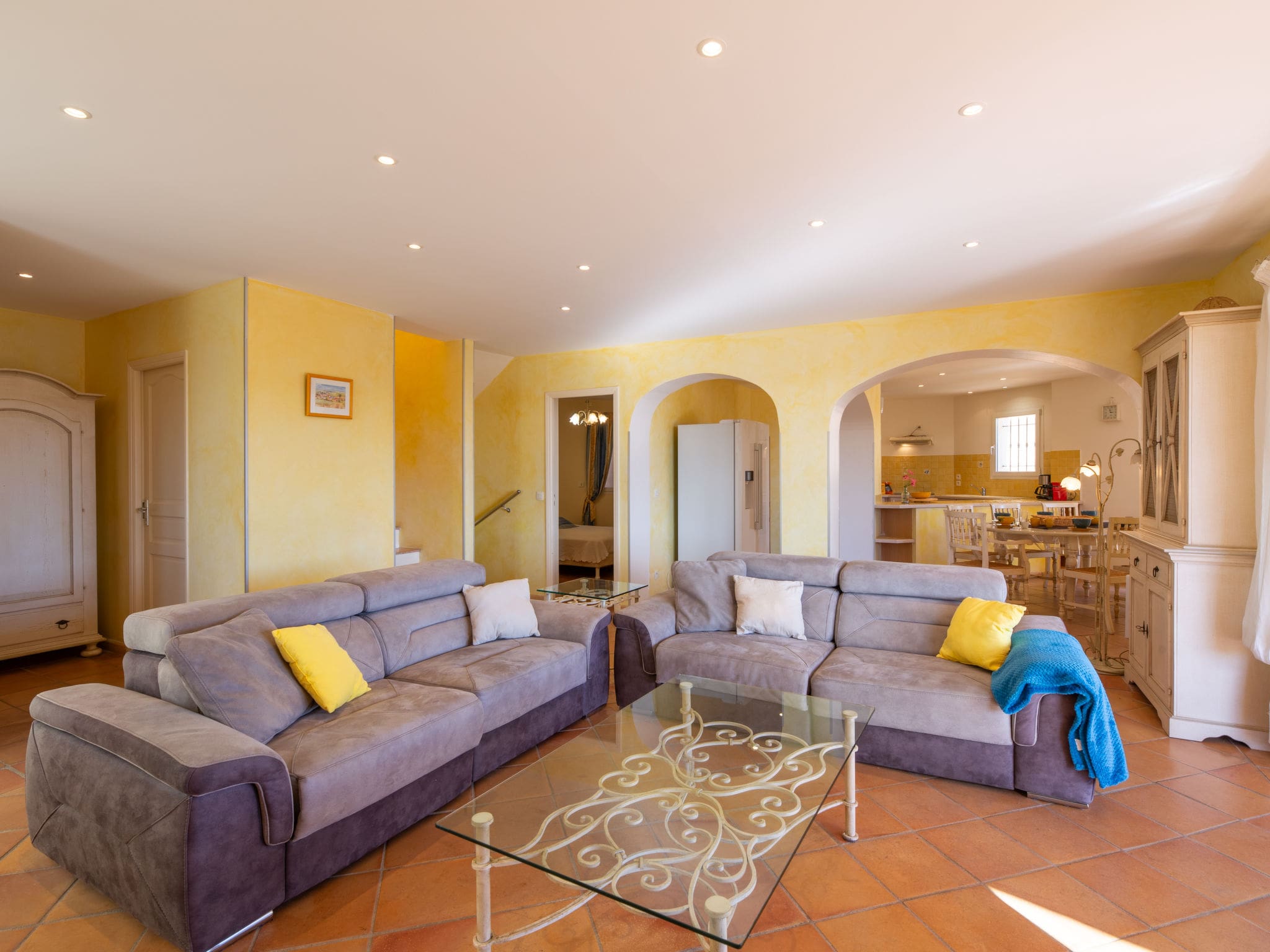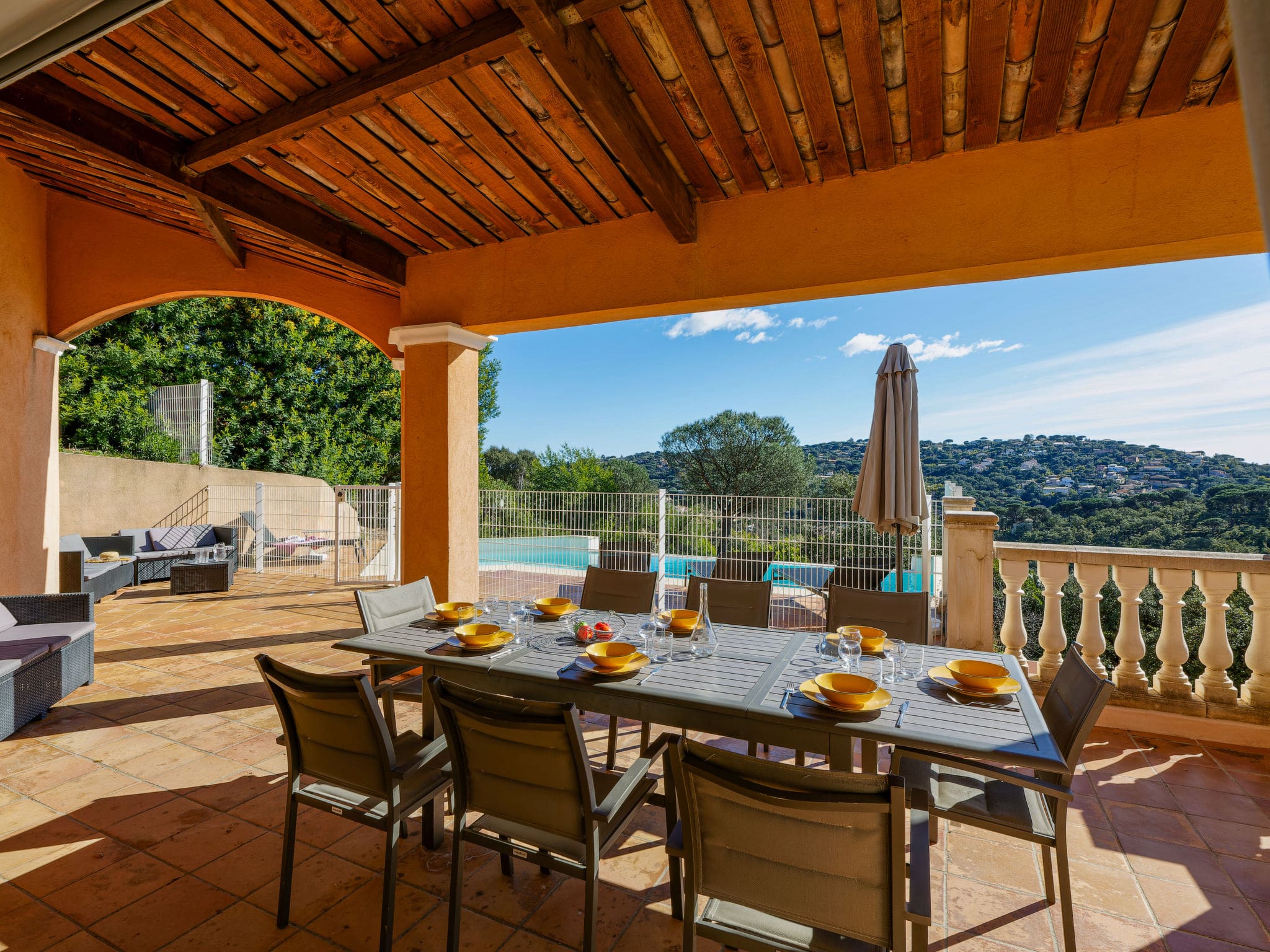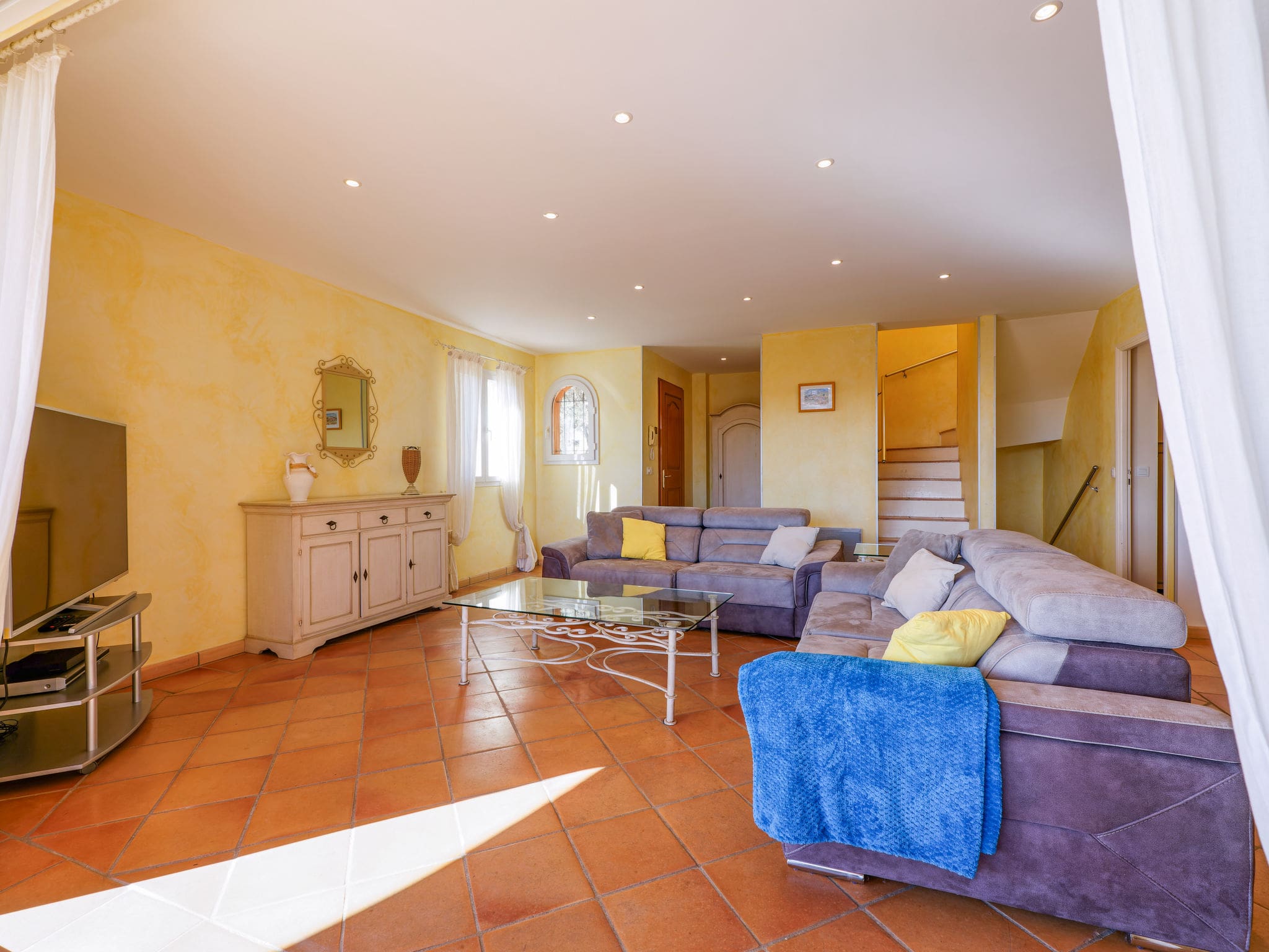The villa’s crown jewel is its stunning outdoor space, featuring a 9×3 metre private swimming pool with internal staircase, available from June through September. Multiple terrace areas totaling 65m² provide diverse settings for relaxation and entertainment, from the partly roofed main terrace perfect for al fresco dining to intimate balcony spaces ideal for morning coffee. The terraced gardens showcase native Mediterranean flora while maintaining complete privacy within the fenced grounds. A boules court adds traditional French entertainment, while the barbecue area creates perfect settings for evening gatherings under the Provençal sky.