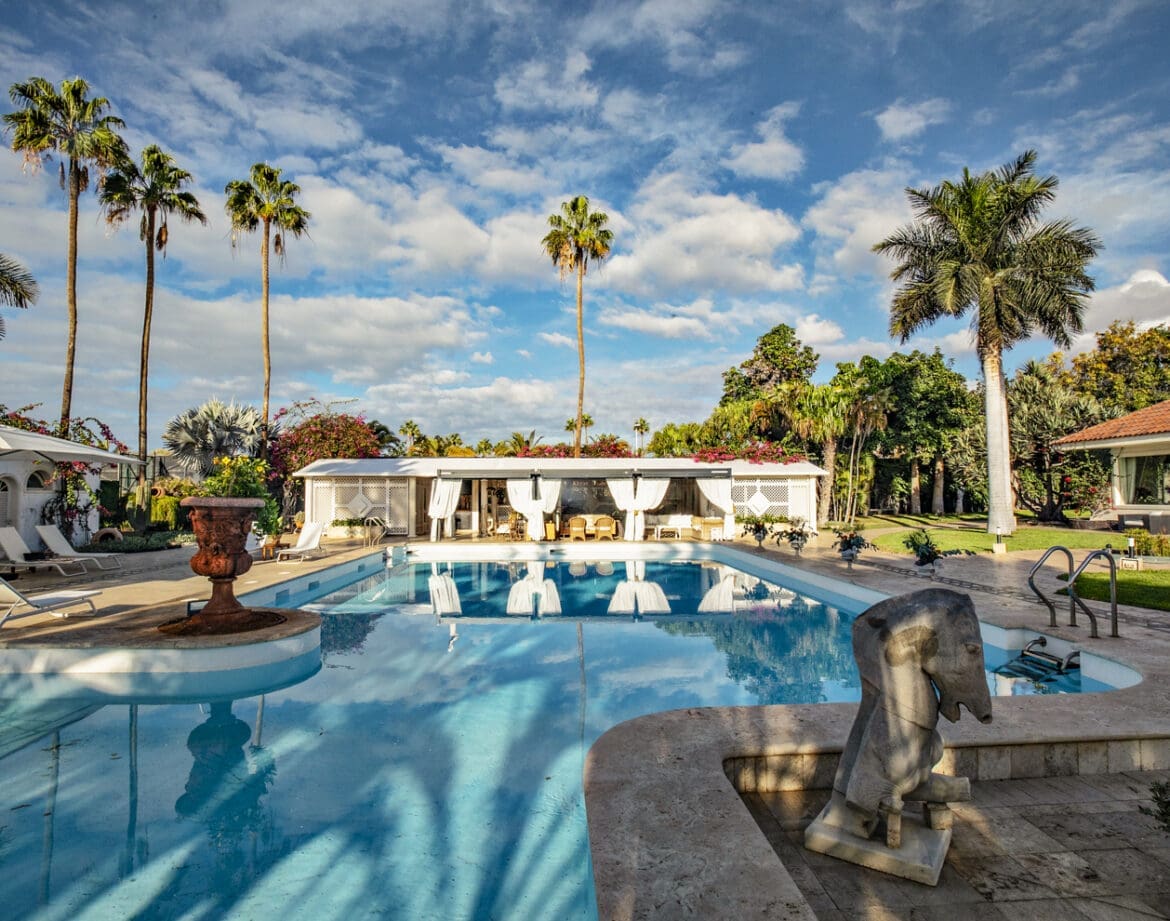 Inside, the villa showcases exquisite decor and furnishings, creating an immersive and inviting holiday home. The living room offers a variety of comfortable seating options adorned with plush cushions, providing a cosy environment for guests to recharge and engage in conversations about their favourite experiences. The dining area continues the elegant ambience with a spacious white wooden table and ornate chairs, inviting guests to enjoy shared meals and create cherished memories. The well-appointed kitchen boasts pristine white cupboards and surfaces, complemented by stylish patterned wallpaper, enabling guests to prepare and serve delicious meals for their loved ones.