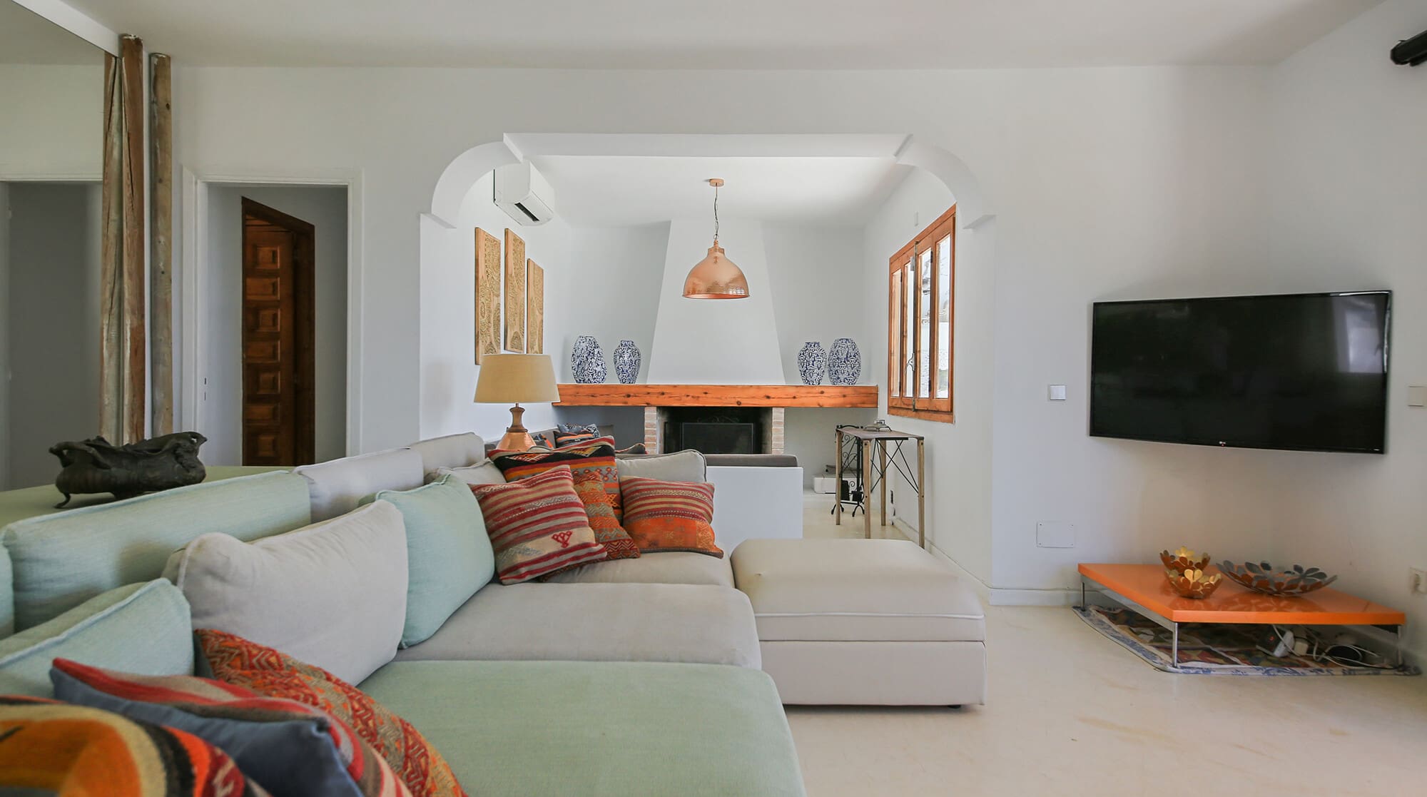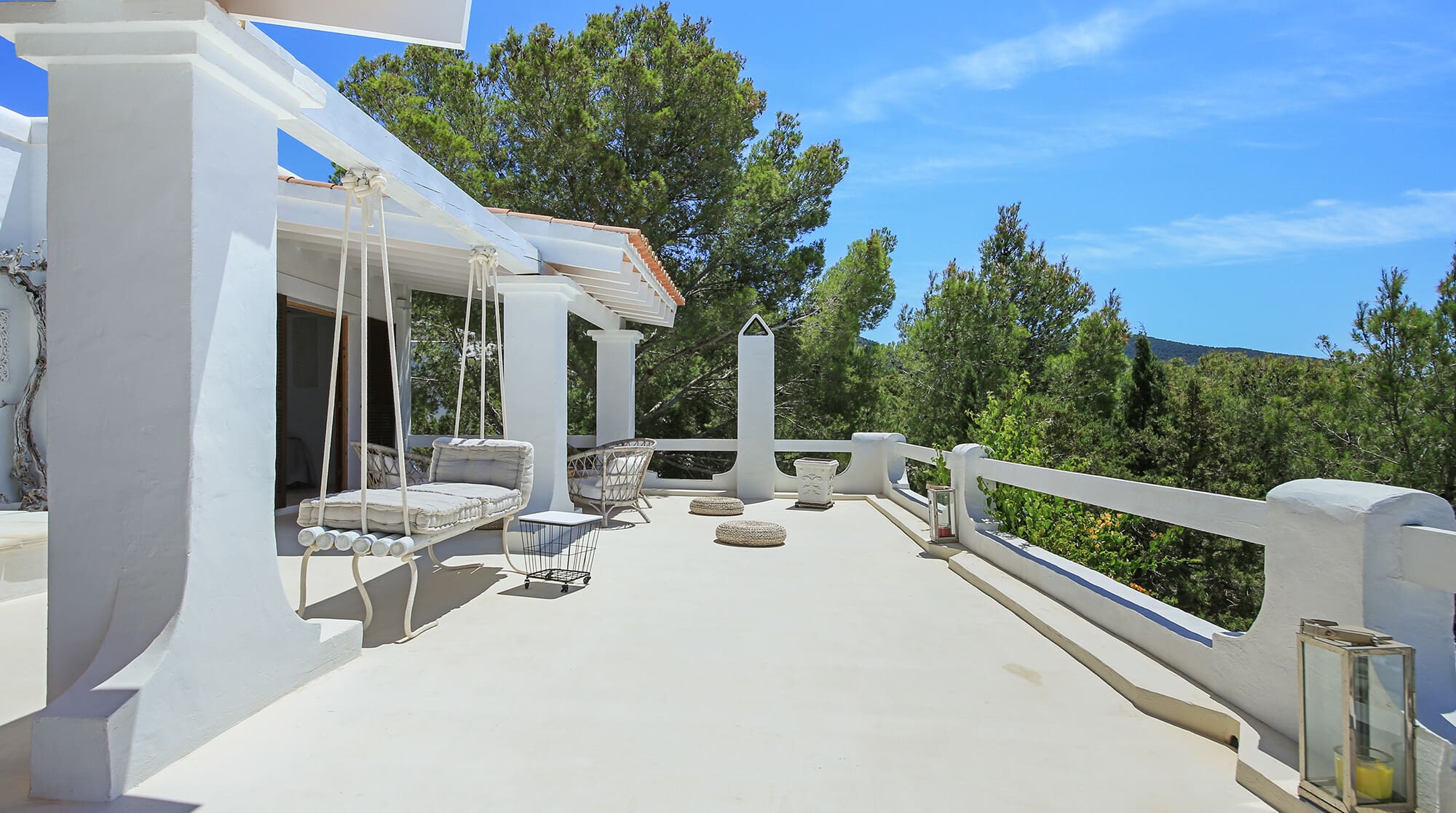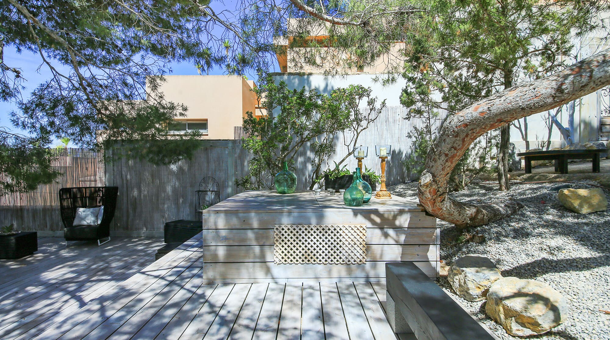 The villa’s outdoor spaces are designed for relaxation and enjoyment. A stunning swimming pool serves as the centerpiece, surrounded by elegant terraces perfect for sunbathing or dining alfresco. The lush gardens and patios offer various secluded spots to unwind, while the hot tub provides a serene space to gaze at the stars. Just a short stroll away, the pristine beaches of Ibiza beckon with their crystal-clear waters.