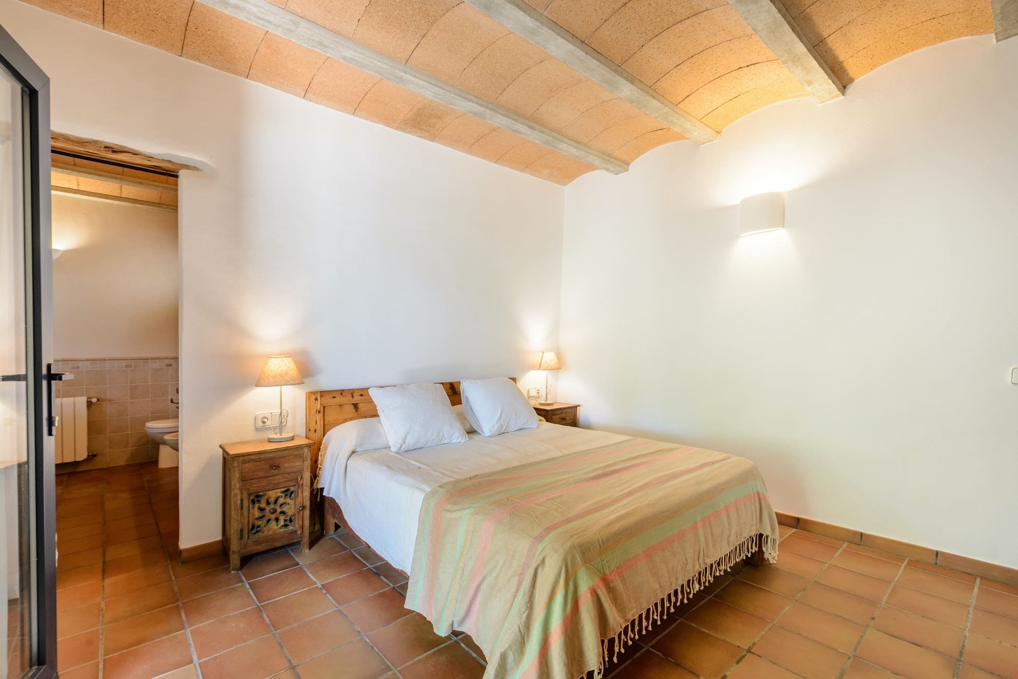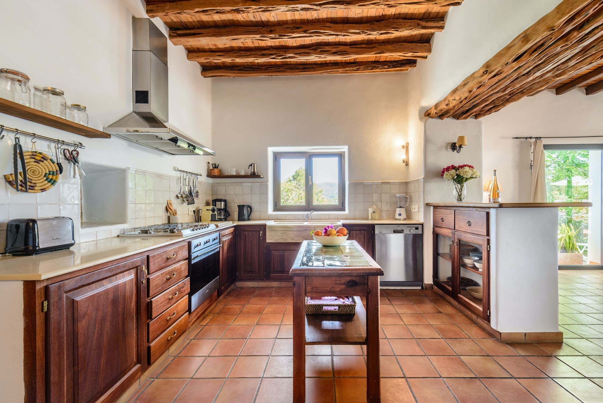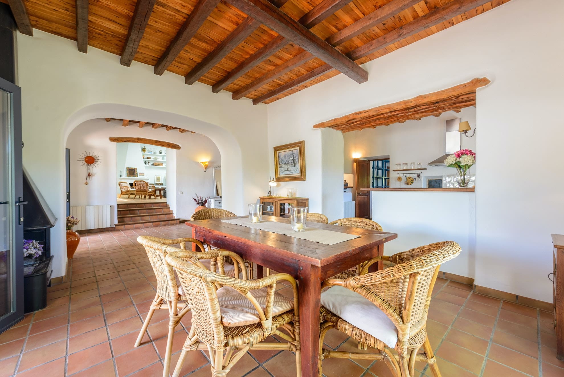 Inside, the Ibizan farmhouse style continues, with juniper wood ceilings, olive trunk beams and terracotta floors. There’s a pretty living room with a fireplace for winter stays and a big kitchen with everything you’ll need to cook at home. Opening to a spacious dining room and out to the terrace, there’s a lovely, sociable flow. But you may choose to cook outdoors at the summer kitchen, where you can barbecue surrounded by nature.