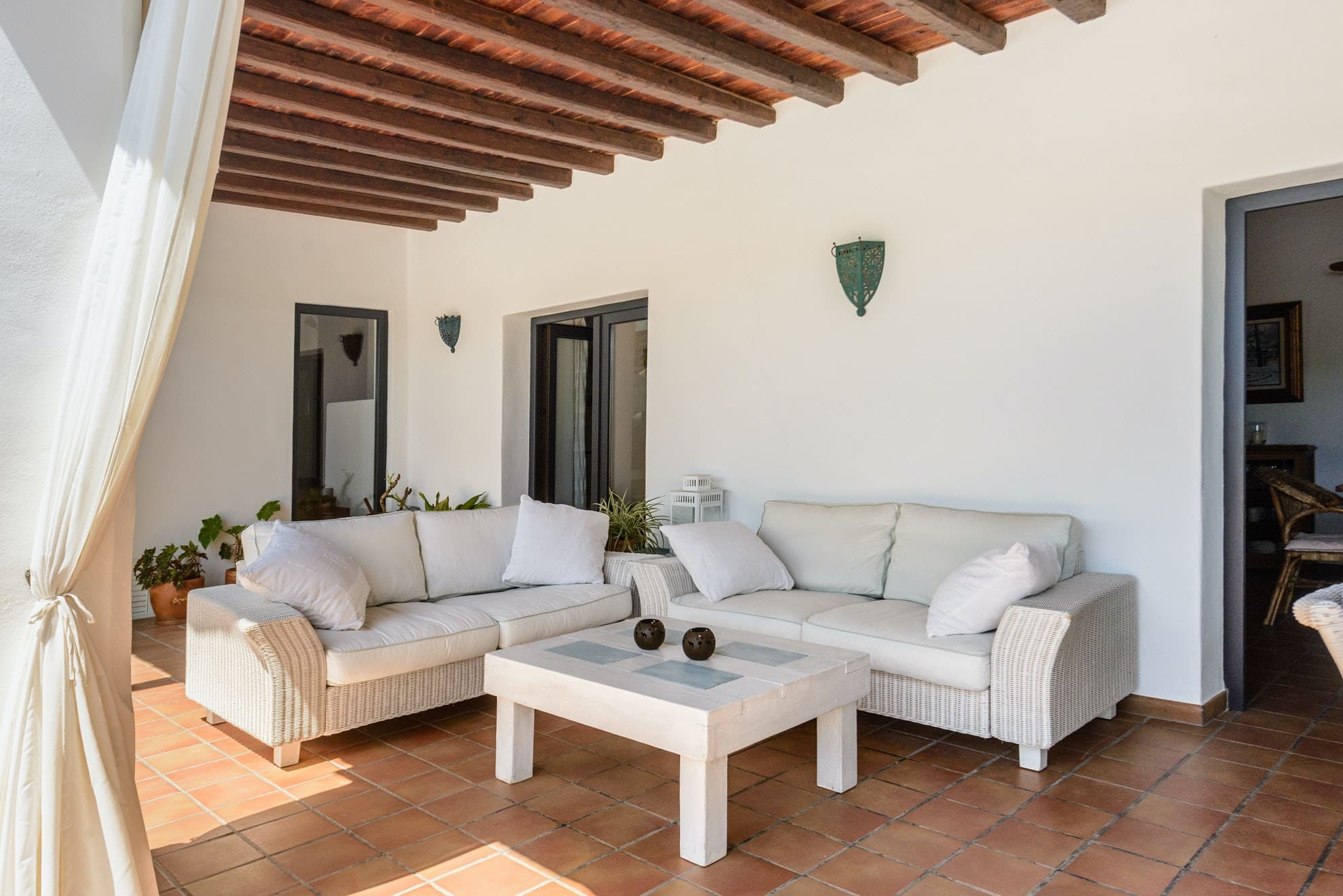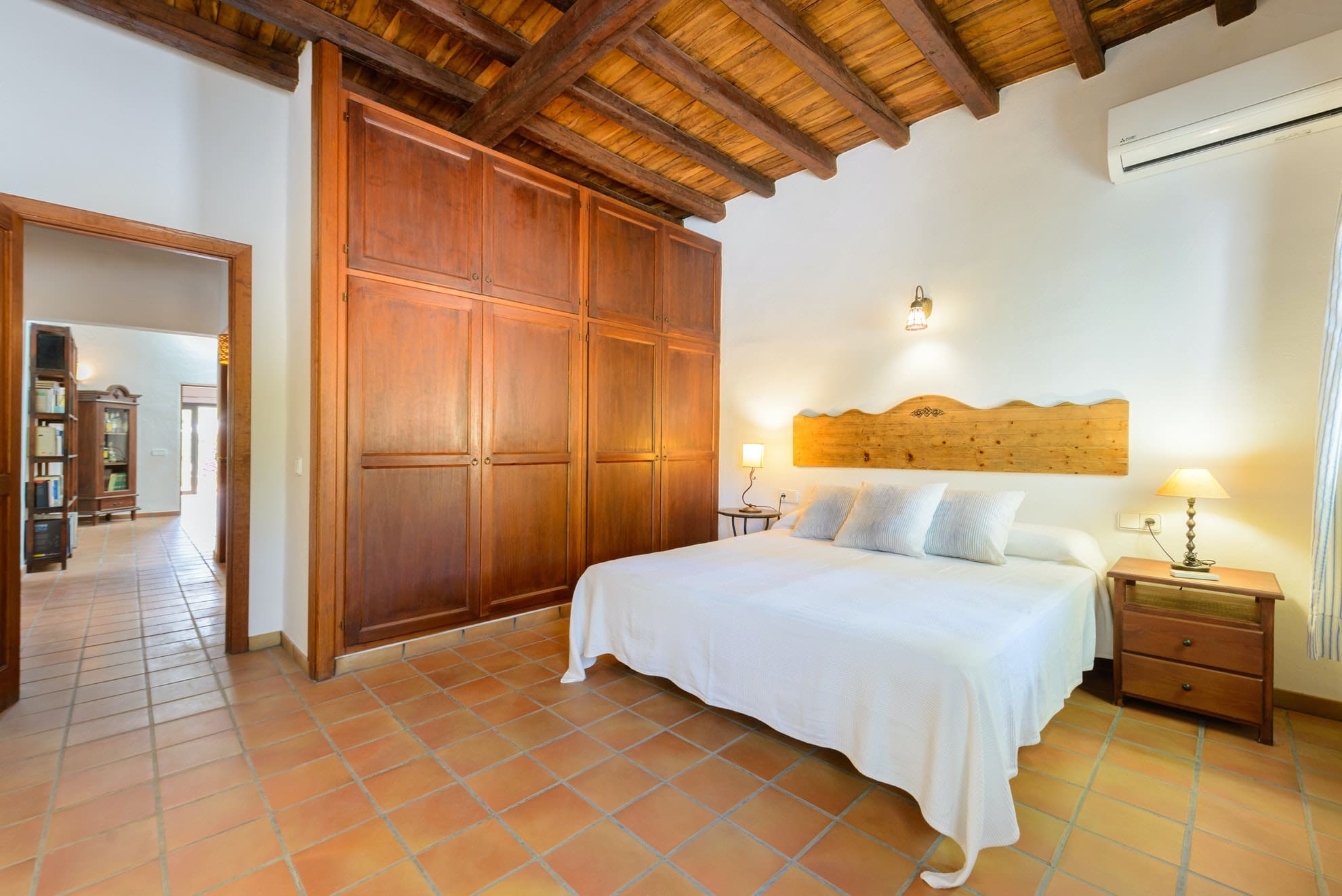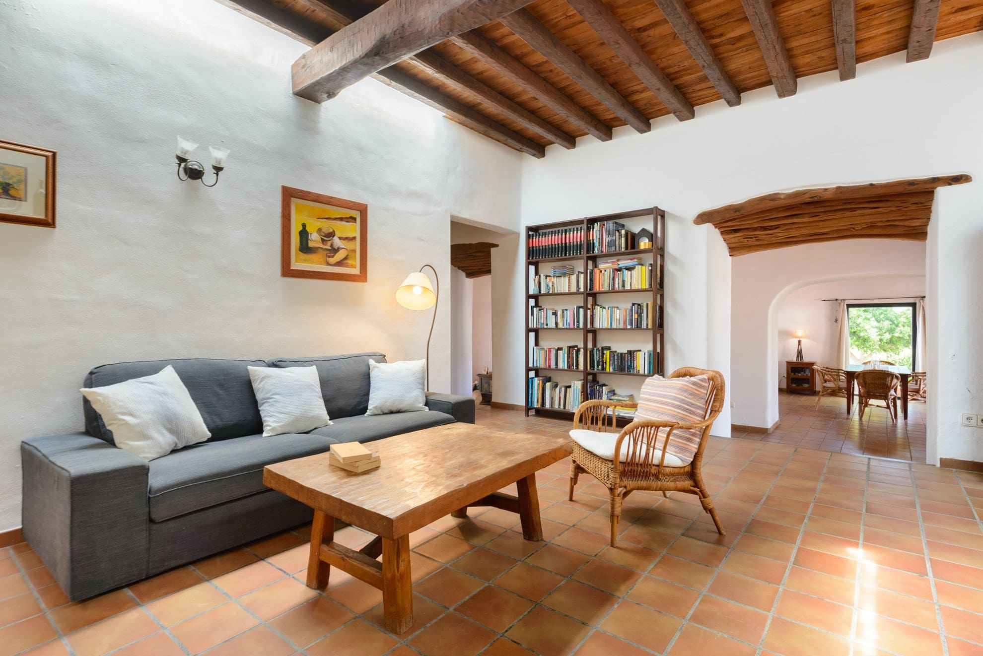 Inside, the Ibizan farmhouse style continues, with juniper wood ceilings, olive trunk beams and terracotta floors. There’s a pretty living room with a fireplace for winter stays and a big kitchen with everything you’ll need to cook at home. Opening to a spacious dining room and out to the terrace, there’s a lovely, sociable flow. But you may choose to cook outdoors at the summer kitchen, where you can barbecue surrounded by nature.