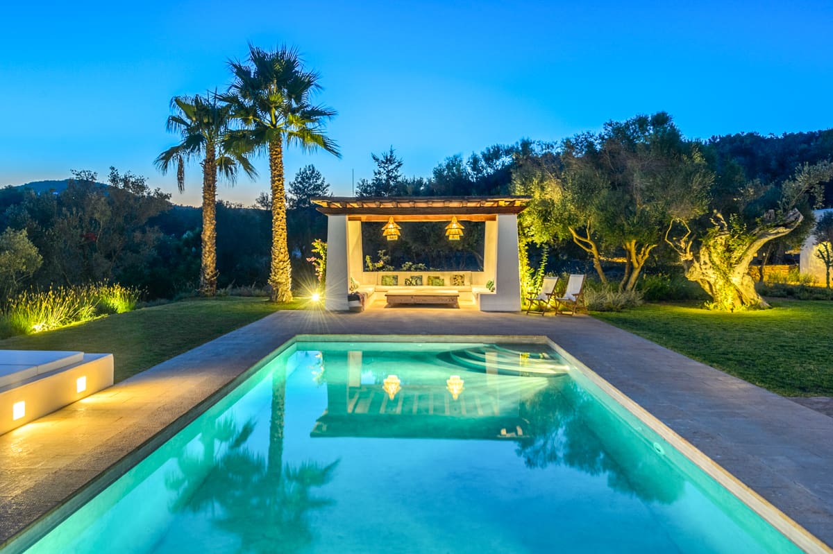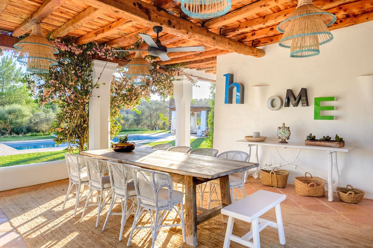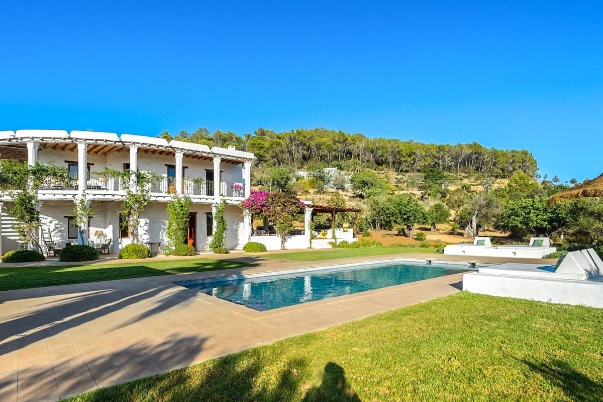 Villa Balafia’s open-air spaces are pristine, featuring perfectly manicured lawn areas and a huge covered terrace that incorporates both a cosy lounge space and an alfresco dining area. The centrepiece of the grounds is a large private pool, which is easily accessible via steps and is surrounded by luxurious day beds and a pretty pergola that houses a comfy chillout area. It’s the perfect spot for enjoying after-drinks and conversation or relaxing with a good book as you soak up your magnificent surroundings on one of the most beautiful and idyllic parts of the island.Villa Balafia is a visually stunning architectural masterpiece nestled in the beautiful hamlet of San Llorenc on the island of Ibiza. Showcasing luscious rural views and accommodating up to ten guests across five luxurious bedrooms, this incredible property is the perfect island retreat for anyone who truly wants to get away from it all. Featuring an elegantly decorated interior, immaculate gardens, and a private pool, a stay at Villa Balafia is sure to be a memorable experience that you’ll be talking about for years to come!