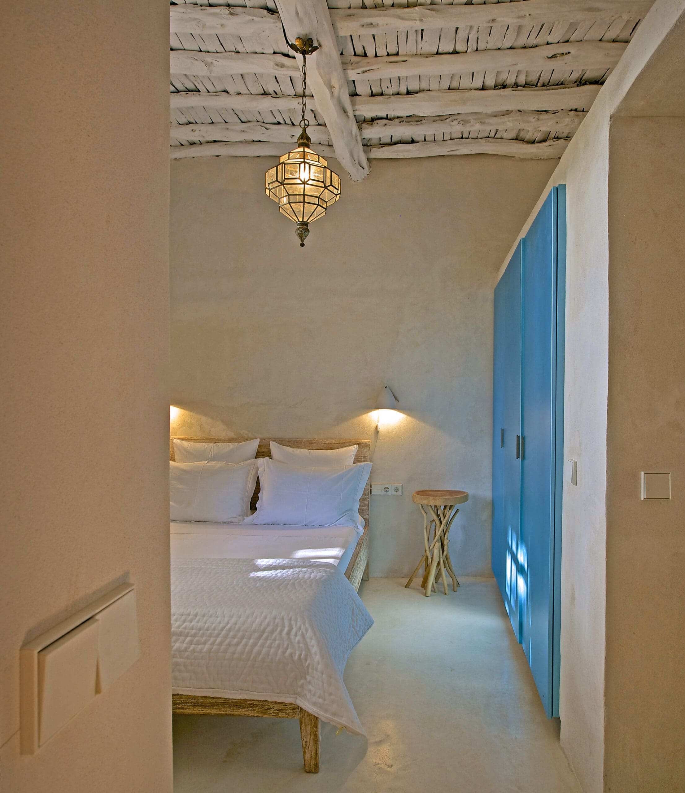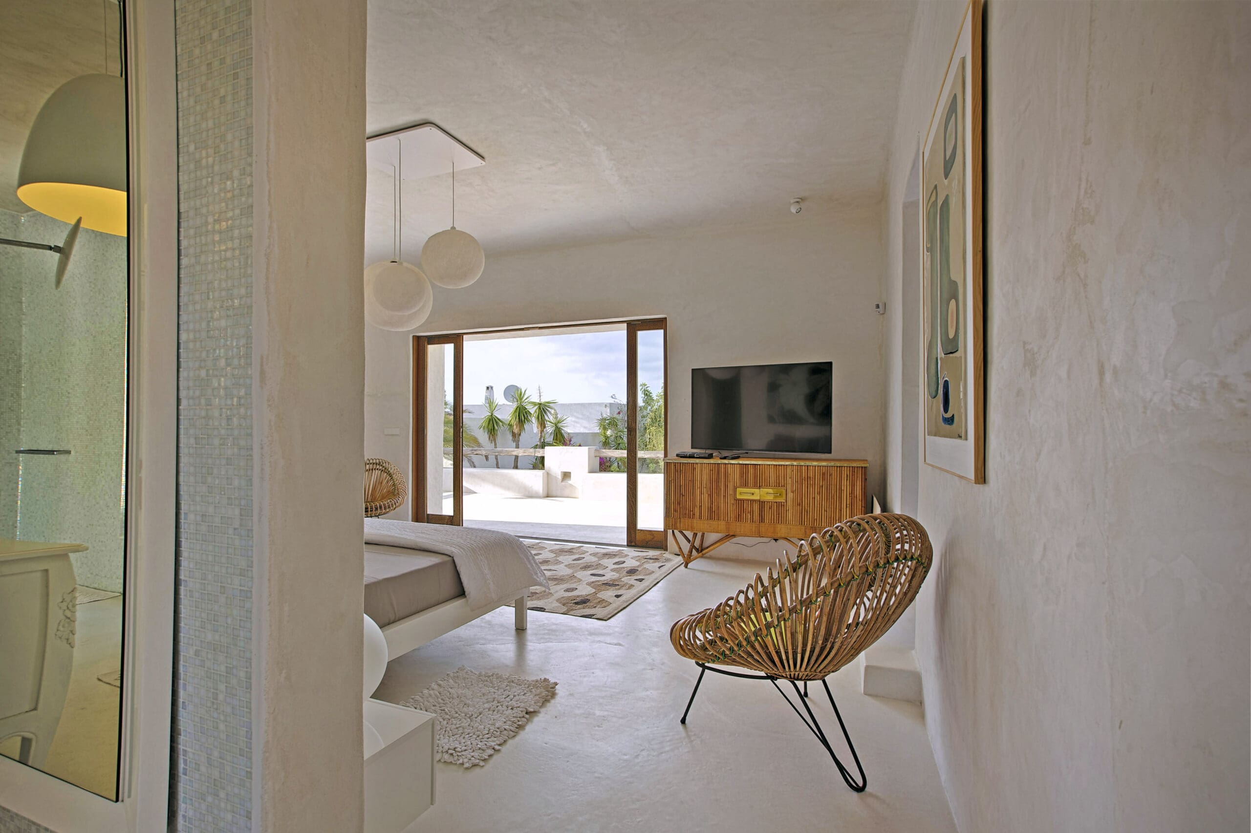 The beautifully bold artwork throughout the stylish villa stands out against the authenticity of the white wash walls, natural stone flooring and wooden beams, creating a bohemian, tranquil vibe for a peaceful holiday.