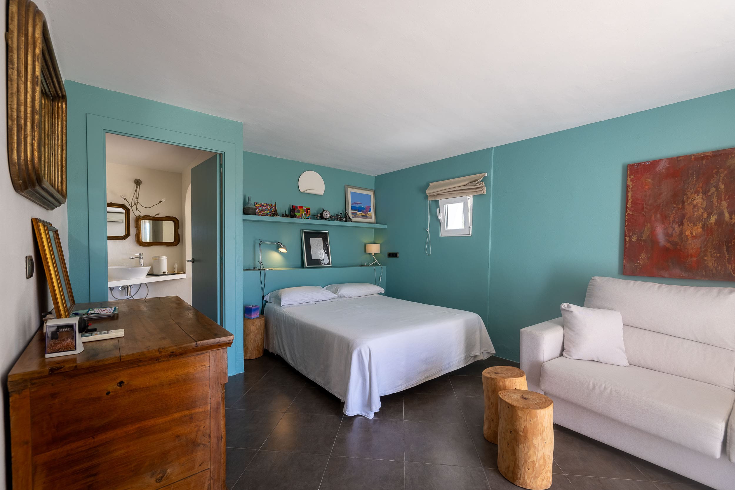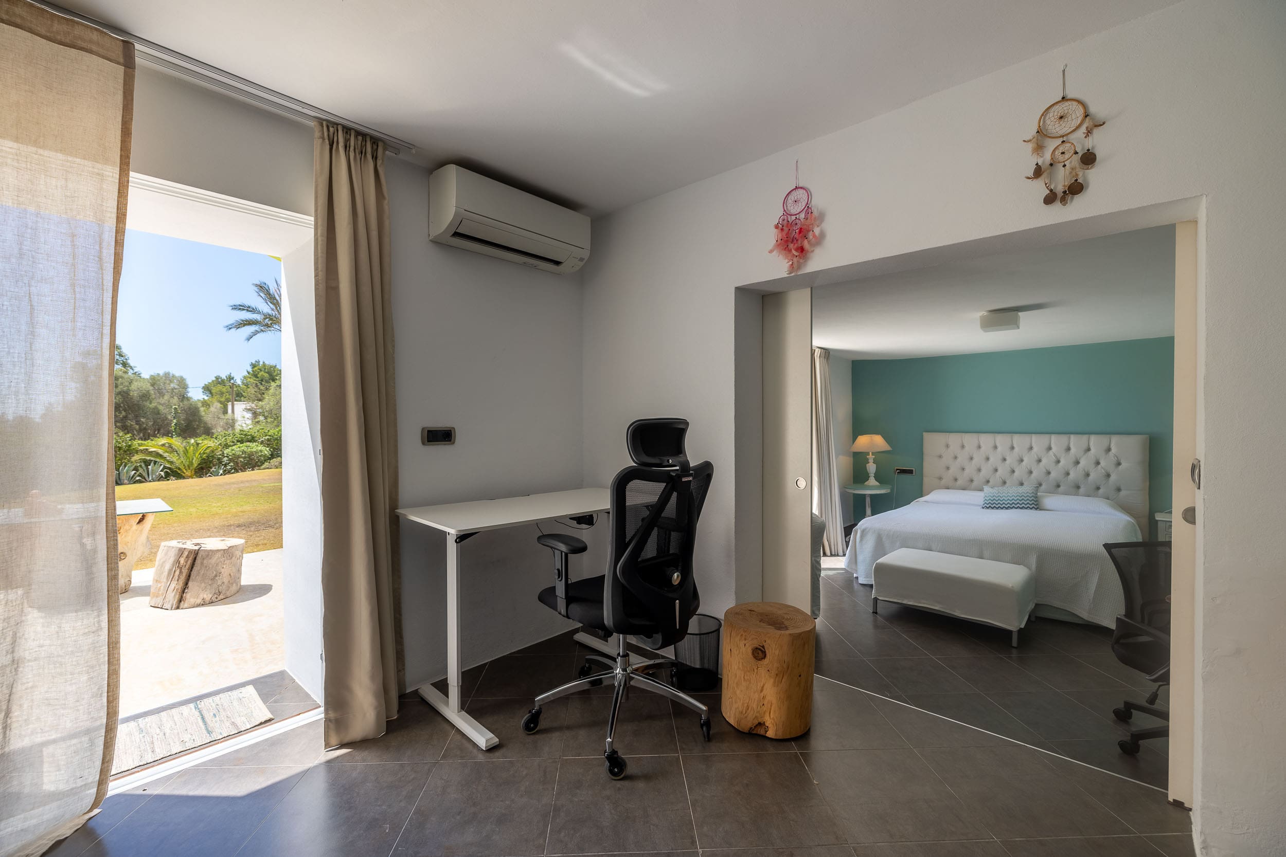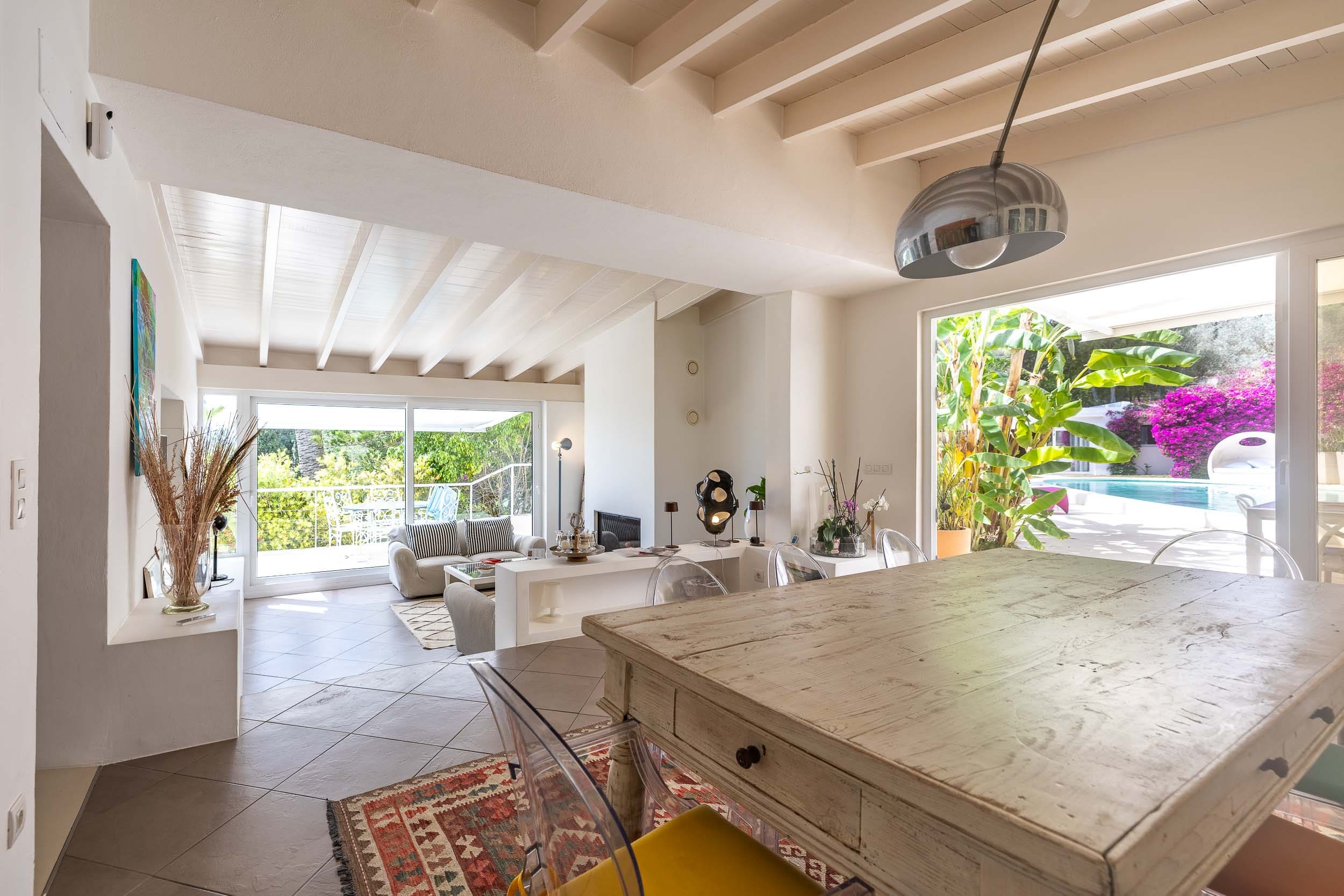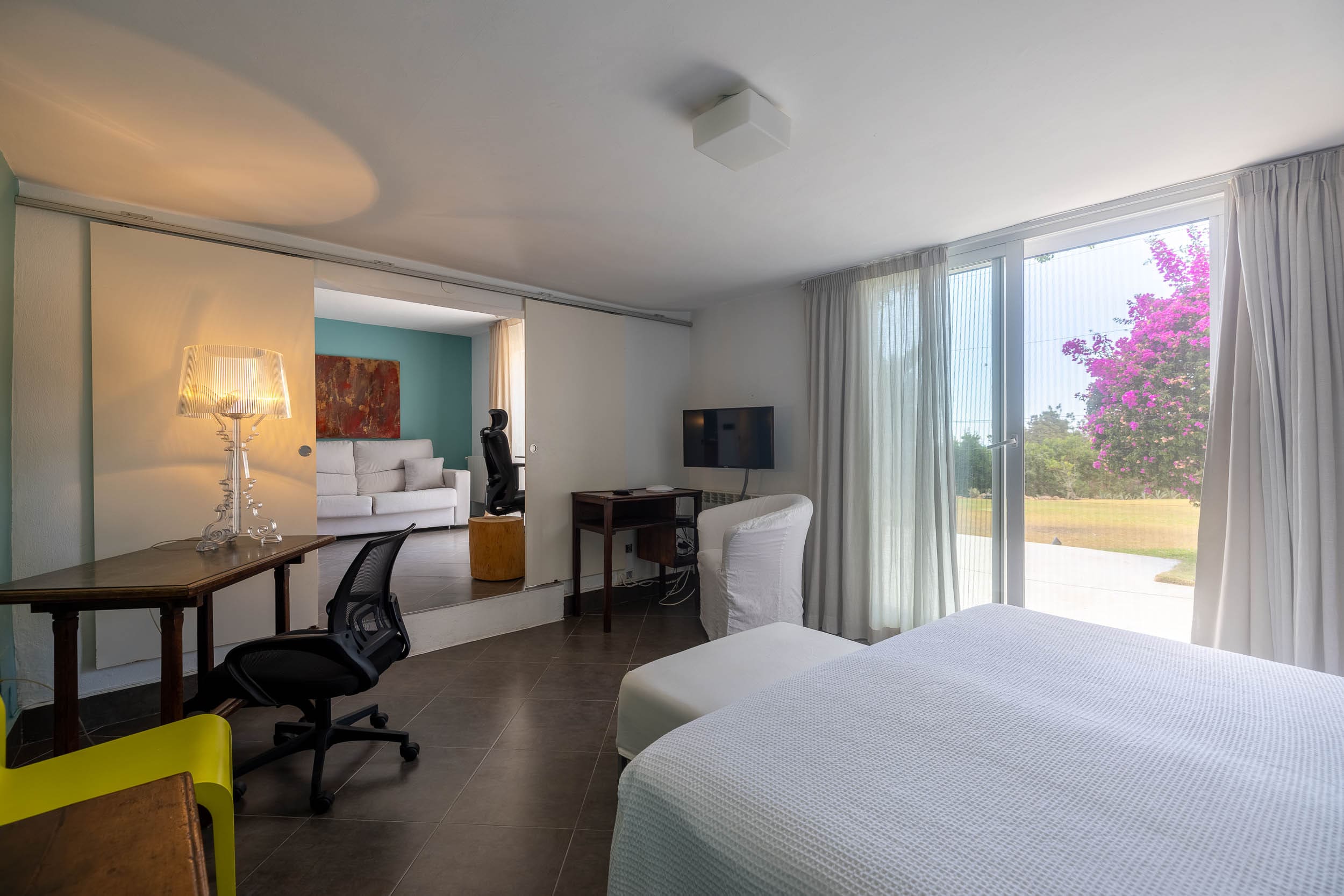 The villa’s outdoor spaces are truly exceptional. The private swimming pool invites you for a refreshing dip, while the surrounding terrace offers multiple spots for sunbathing or enjoying a Mediterranean-style alfresco lunch. As you relax in the garden, take in the breathtaking views of the sea and the lush Ibiza landscape. The villa’s proximity to the beach allows for spontaneous seaside adventures.