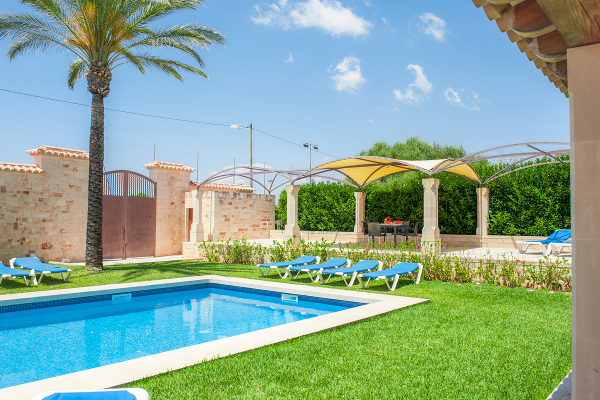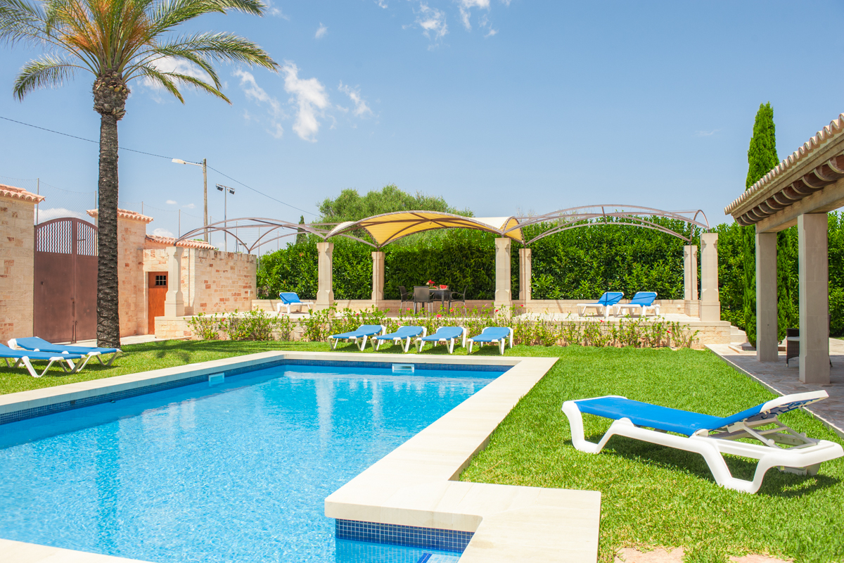 This stunning villa is tucked away in the small town of Es Llombards putting all the necessary amenities at your fingertips, yet feels as secluded as a country manor with the walled garden providing a private, luxurious space for relaxation and enjoyment. The beautiful grounds, including a large pool, stretch out to allow you to feel utterly alone and at peace with the utmost privacy. Cool off from the heat of the Spanish sun in your private pool after relaxing on one of the many loungers around the garden before retiring to one of the many cool, shaded zones.