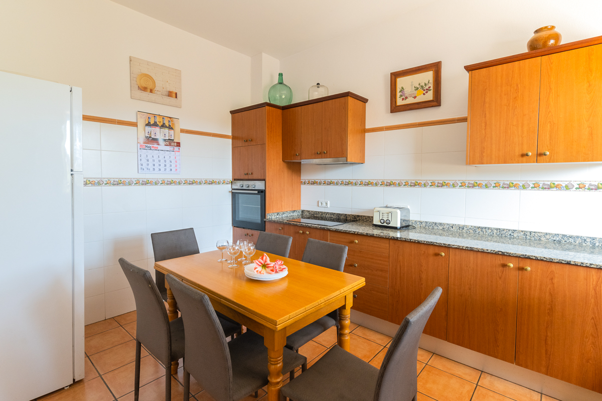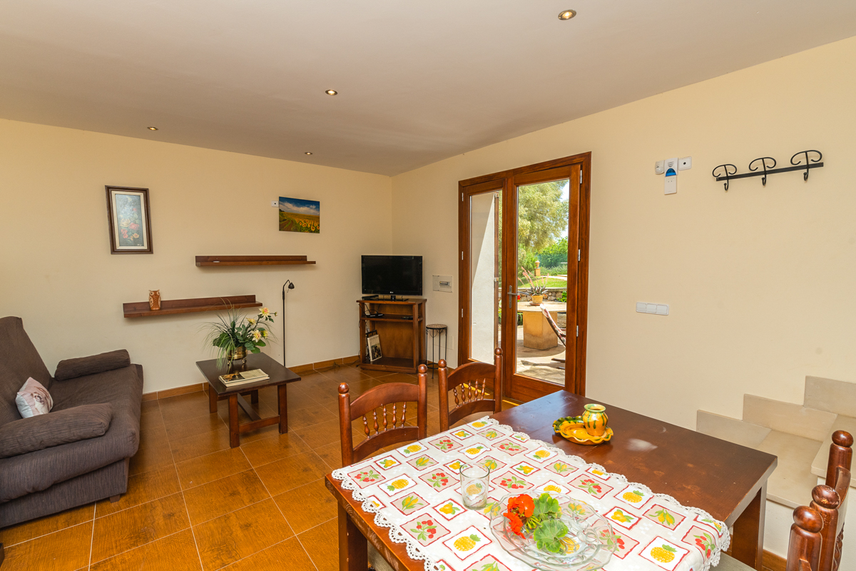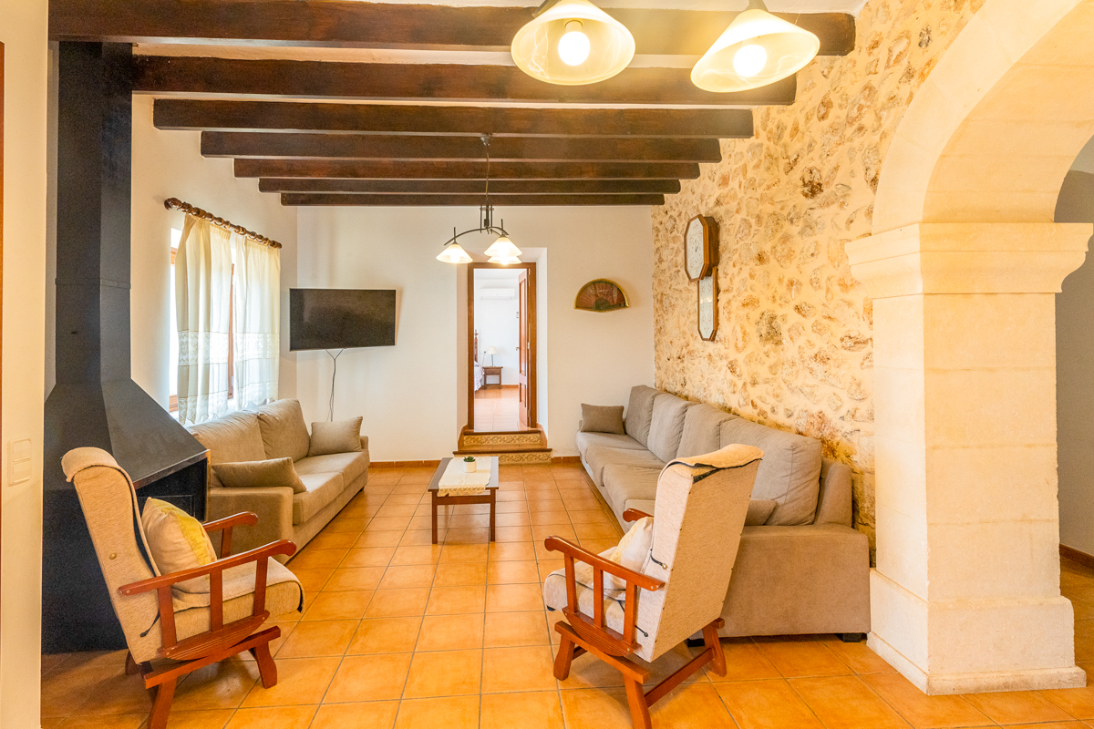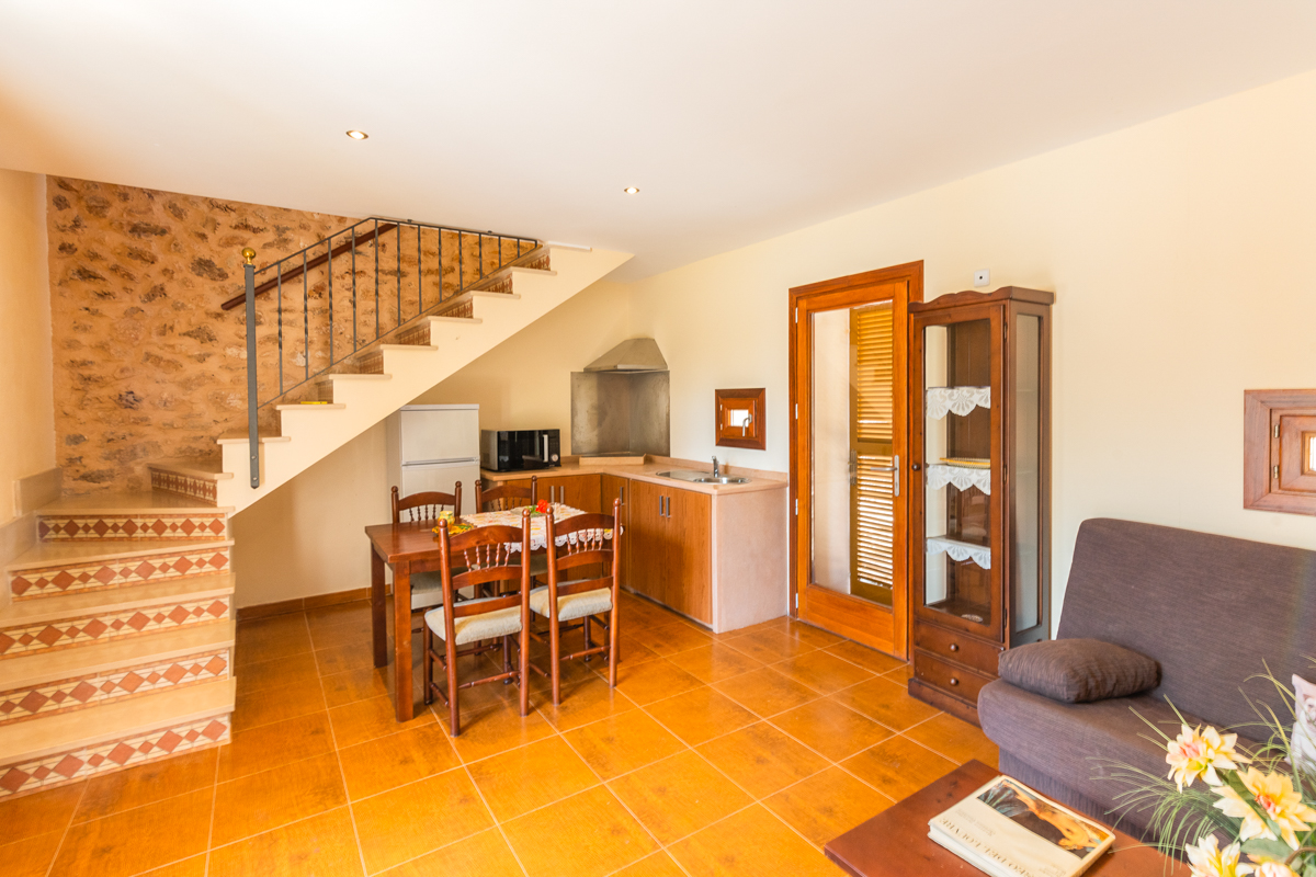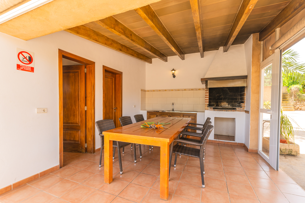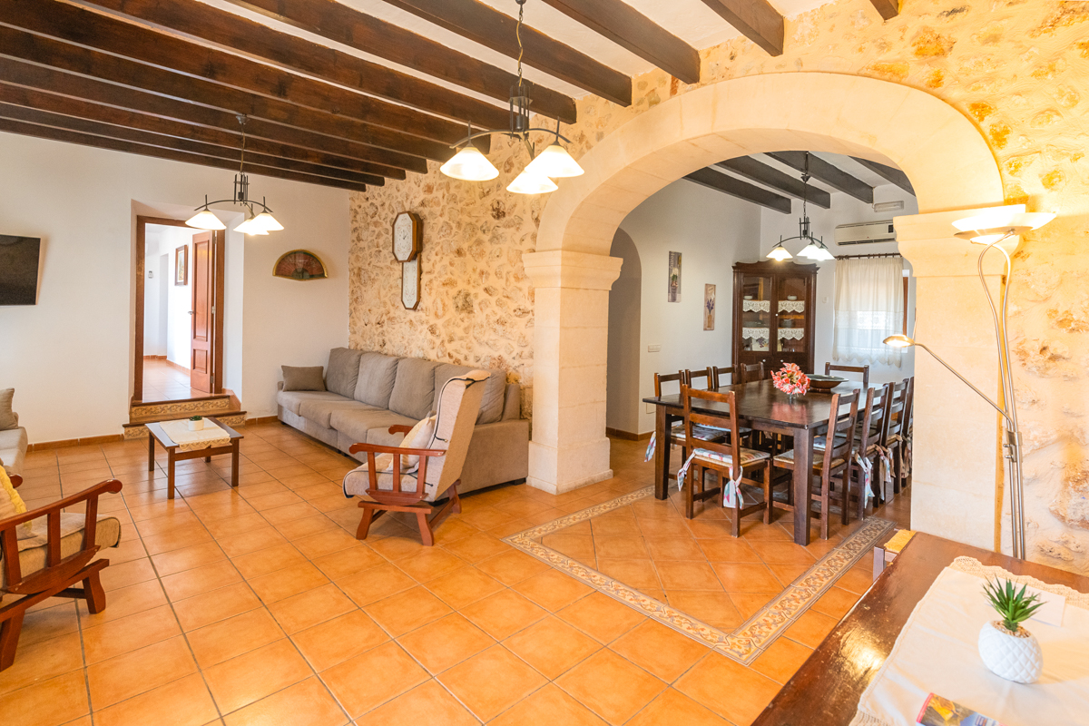 The living space in Finca Xorca is very large and spacious. The area is true to the rustic theme, as exposed wooden beams and a log fireplace really emphasise the cosy feel of the area and make you feel at home. There are large sofas for you to enjoy and cosy cushions encouraging you to sink in and socialise during your downtime. There is both a TV and iPod dock in the living space, so you can watch some shows or listen to your favourite tunes!