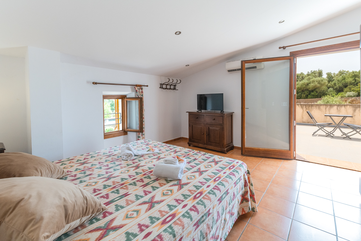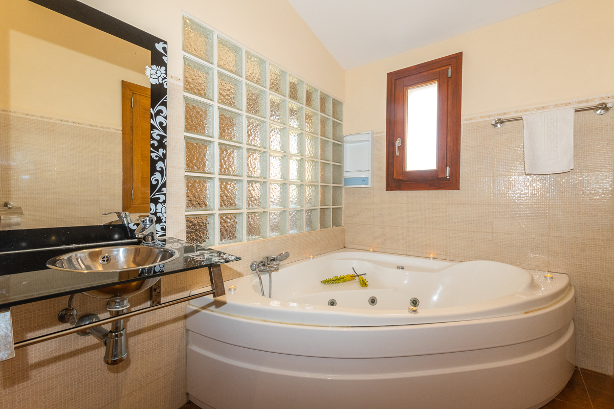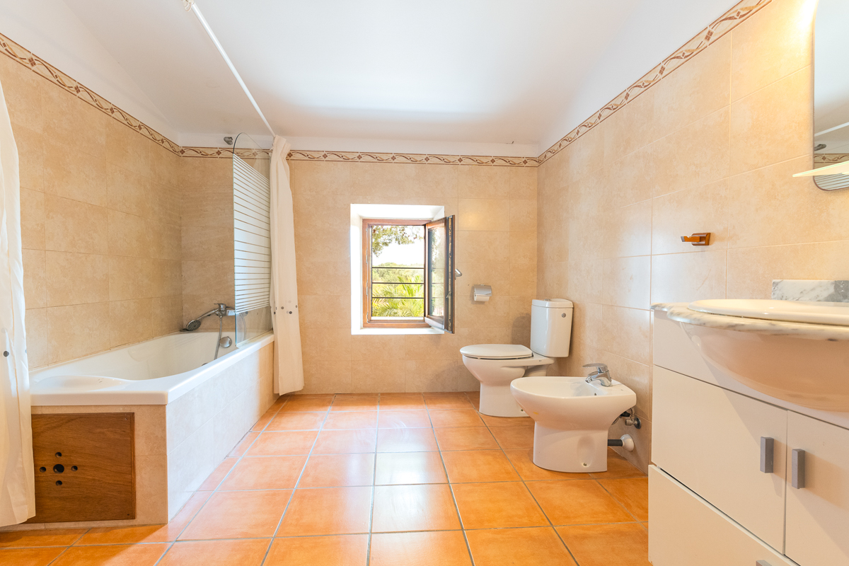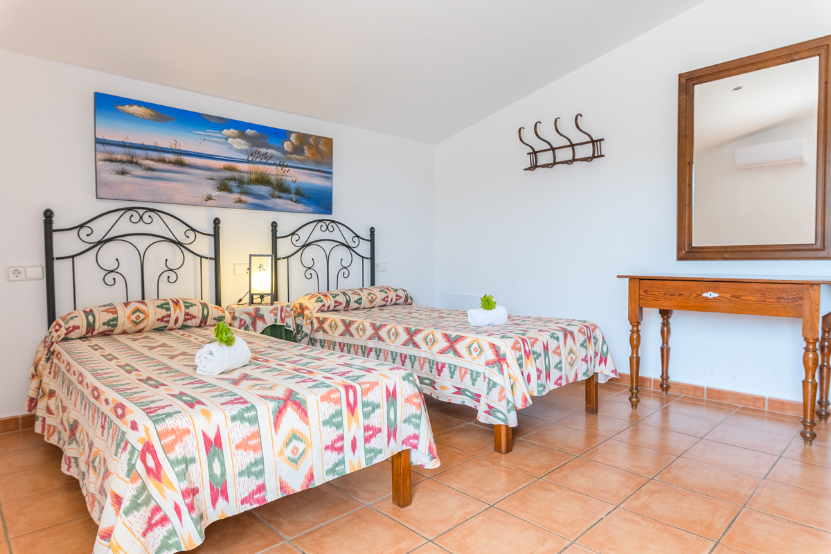 There are a total of five bedrooms in Finca Xorca, three twin rooms and two double bedrooms. On the ground floor, you will find one of the doubles and one twin, and the upper floor is host to the other three bedrooms. Every bedroom in this home is en suite, which is not only a wonderful added privacy but is also sure to cut down queue times in the morning! Each room is very spacious and airy, with cosy furnishing and air conditioning units. All but one of the upstairs twins also come with wardrobe space so you can fully settle in during your stay.