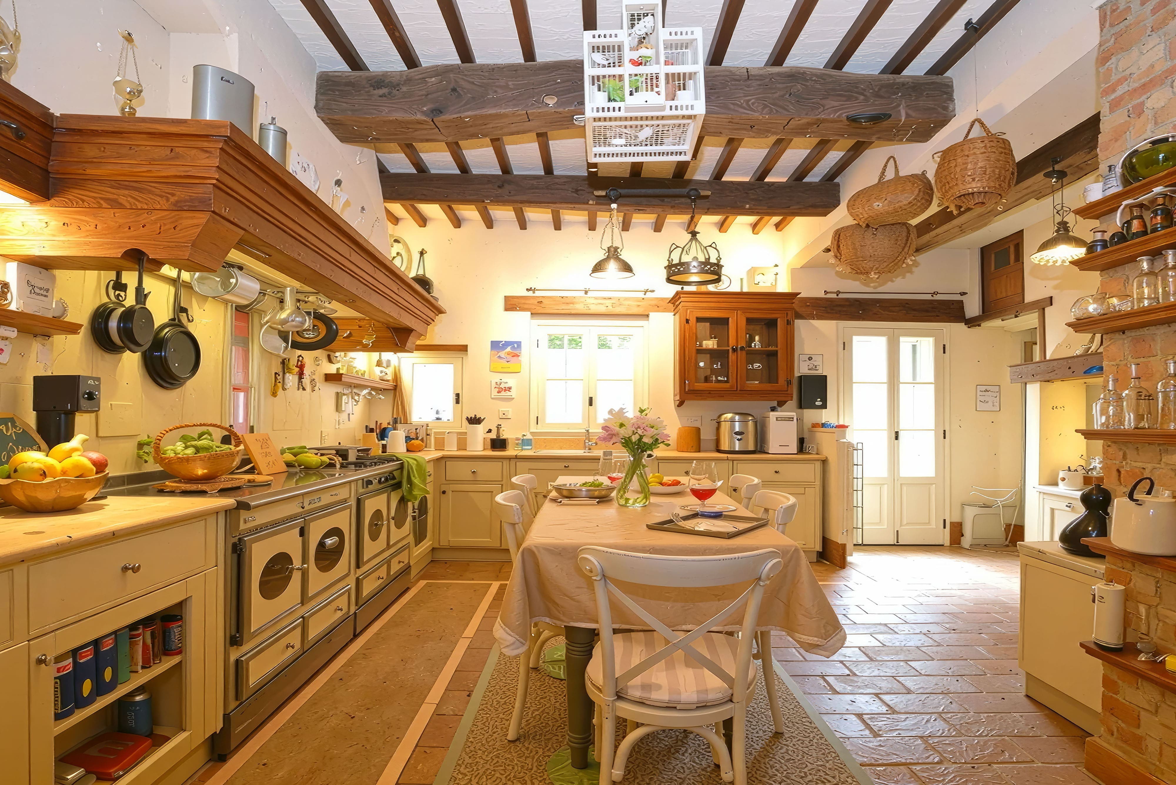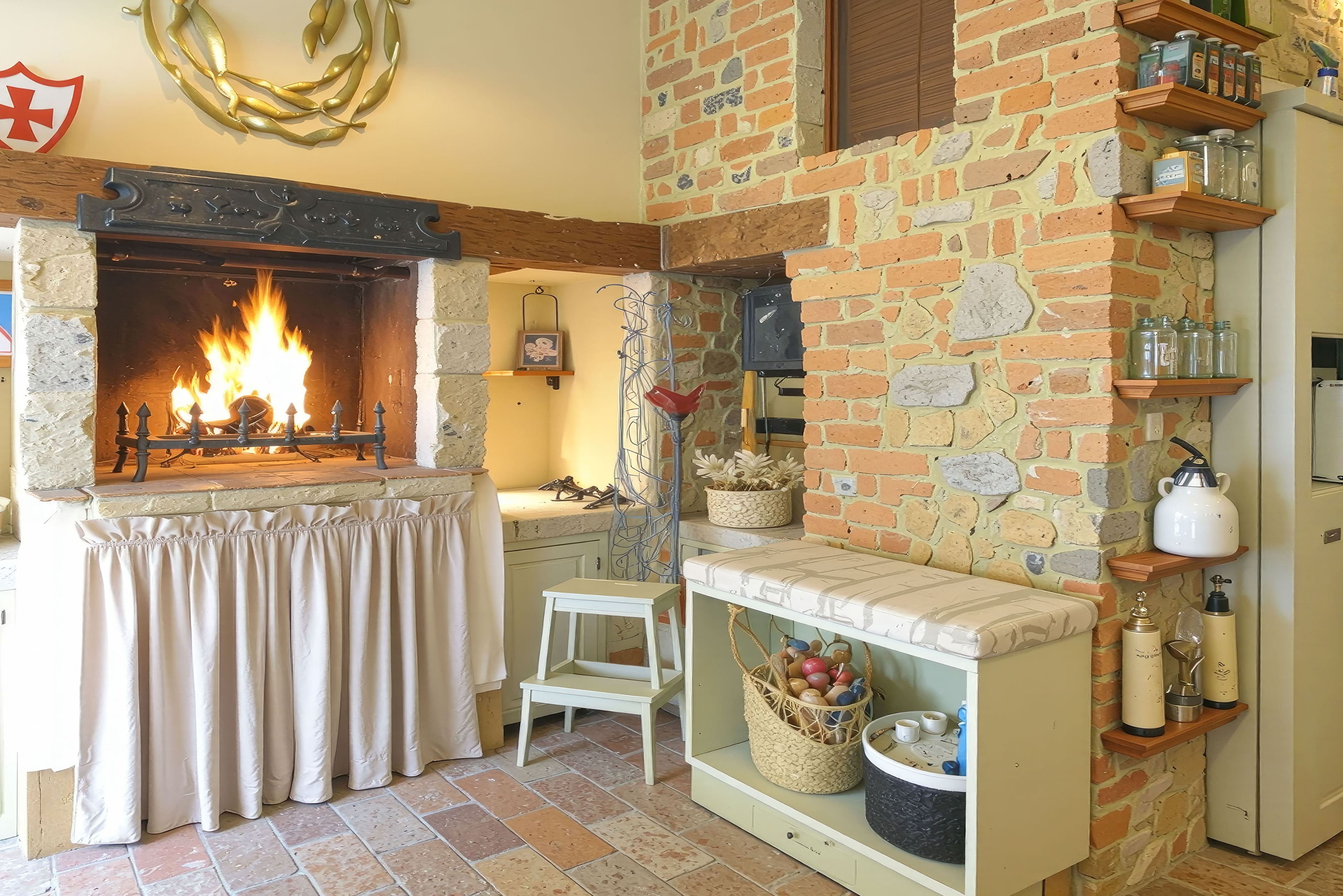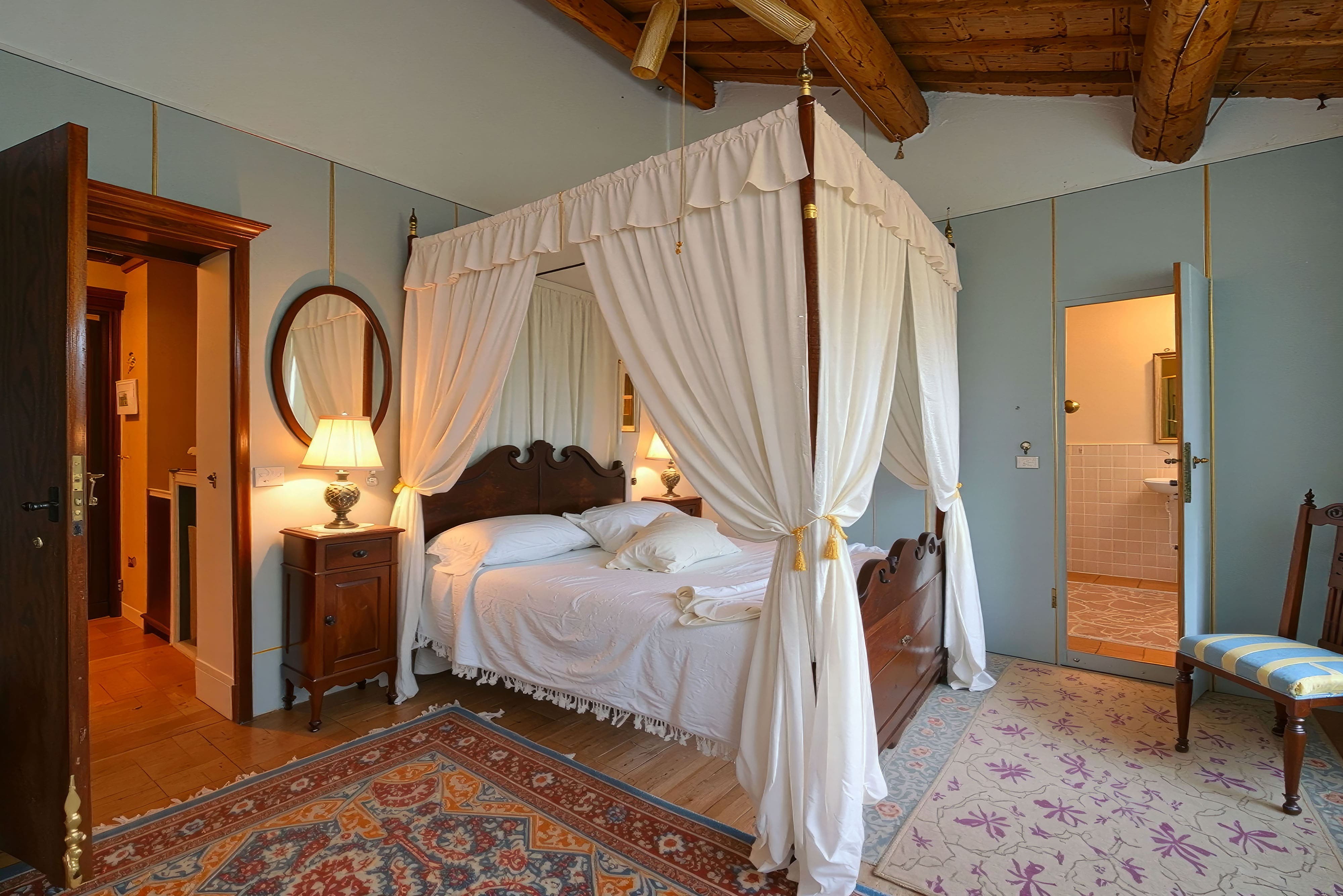The villa’s interiors blend classic Italian design with contemporary comfort, featuring spacious living areas adorned with period furnishings and rustic stone fireplaces. The fully-equipped kitchen is a culinary haven, perfect for crafting Italian feasts. Each of the five bedrooms offers a private sanctuary with en-suite bathrooms, ensuring comfort and privacy. One bedroom can be customized as a twin or double, catering to your group’s needs.