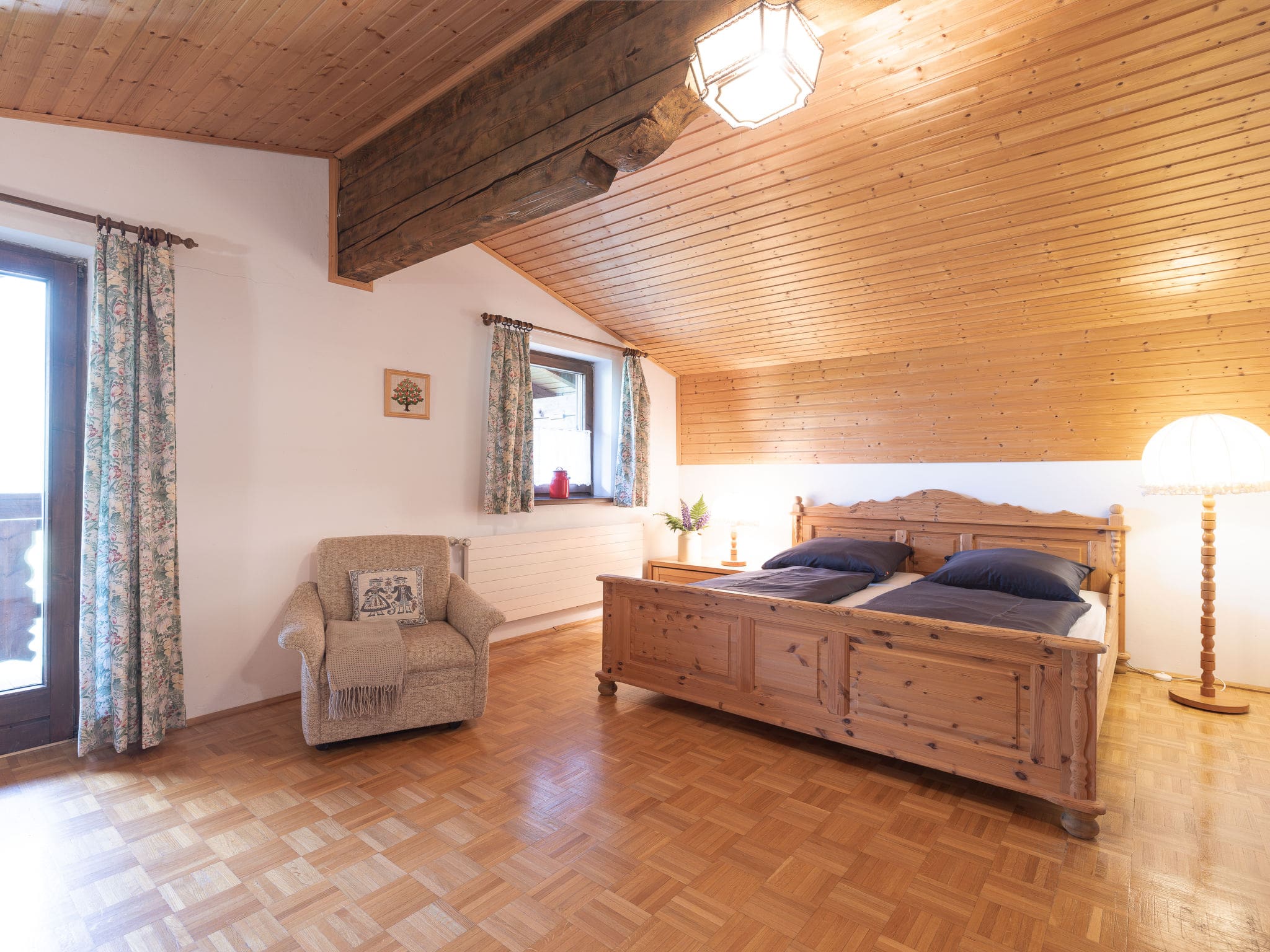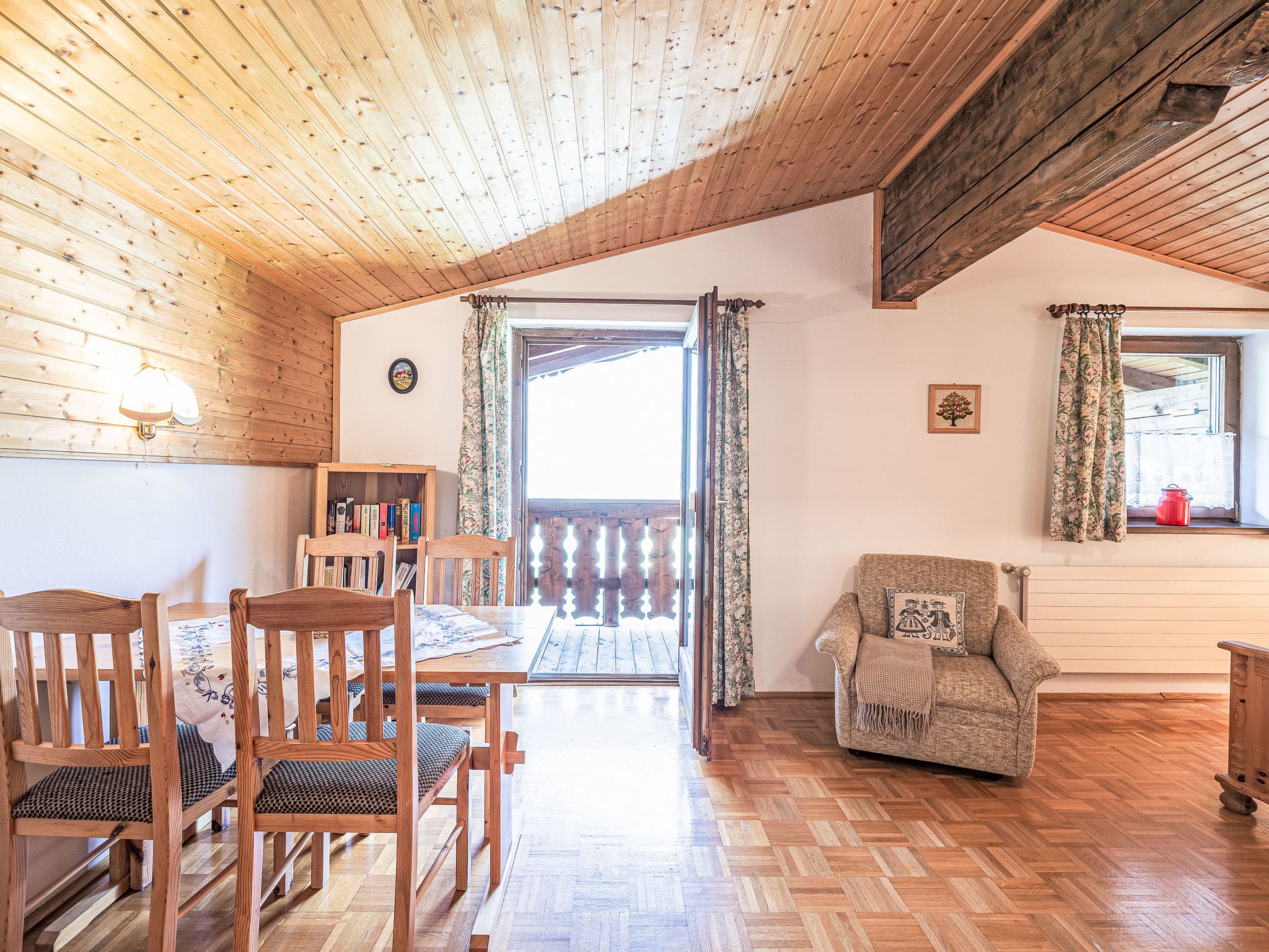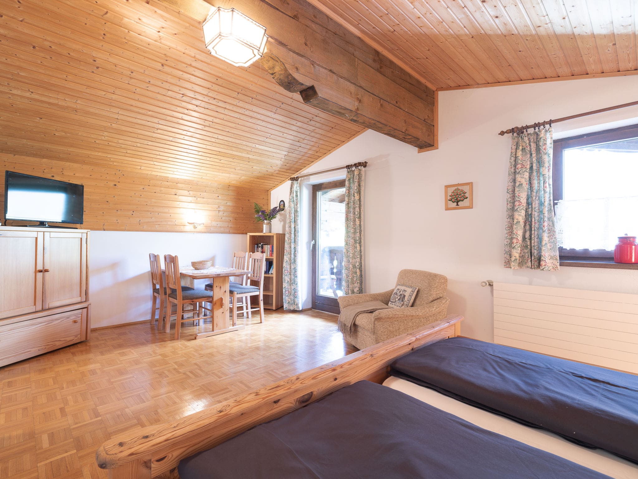 This thoughtfully designed 30-square-meter studio maximizes every inch of space while maintaining an atmosphere of alpine elegance. The open-plan living area combines sleeping and lounging areas around a comfortable double bed, with a dining table positioned to capture the spectacular mountain vistas through large windows. The flat-screen satellite television offers international channels for quiet evenings, while the practical kitchenette features four hot plates, an oven, toaster, kettle, and electric coffee machine for preparing meals after days on the slopes. The shower room provides modern conveniences, and oil heating ensures year-round comfort. Beautiful parquet flooring adds warmth throughout, while the private balcony with outdoor furniture becomes your personal viewing platform for the dramatic alpine panorama.