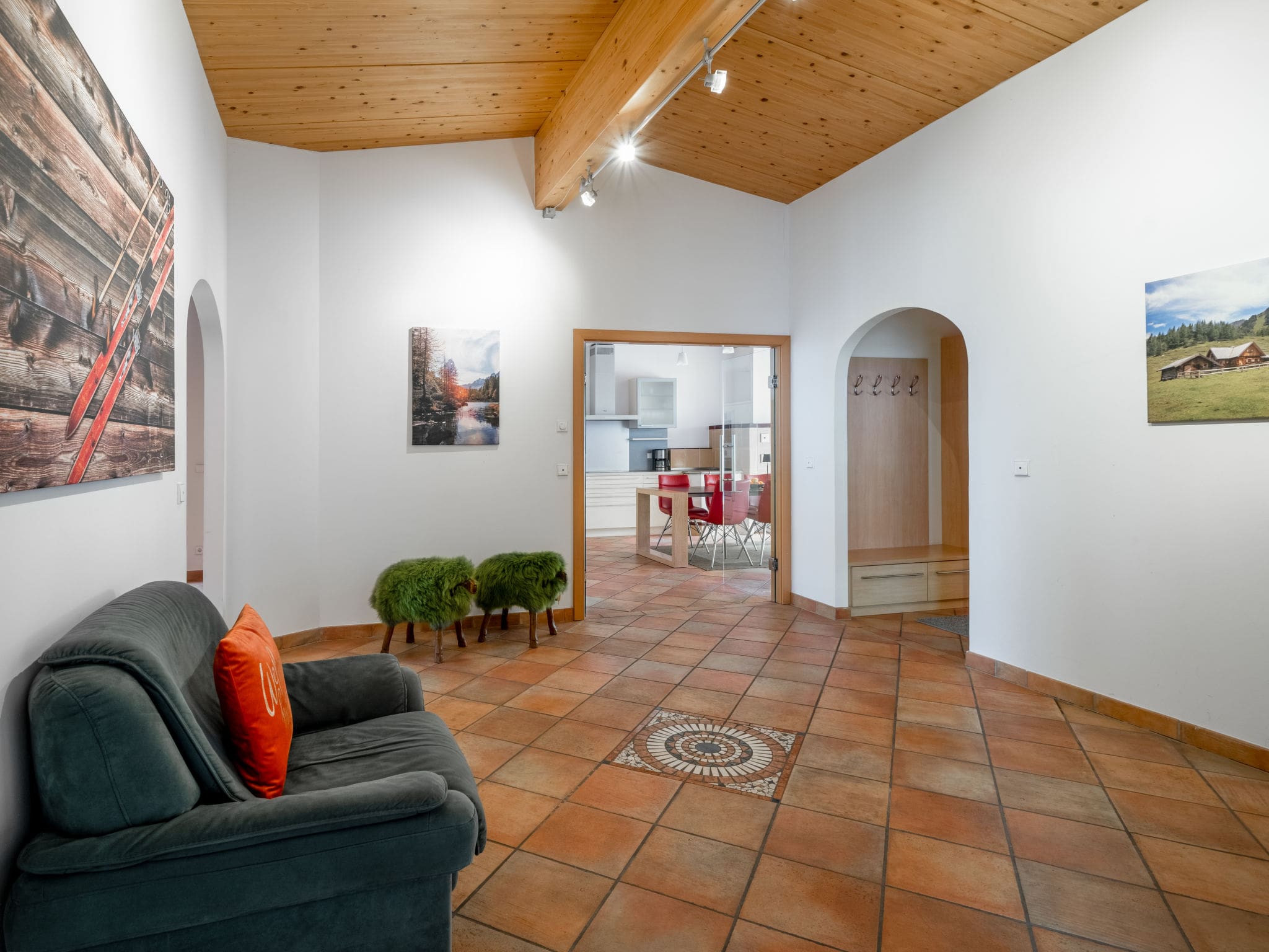 The large terrace serves as an outdoor sanctuary, perfectly positioned to capture the day’s sunshine while offering uninterrupted views of the Schladming valley and surrounding alpine landscape. Furnished for outdoor dining and relaxation, this elevated vantage point provides front-row seats to the dramatic mountain scenery that defines this region. During winter months, guests can watch skiers navigate the illuminated slopes, while summer reveals hiking trails weaving through emerald valleys and rocky peaks.