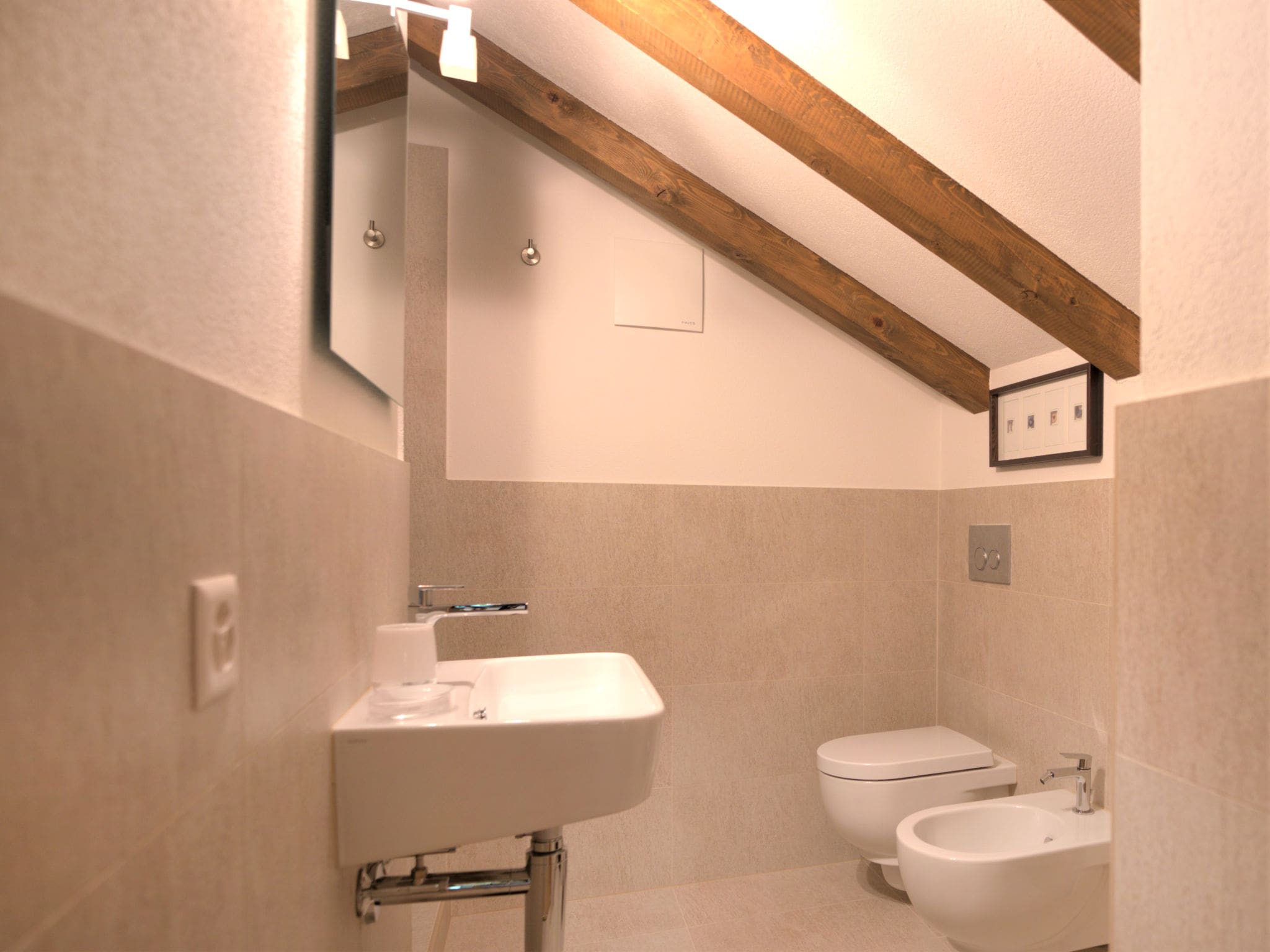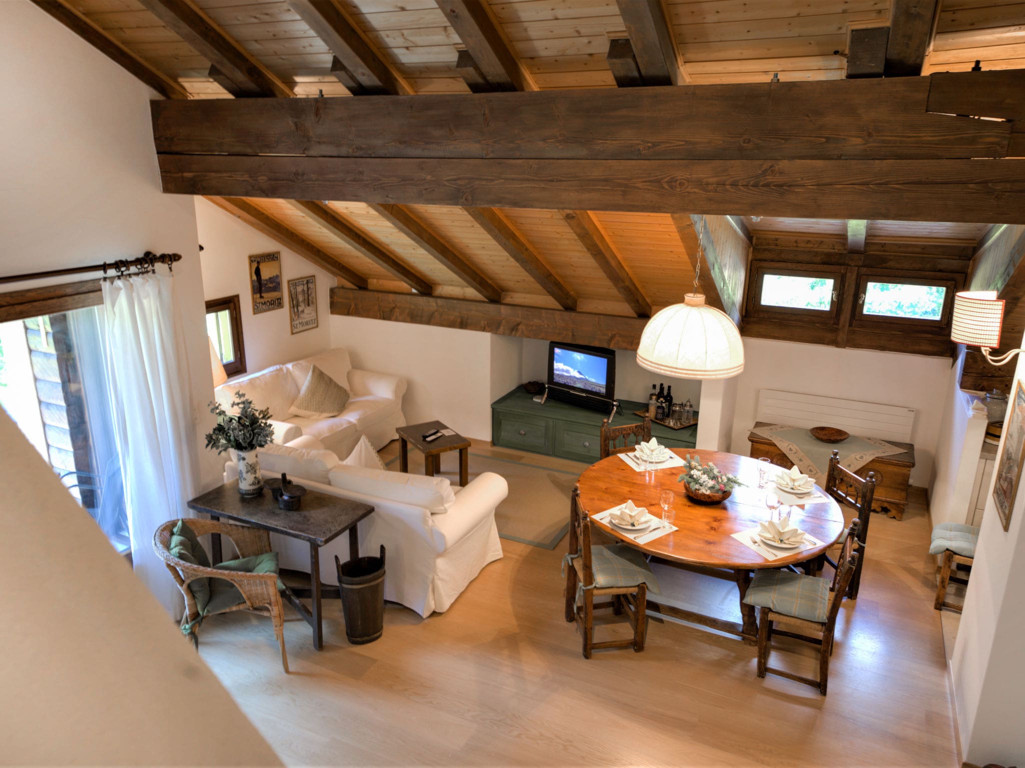 The accommodation comprises two comfortable bedrooms, including one with a luxurious French bed and a spacious master bedroom with a double bed. The apartment has been partially renovated to blend traditional Alpine character with contemporary amenities, featuring beautiful wooden floors throughout and double-glazed windows that frame the spectacular mountain vistas. A small gallery on the upper level adds extra charm and space to this delightful mountain retreat.