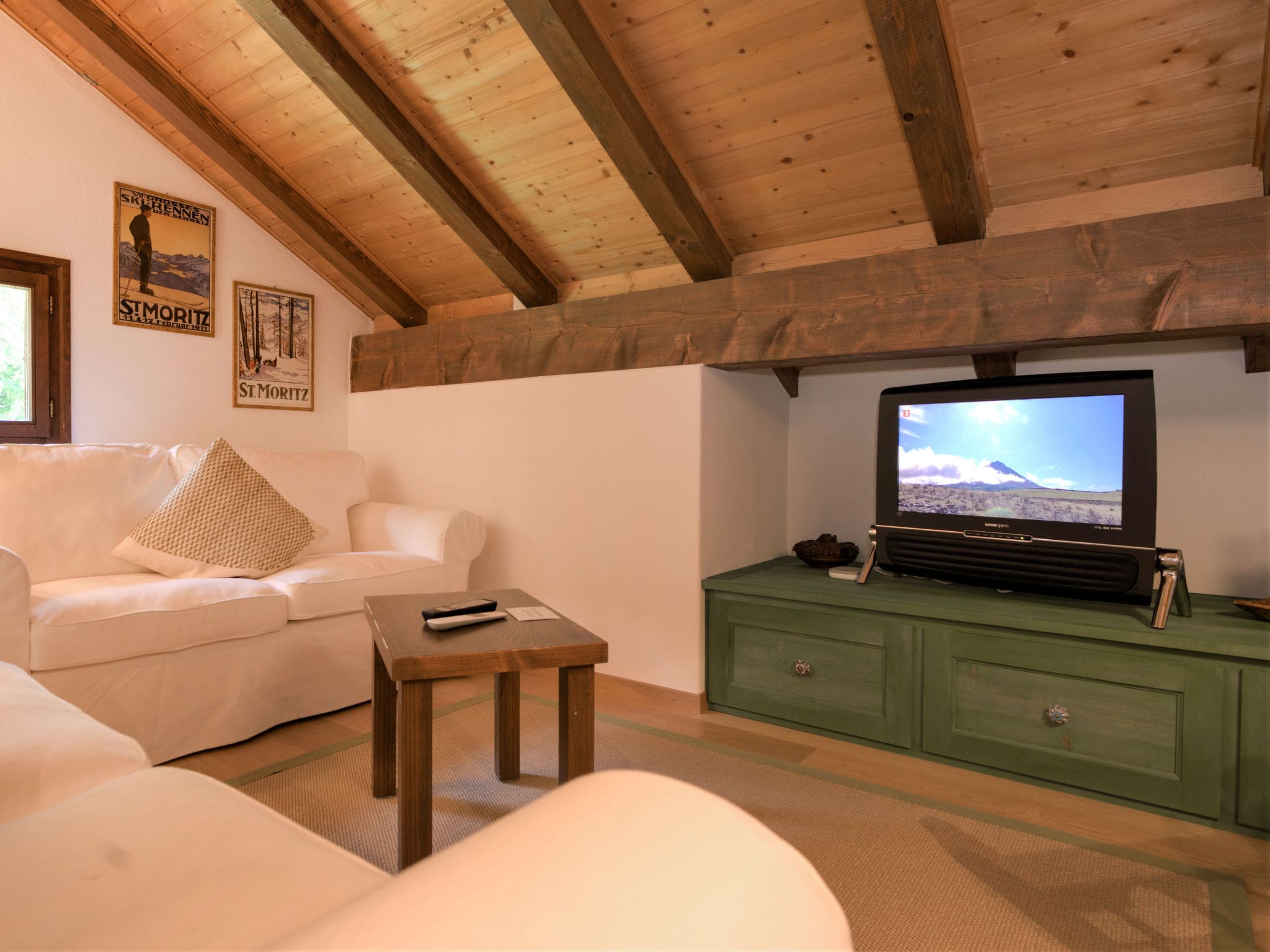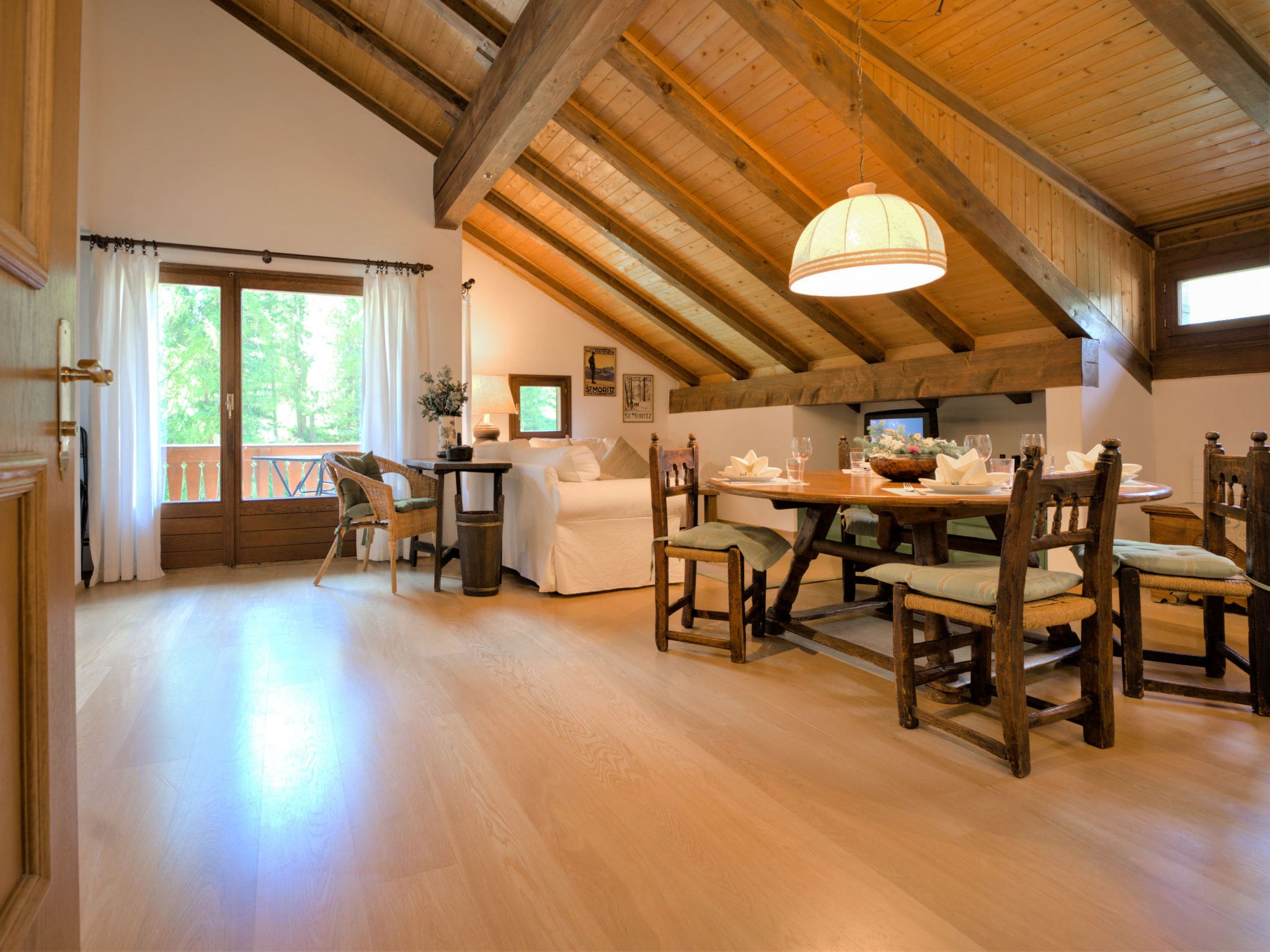 Spread across 100 square metres on the second floor of the distinctive Chesa Seglias building, this thoughtfully designed apartment showcases the best of Alpine living. The open-plan living and dining area forms the heart of the home, featuring a traditional open-hearth fireplace that creates a cosy atmosphere after days spent exploring the mountains. French doors lead to a charming balcony where guests can enjoy their morning coffee while taking in the breathtaking mountain and countryside views.