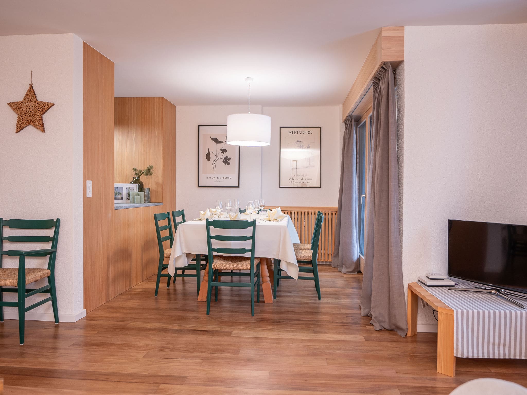 The apartment showcases contemporary alpine design with traditional Swiss touches throughout its thoughtfully arranged spaces. The open-plan living and dining area features a captivating open-hearth fireplace, creating the perfect gathering spot after days spent on the mountain. Modern amenities include a fully equipped kitchen with induction hob, dishwasher, Nespresso coffee machine, and all essential appliances for comfortable self-catering.