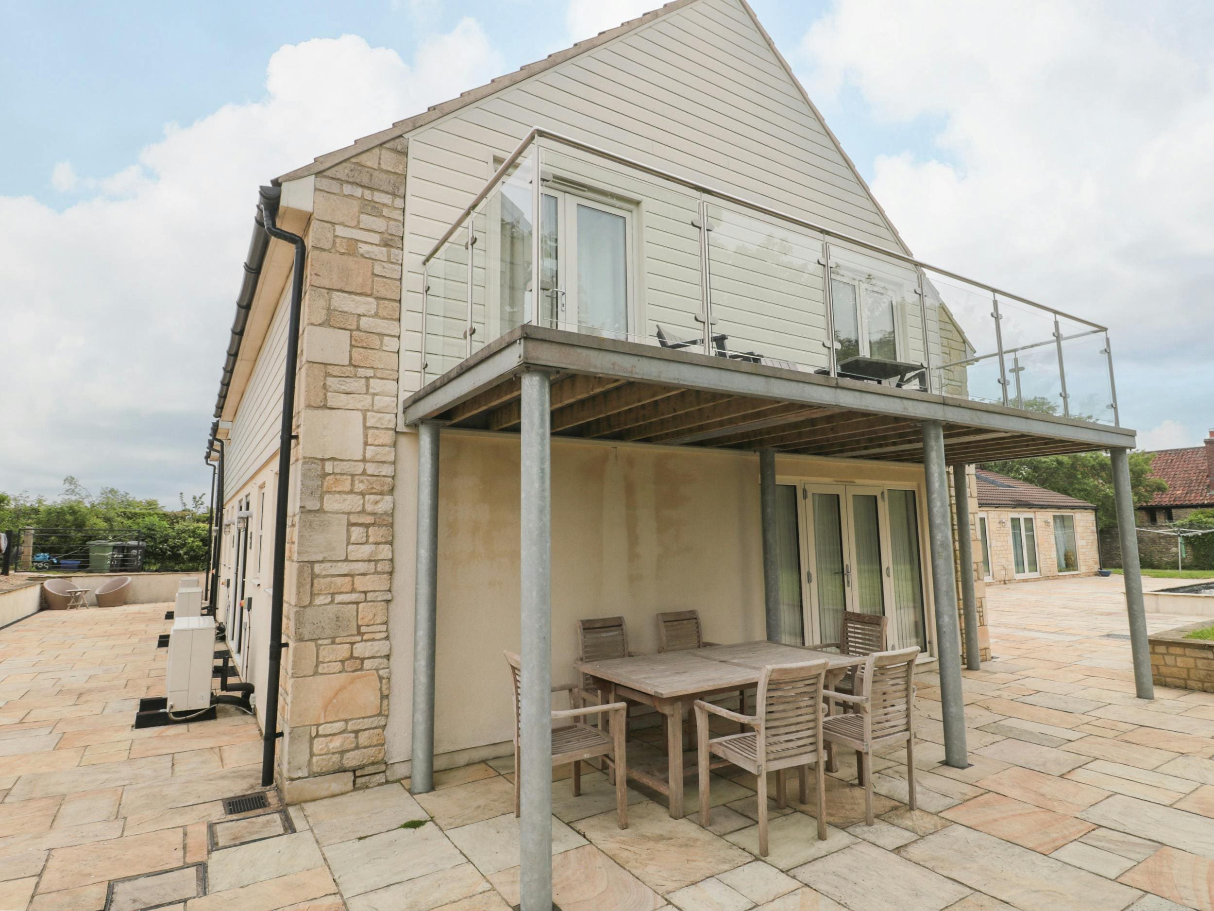 The outdoor spaces of this Somerset house are as inviting as the interiors. Enjoy your morning coffee on the private balcony while taking in the views of the neighboring horses. Although the garden and lawn are shared with two other homes on the estate, the patio and balcony offer private outdoor spaces for dining and relaxation. The picturesque Mendip Hills, a short drive away, provide a stunning backdrop and numerous opportunities for hiking and exploring.