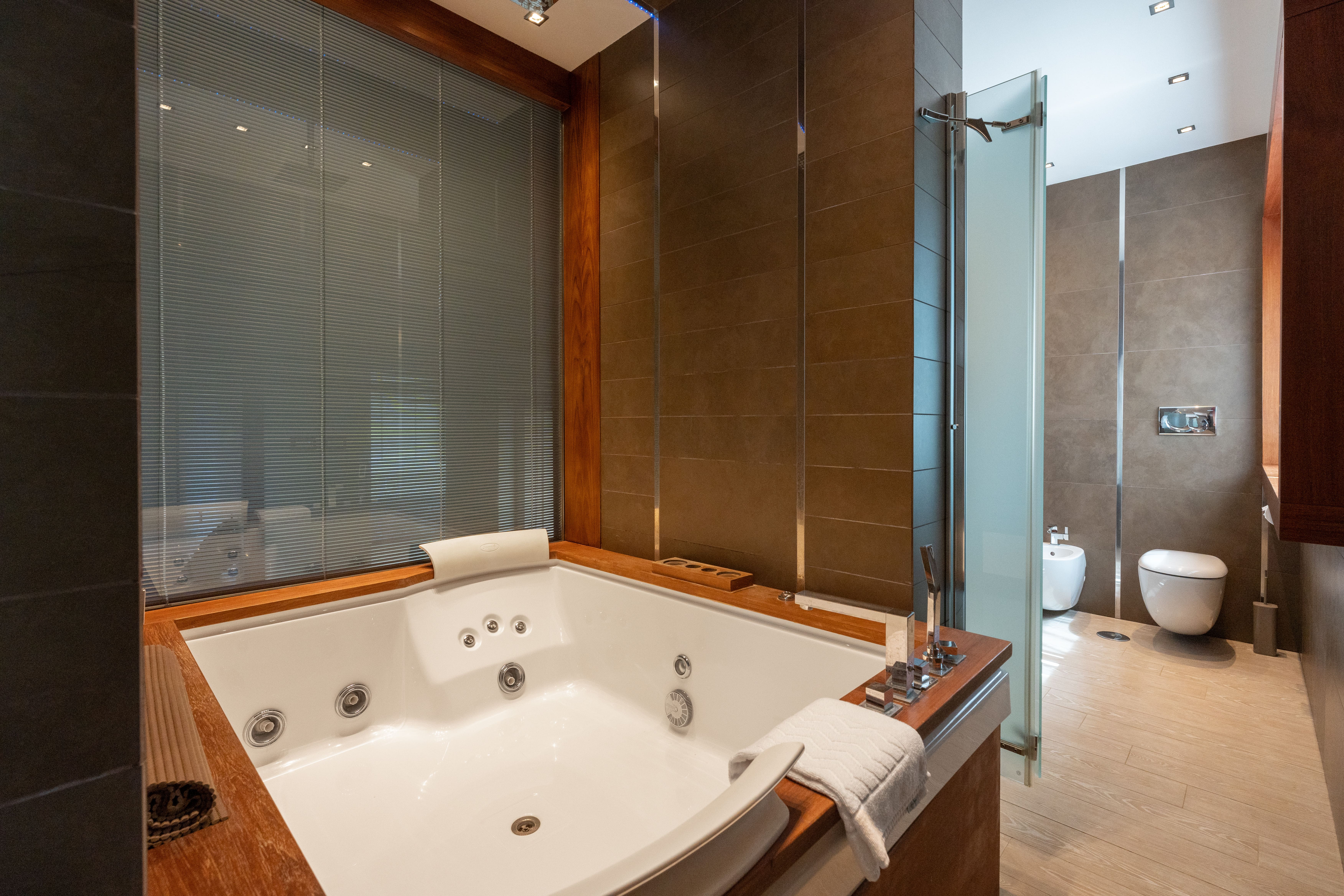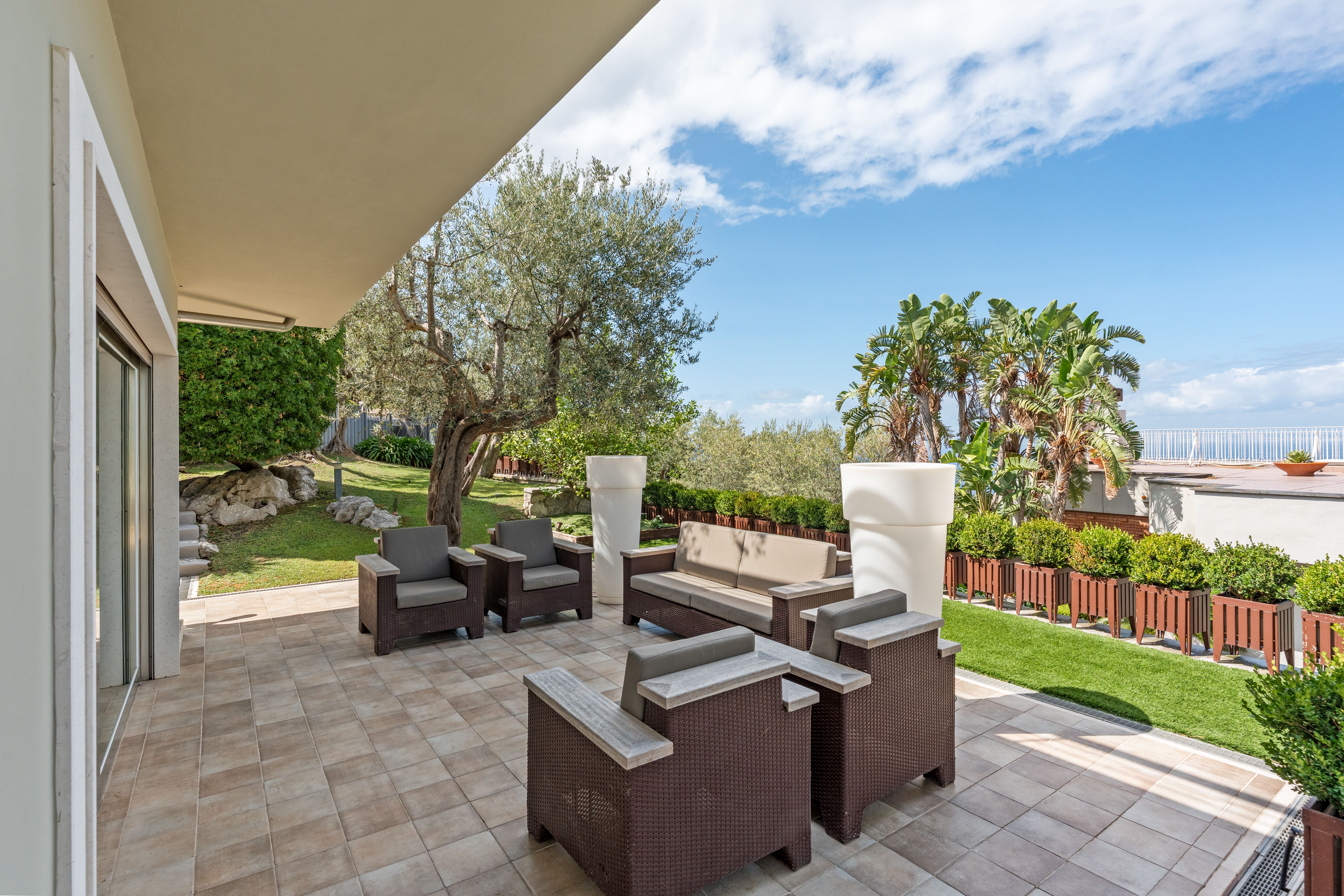 Step outside to an oasis of tranquility, where the infinity pool overlooks the azure waters of the Bay of Naples. The expansive terrace offers a perfect setting for alfresco dining, while the hot tub provides a luxurious spot to unwind. Surrounded by olive trees and beautifully landscaped gardens, this villa serves as a private haven, ideal for soaking up the Mediterranean sun.