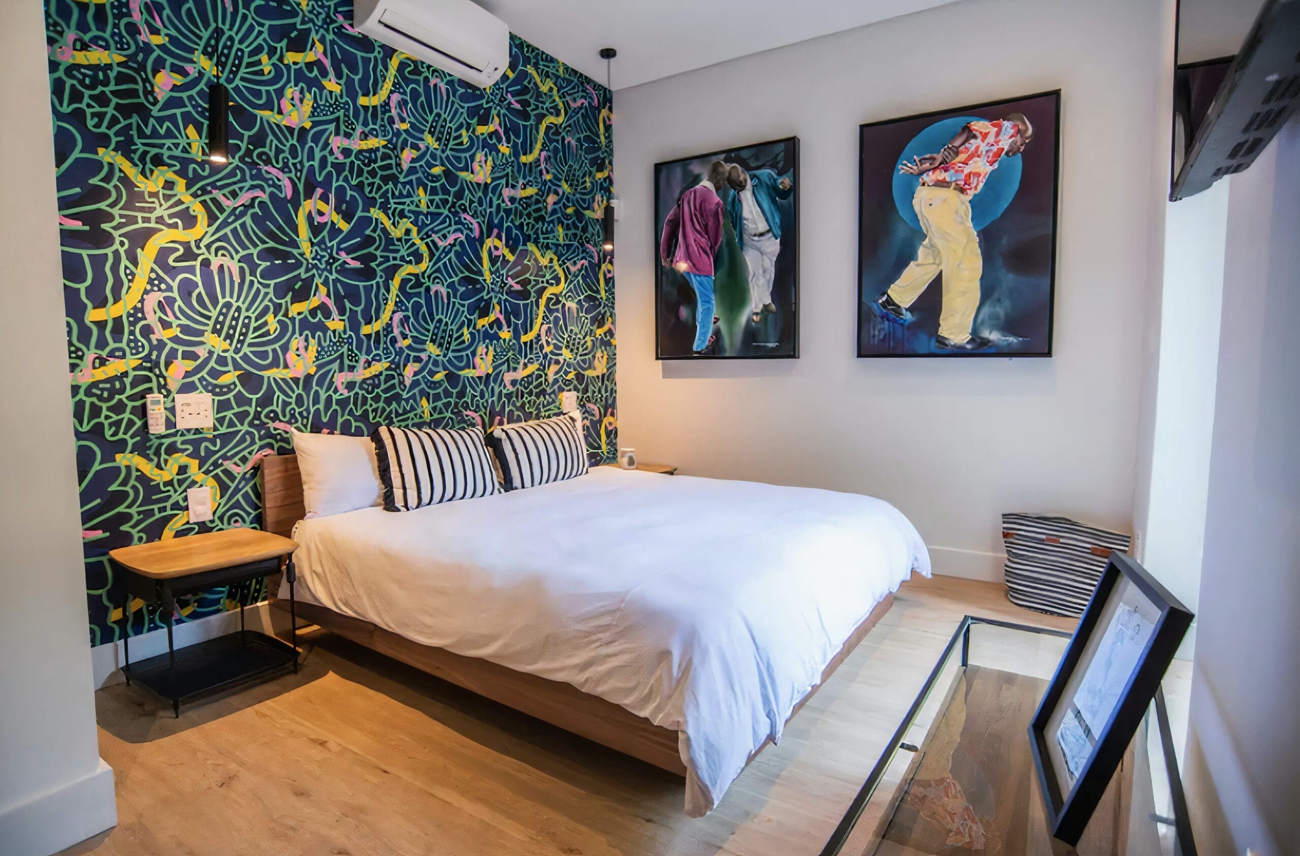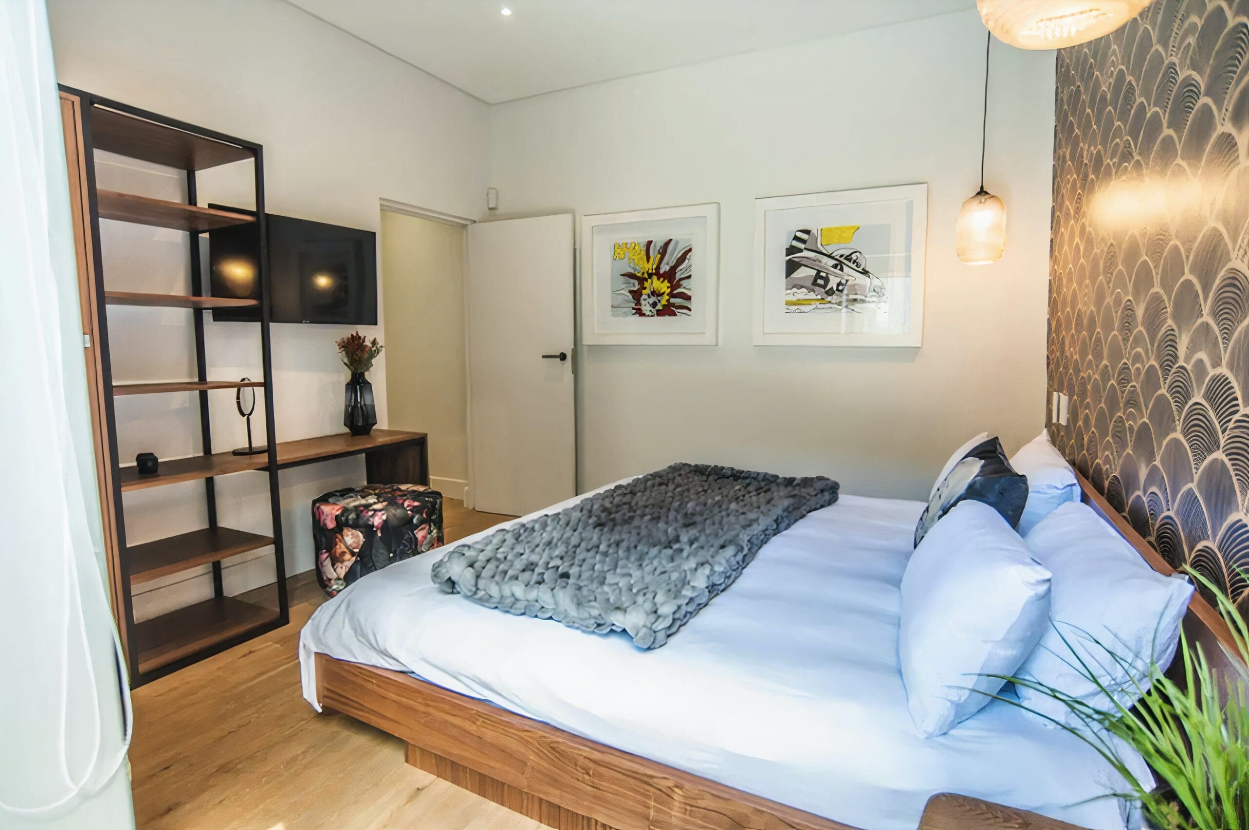 Back at home, it’s modern and chic, with colourful artwork from the Johannesburg-based August House Studio adorning the living area and bedroom walls. Natural light pours in throughout the apartment, with direct access onto the terrace from the bedroom and communal areas, so you can stagger out of bed with your morning coffee as you hatch out the plans for the day.
