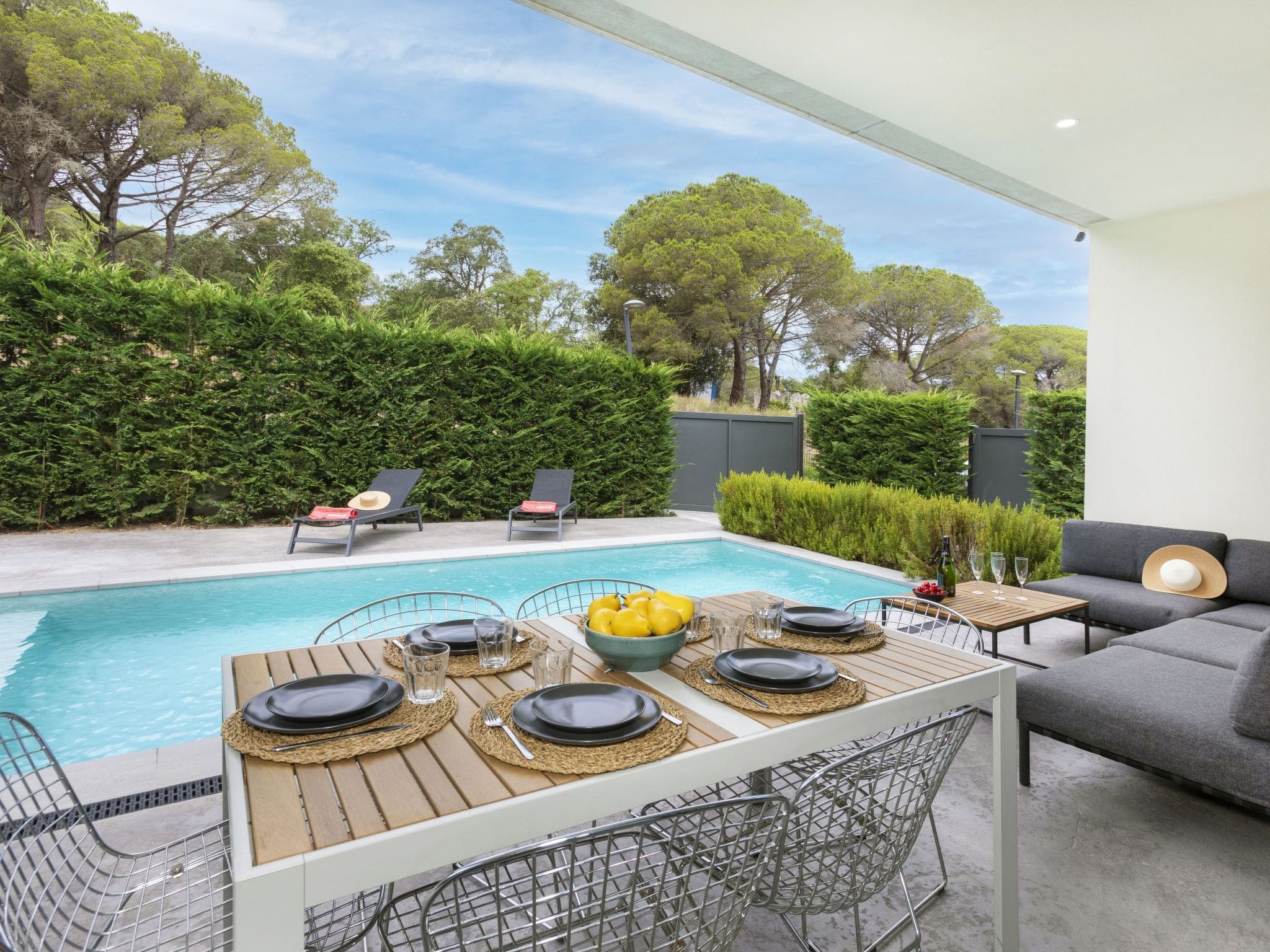 The rental includes all furnishings, bed linens, towels, fully equipped kitchen, WiFi, air conditioning, private pool access, garden use, and parking. Pool towels and final cleaning are typically included in the rental rate.