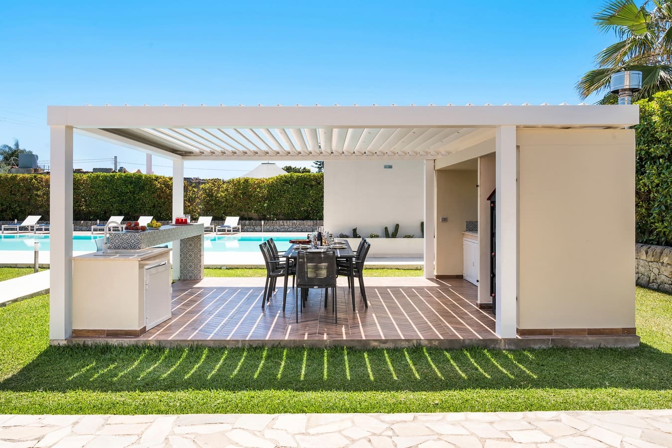 The villa’s outdoor areas are a true highlight, offering a private saltwater swimming pool with a hydro-massage corner for ultimate relaxation. Enjoy al fresco dining under the shaded pergola or savor a barbecue with family and friends in the designated outdoor dining area. The lush garden, filled with local flora, provides a tranquil backdrop for leisurely afternoons spent basking in the Sicilian sun.