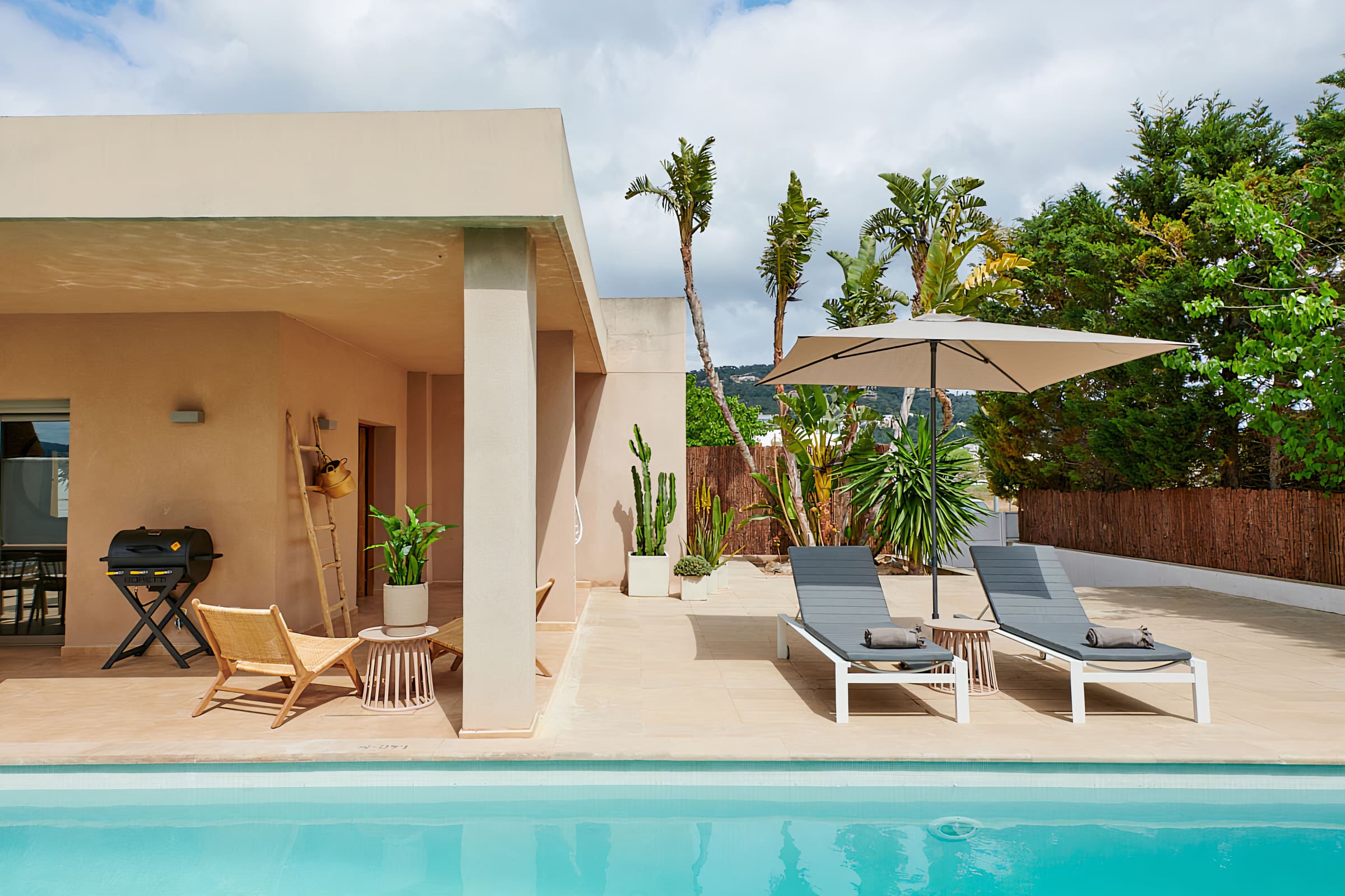 Step outside to discover a private paradise in the heart of Talamanca. The villa’s centerpiece is a beautiful swimming pool surrounded by lush greenery, providing a tranquil spot for sunbathing or swimming. Shaded sun loungers offer the perfect place to relax and soak in the ambiance. The expansive terrace is ideal for alfresco dining or sunset cocktails, offering breathtaking views of the Ibiza landscape.