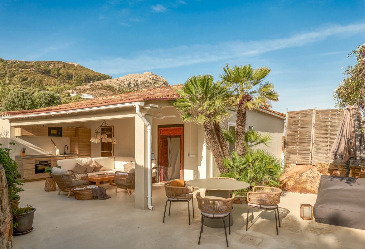 Extending from the villa, the garden is enclosed with palms and olive trees and surrounded by a fence to create a completely private setting. From the concrete terrace, a grassy lawn leads down to the far end, where there is a yurt, perfect for spending some time in the shade or practising yoga. A charming dark wood sauna is tucked into one corner, whilst to the other side is the wonderful outdoor pool inviting you to take a refreshing dip and cool off from the heat of the sun. Slightly raised from the level of the grass, the pool is framed by timber decking, where you will find generously sized sun loungers welcoming you to recline beneath the clear blue skies or rest in the shade under the umbrella.