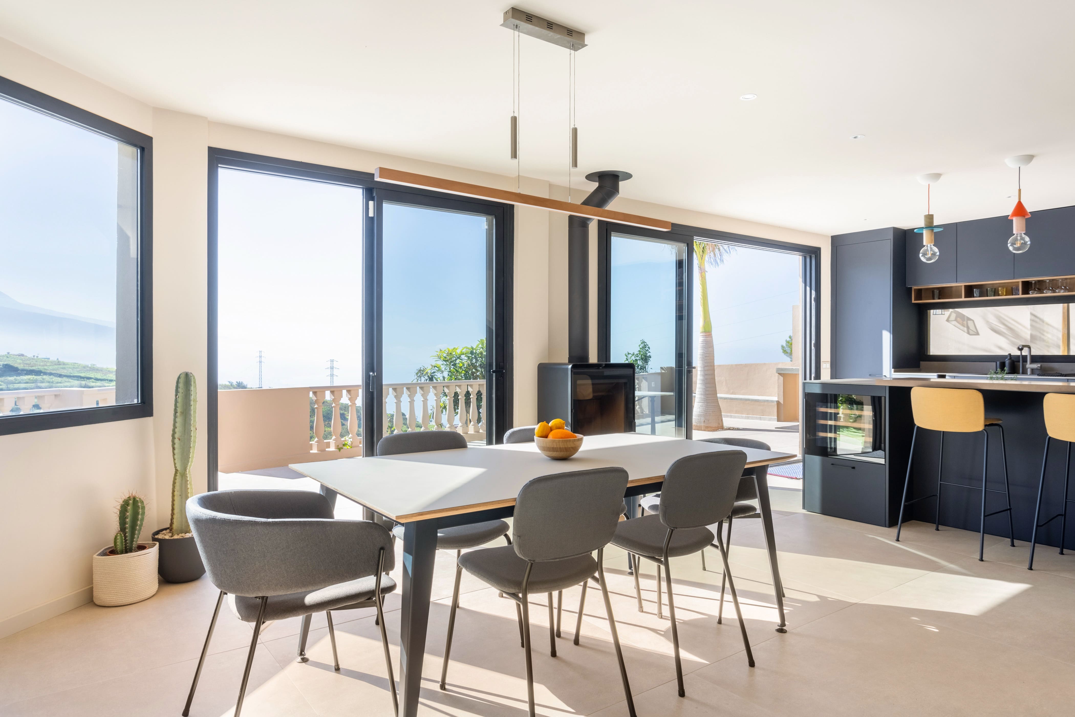 The villa’s outdoor spaces are designed for leisure and enjoyment. Multiple tiered terraces provide stunning views of the sea and Mount Teide, perfect for sunbathing or stargazing. An inviting hammock and outdoor dining area enhance the experience, making it ideal for enjoying Tenerife’s pleasant climate.