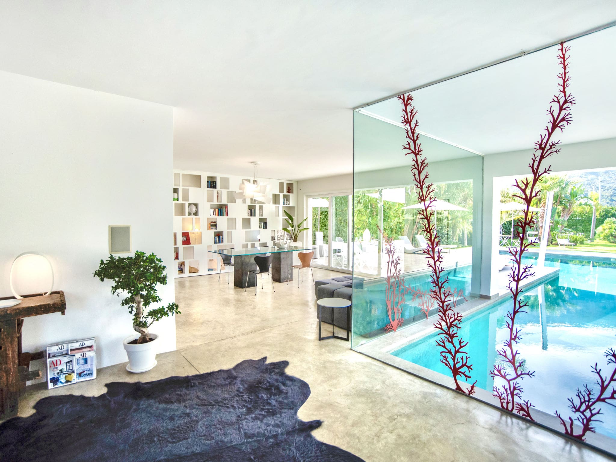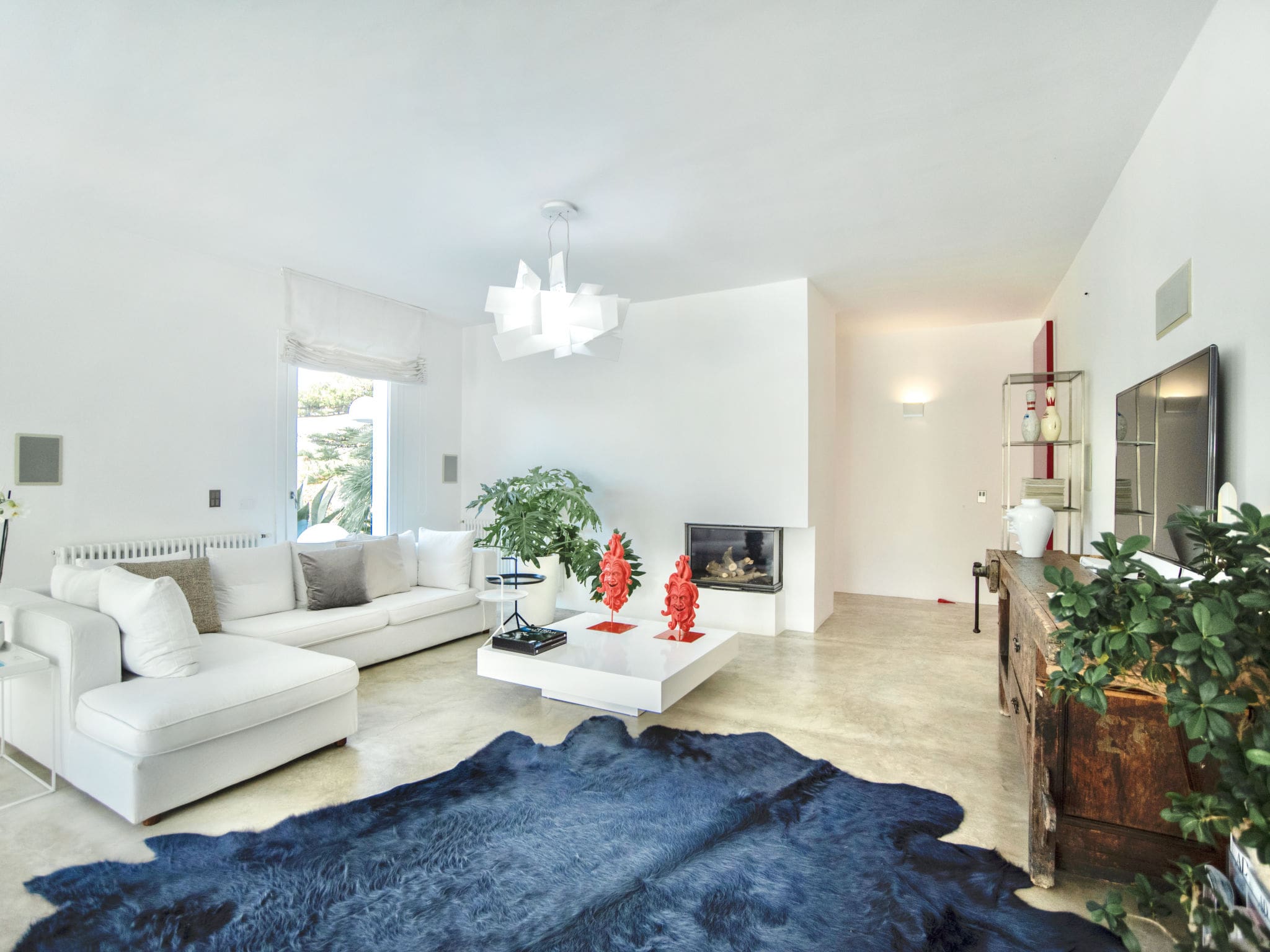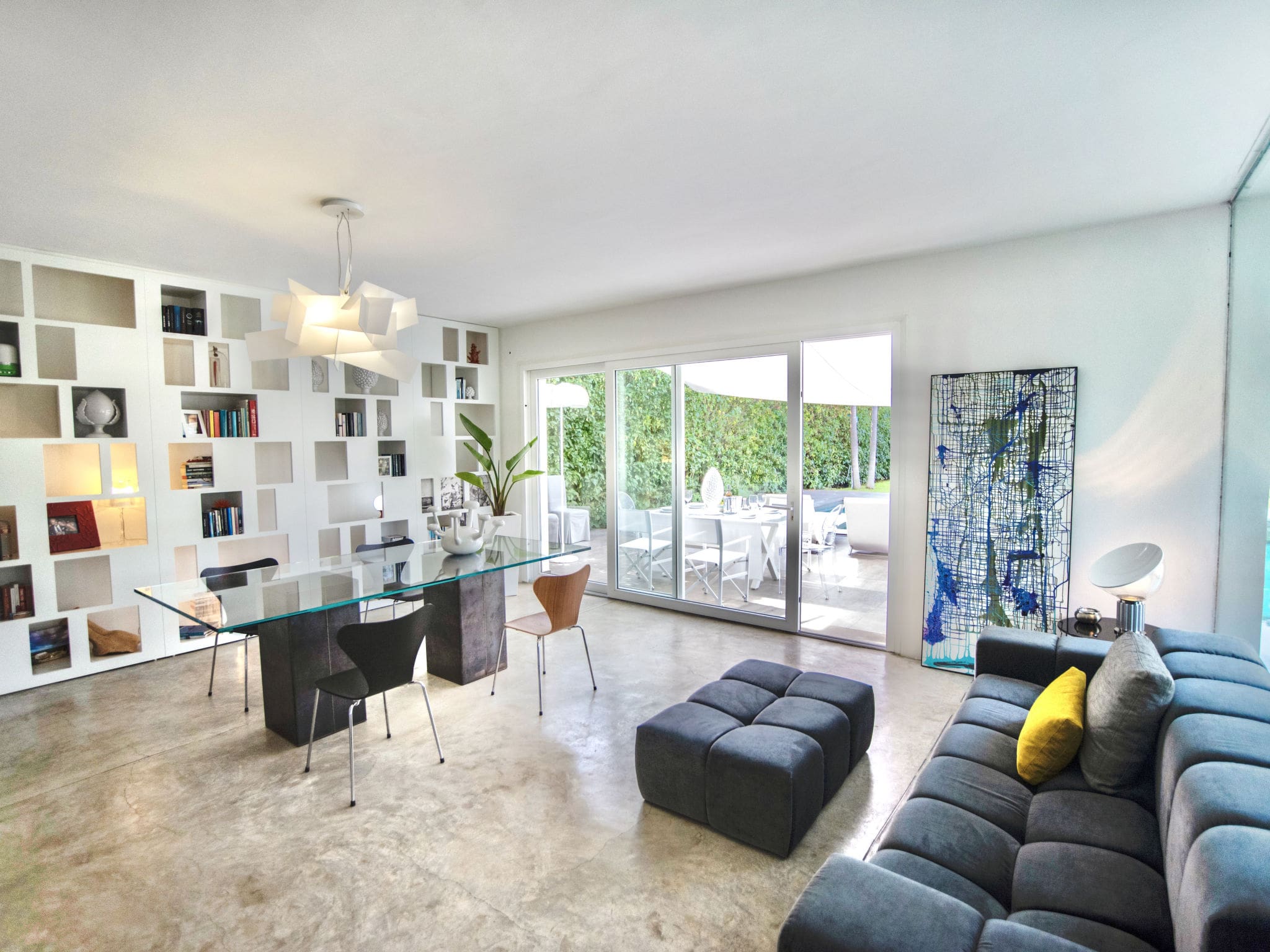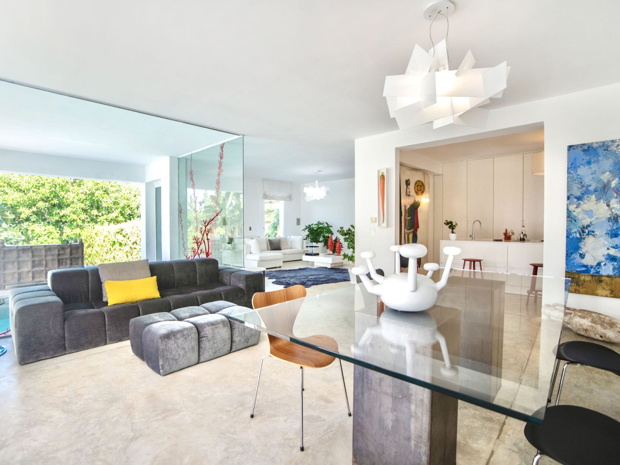 The 220 square meter villa presents a thoughtfully designed single-level layout that maximizes both comfort and connection to the outdoors. The spacious living room, anchored by panoramic windows, opens seamlessly to the garden, patio, and pool area, creating an effortless indoor-outdoor flow. Modern furnishings complement the villa’s clean lines, while satellite television and air conditioning ensure contemporary convenience.