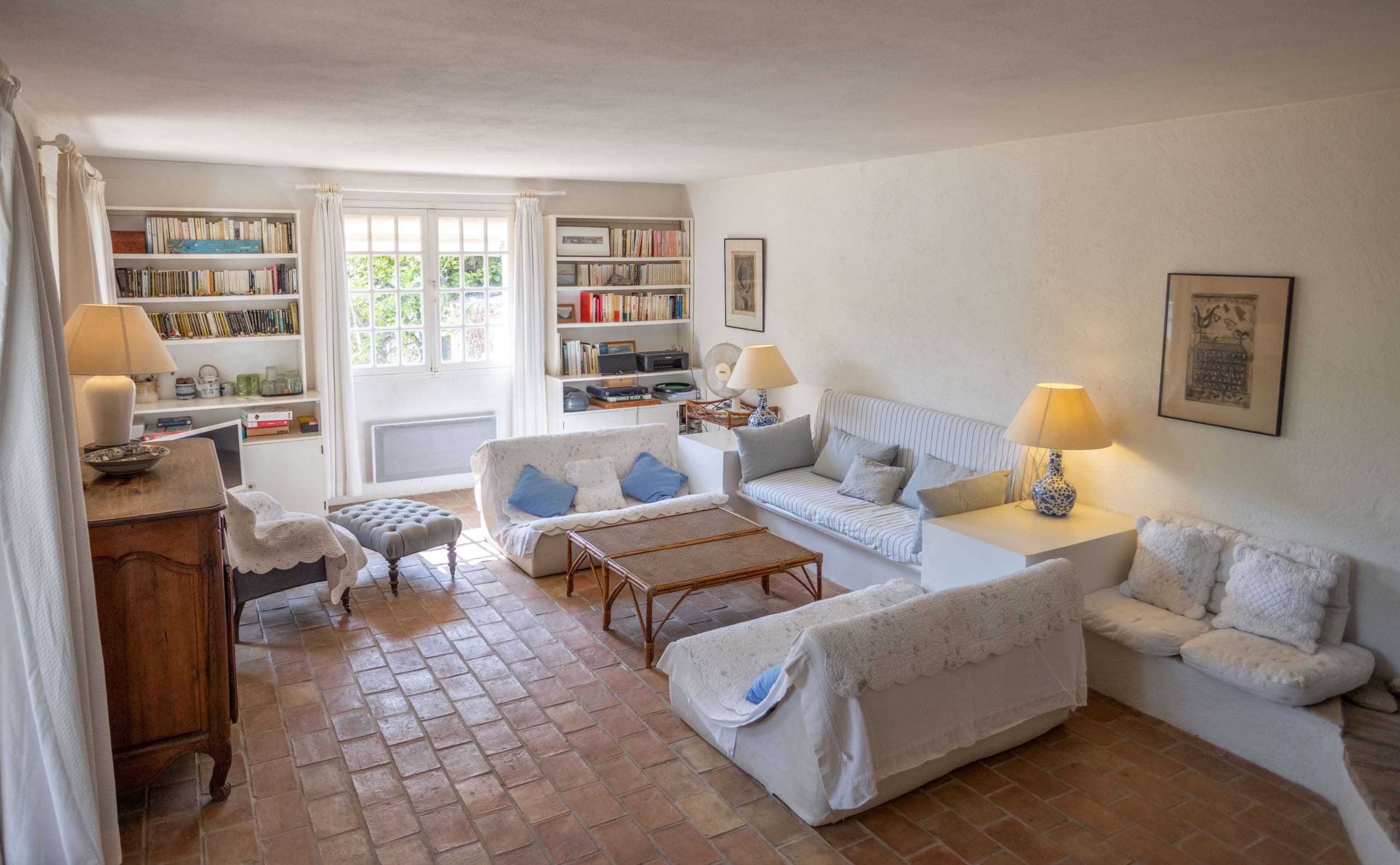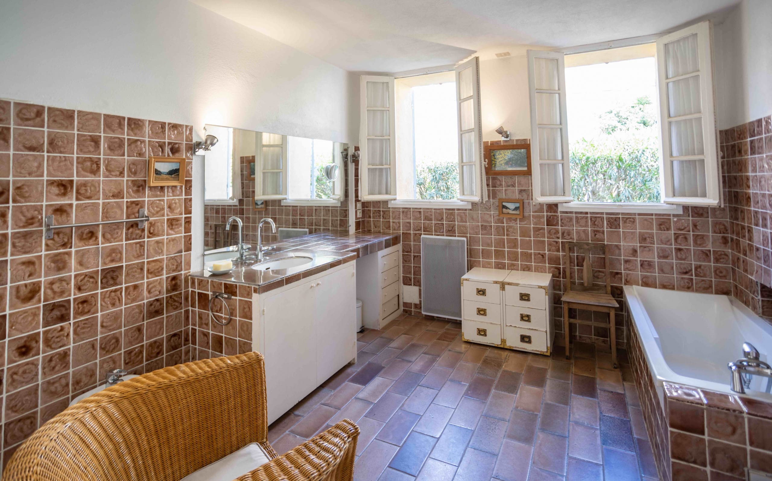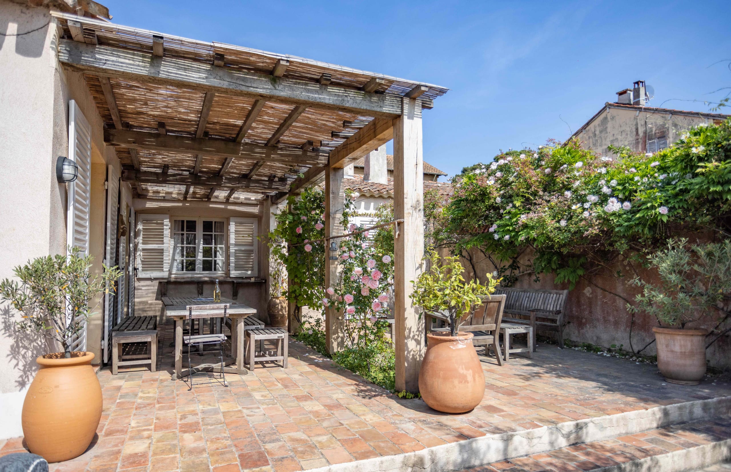 With three bedrooms and two bathrooms, this apartment comfortably sleeps six. The main bedroom on the ground floor includes an en-suite with a separate toilet. Pets are welcome upon request, and a desk in the main bedroom allows for work during your stay. Browse our luxury villa rentals in France for more properties.